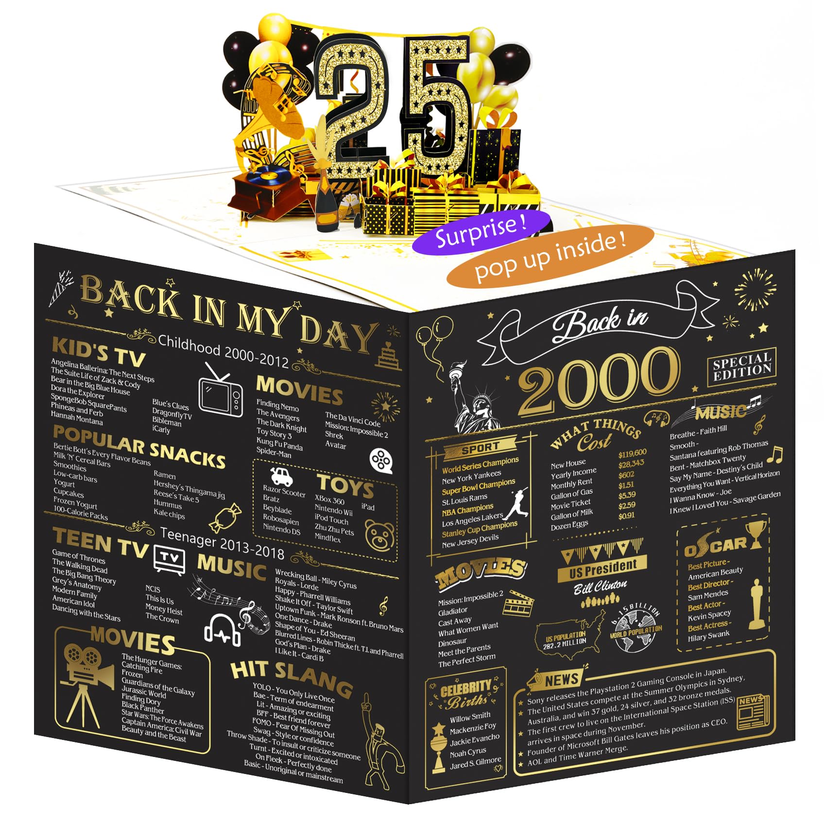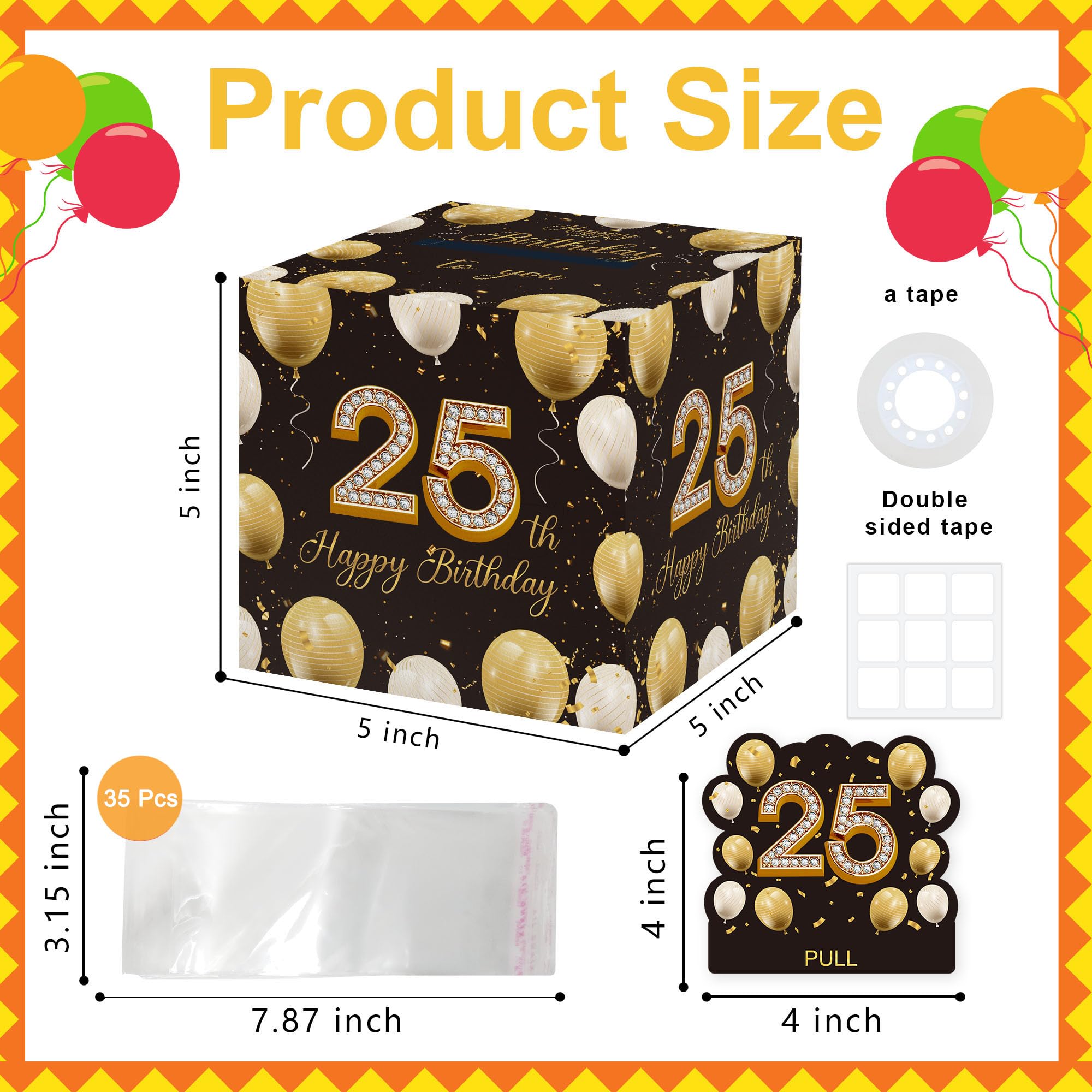 Surprise Gift Box: this gift box measures 5x5 inches, is made of durable cardboard. It also includes 2 theme-related shaped card(with adhere glue dots), 1 roll of transparent tape and 35 plastic pouches similar to the size of U.S. currency for easy placement of bills.