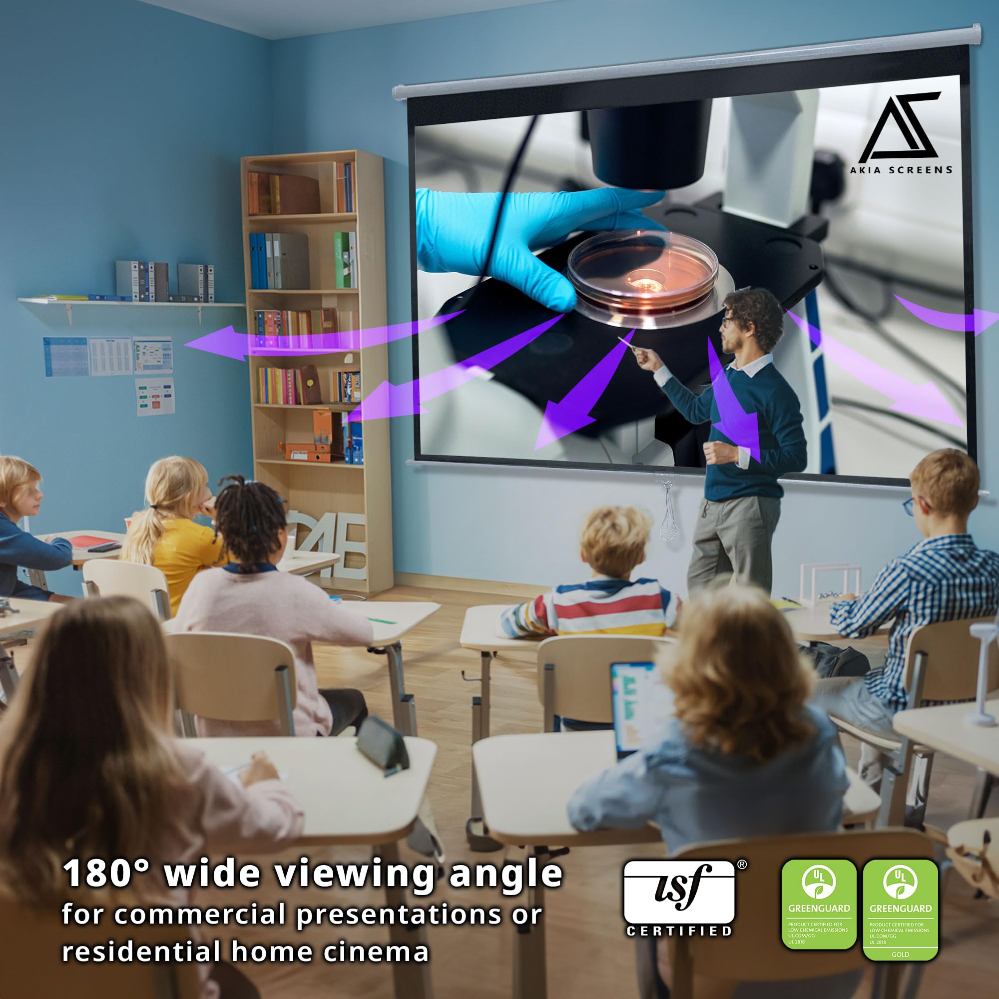 GREENGUARD GOLD CERTIFIED MATERIAL: GREENGUARD and GREENGUARD Gold UL 2818 certified for low chemical emissions and improved indoor air quality. Designed as an indoor pull-down projector screen for residential and professional environments using standard HD and UHD projectors. Recommended for standard (long-throw) projectors. Not compatible with ultra short throw projectors.