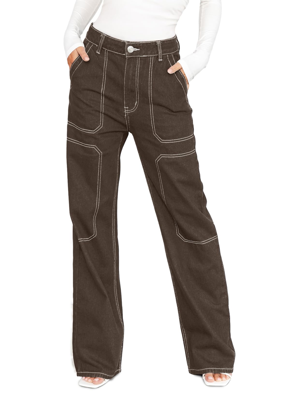 Feature: cargo jeans, mid waist, straight-leg jeans, button and zipper fly closure, straight wide leg style, four pockets, denim jeans for women.