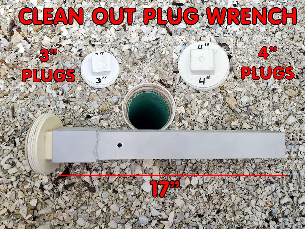 Clean out plug wrench and sewer cap removal tool for larger 3" and 4" threaded PVC sewer plugs. Wrench size is determined by overall diameter of round threaded plug, not diameter of square bolt. See pictures for better size detail. Also available is our sewer cap removal tool for 1.5" to 2" plug squares used by swiomming pool service techs. Designed for PVC plugs not recommended for brass plugs. Length is 21" long. Made of corrosion resistant 6063 marine grade aluminum.Patented design. Used by plumbers and home inspectors to remove sewer caps for access to the underground sewer line.