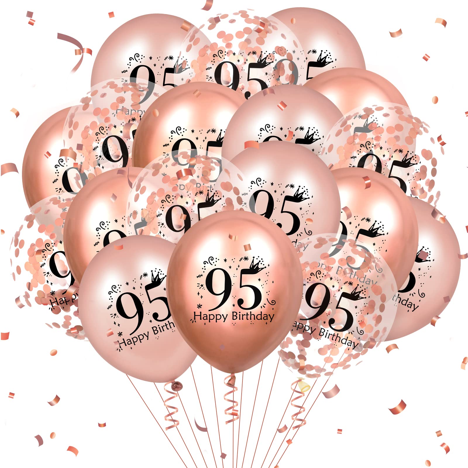 Rose Gold Confetti Balloons: Includes 18 latex balloons with 6 metallic rose gold, 6 matt rose gold, and 6 rose gold confetti balloons for 95th birthday party decoration.
