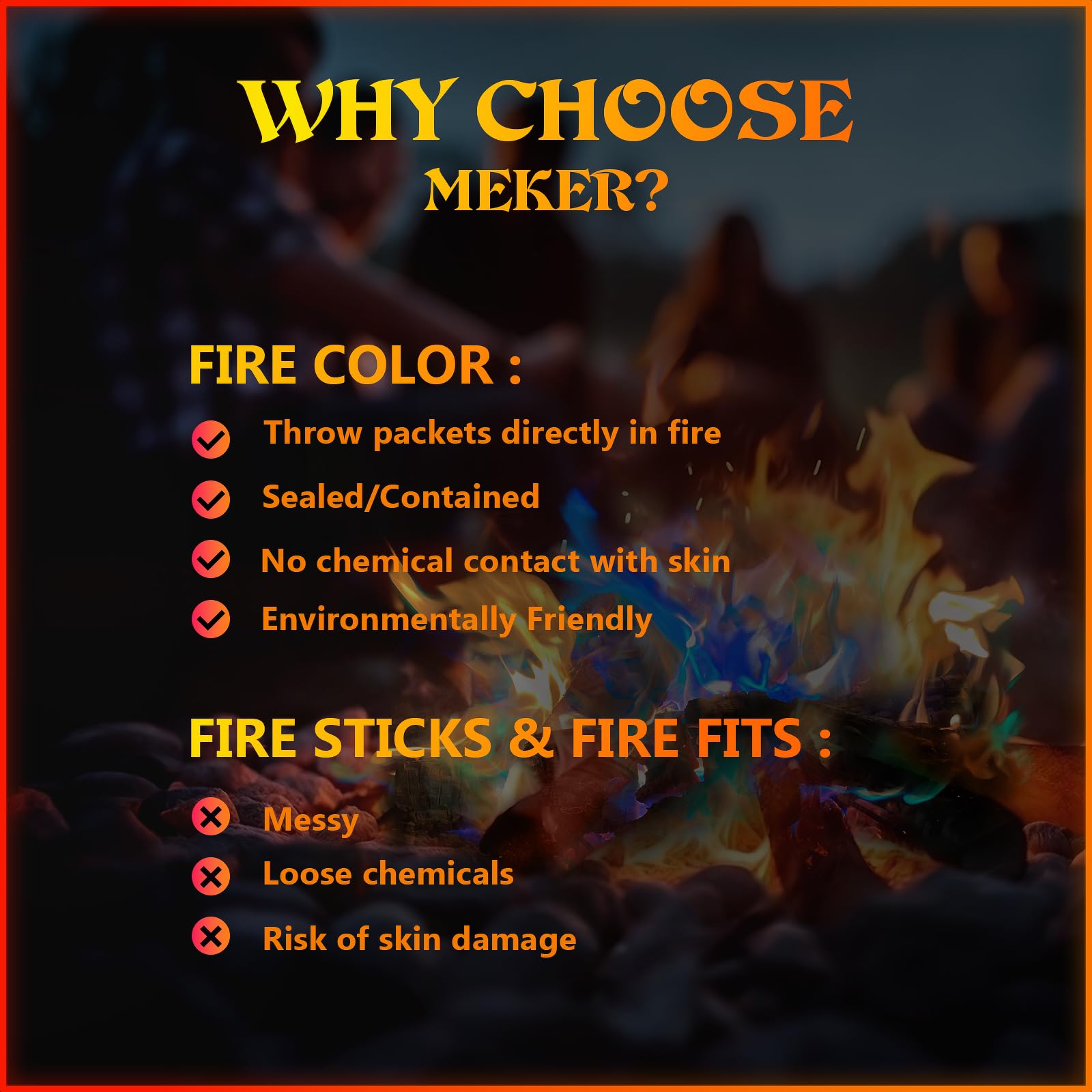 Why Choose MEKER? – 1) Throw packets directly into fire 2) Sealed/Contained 3) No chemical contact with skin 4) Provides a safe and controlled way to enjoy a fire in your backyard 5) Last twice as long as other brands!