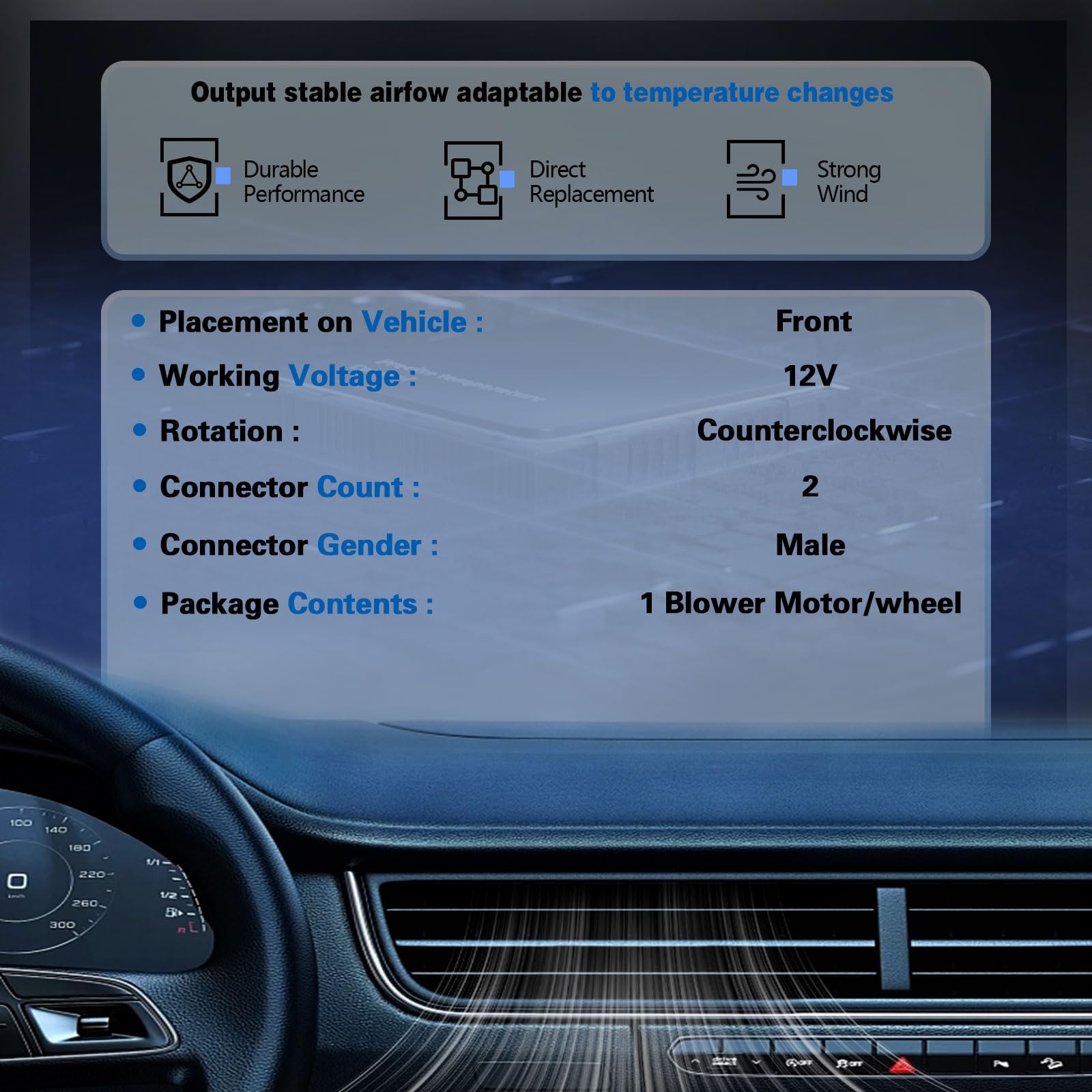 【Premium Quality】This air conditioner blower motor is made from motor-specific silicon steel and premium enameled copper wire and is manufactured to OE specifications for direct installation without modification. Designed to keep your vehicle's HVAC system in top shape