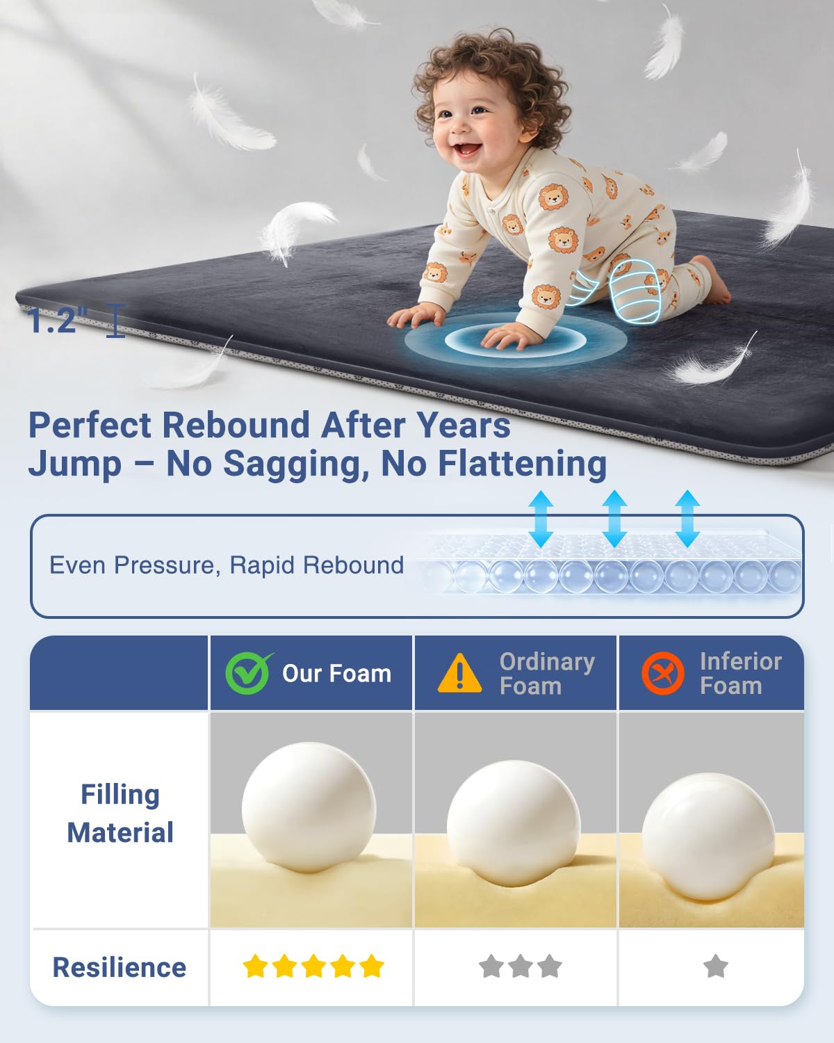 Thickened Foam Play Mat: Our premium foam mat is made of 1.2 inches thickened memory foam.It's sturdy enough to support two adults without ground feeling. The surface is made of ultra-soft flannel fabric, luxurious and comfortable for babies and family time.It does not fade.It provides a soft and safe play space, making it an ideal play mat for babies 6-12 months, encouraging them to explore endless fun with confidence.