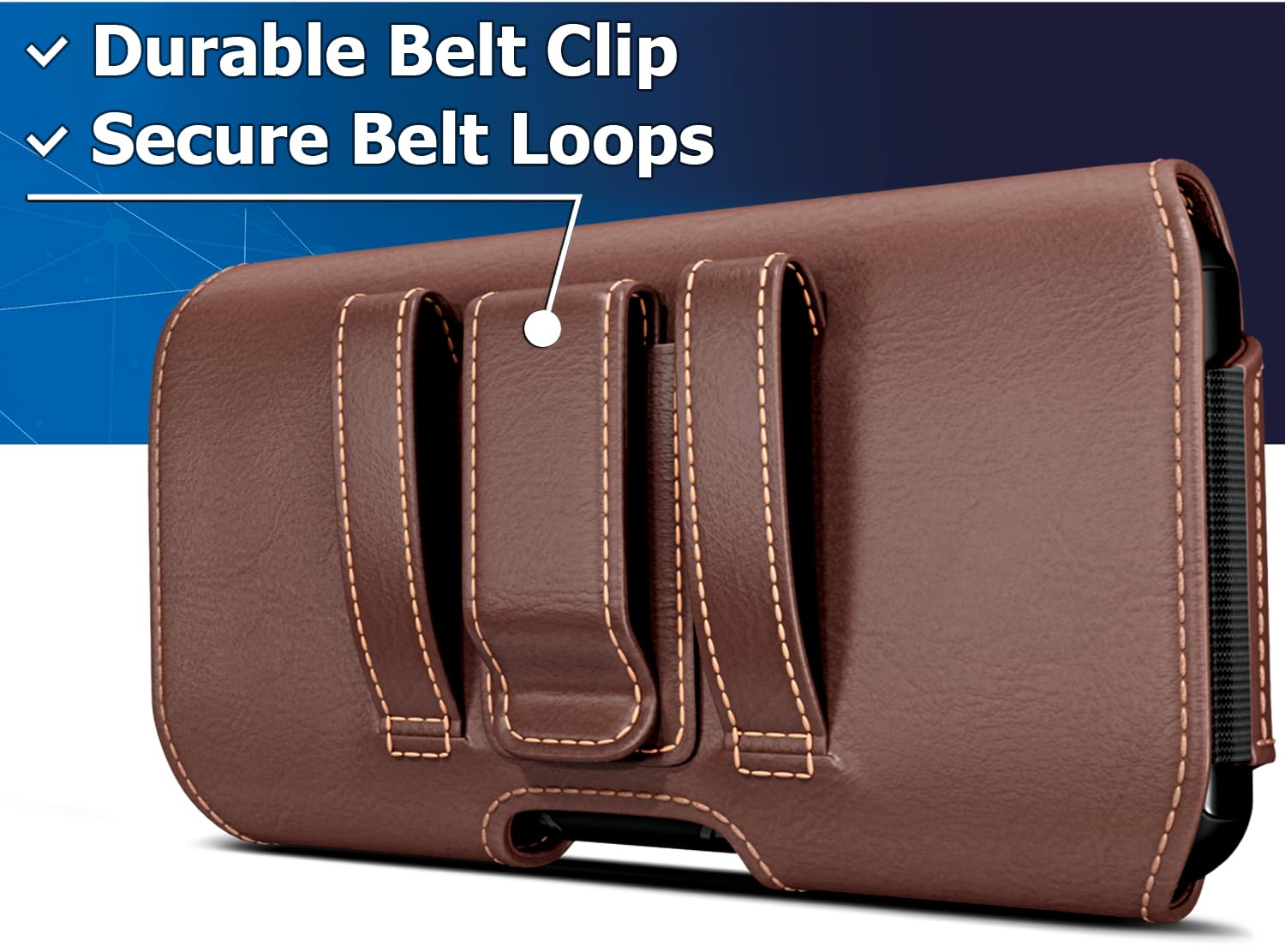 Classic, durable metal belt clip wrapped in leather, featuring two secure belt loops to ensure your phone is safely carried on your belt.