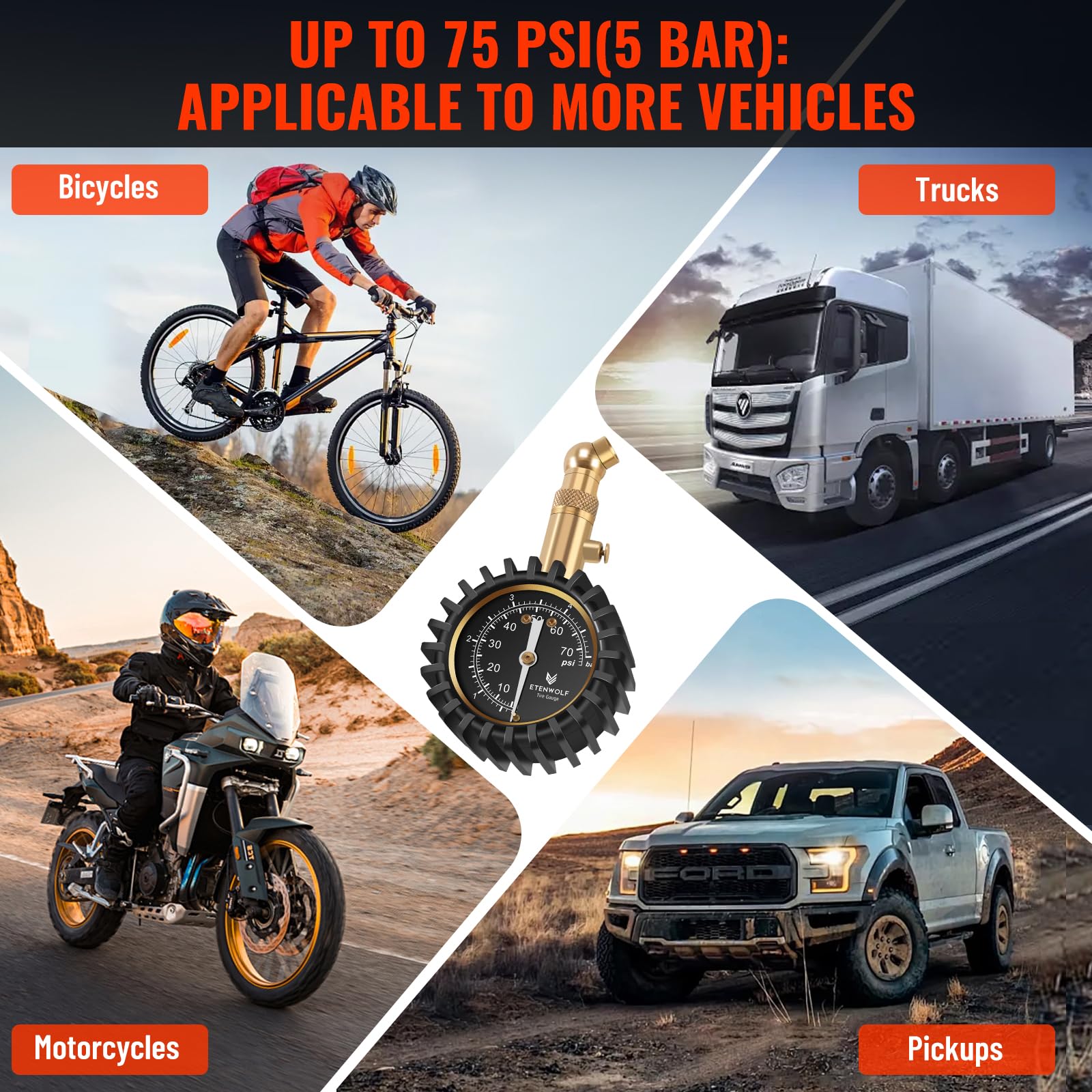 PRESSURE RANGE 0-75 PSI: ETENWOLFβs tire gauge can measure pressure of pickup, motorcycle, truck, bike, SUV, RV or ATV