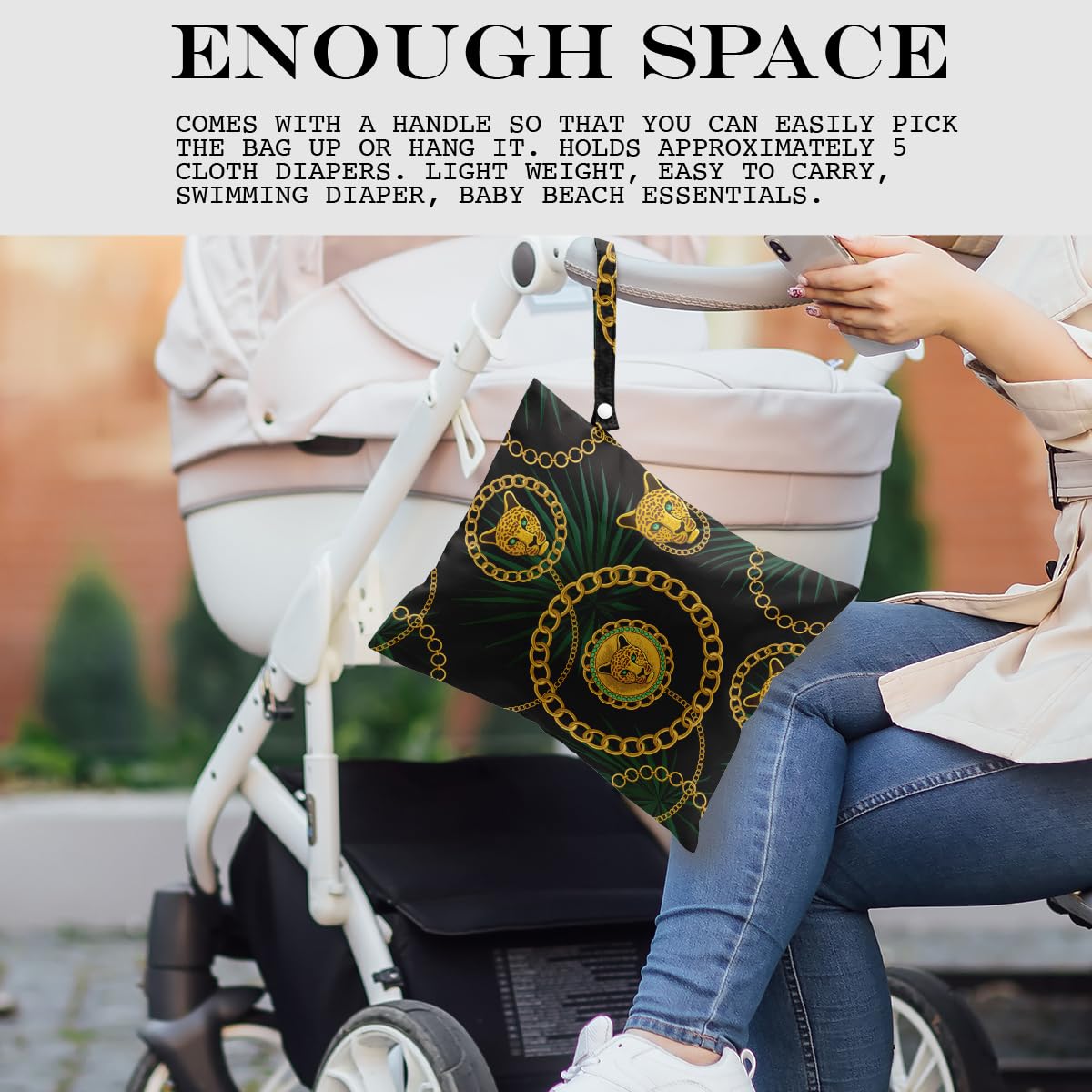 ENOUGH SPACE - 26cm x 32cm (approx.: 12.5” x 10.2”). Comes with a handle so that you can easily pick the bag up or hang it. Holds approximately 5 cloth diapers. Light weight, easy to carry, swimming diaper, beach essentials.