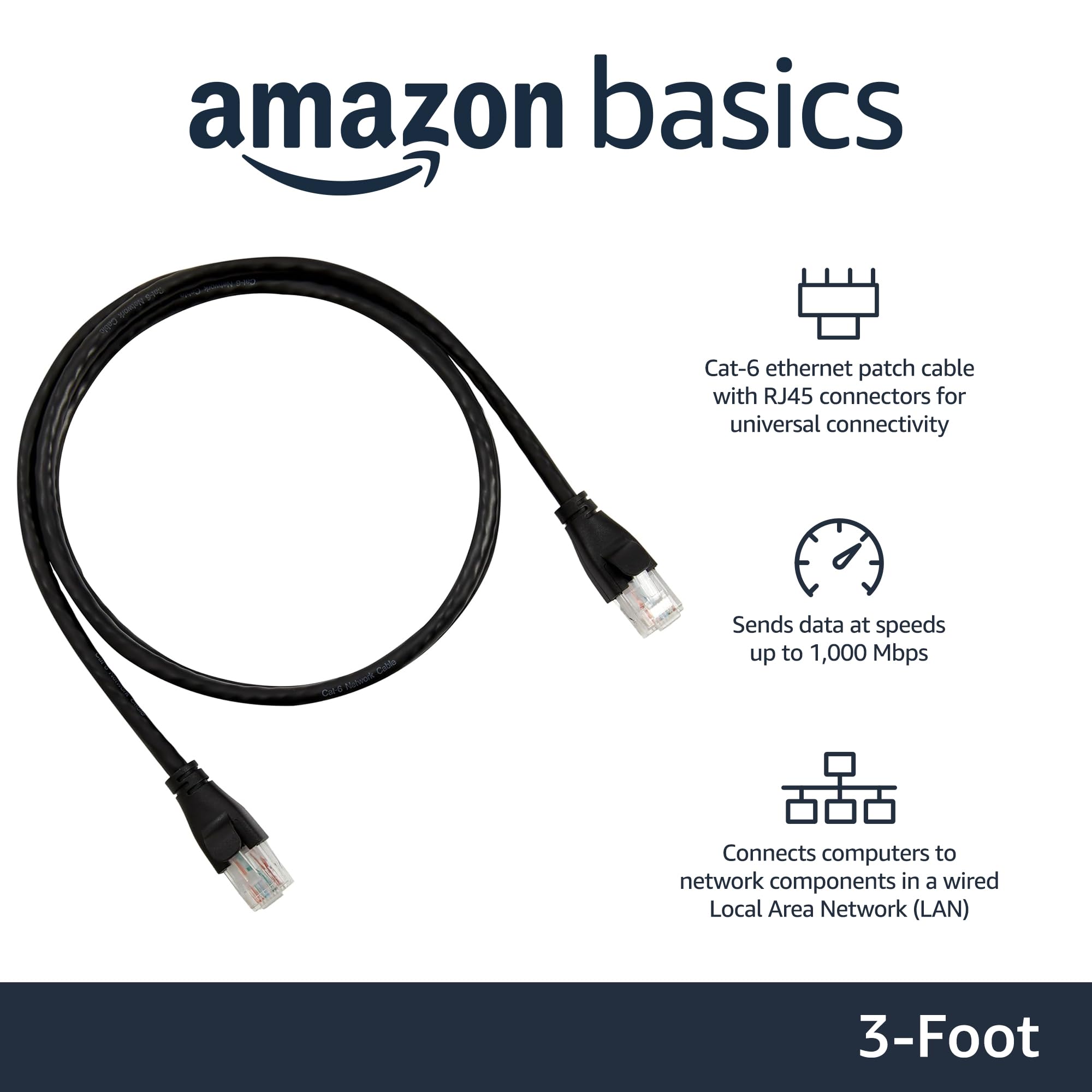 Product Description Amazon Basics RJ45 Cat-6 Ethernet Patch Internet Cable - 3 Foot (0.9 Meters) From the Manufacturer AmazonBasics