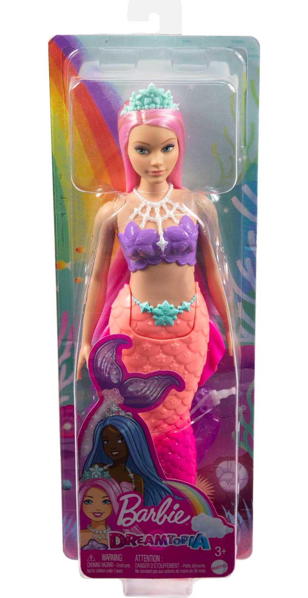 Make a storytelling splash with mermaid dolls from Barbie Dreamtopia! This Barbie mermaid doll inspires royal adventures and under-the-sea storytelling with a rainbow-bright look, seashell-inspired bodice and multi-colored ombre tail. Pink fantasy hair and a royal tiara complete her sea-inspired look. Bend Barbie mermaid doll at the waist to "swim" in the sea or sit and shimmer in the sun! With vibrant looks and fantastical details, Barbie Dreamtopia mermaid dolls inspire endless fairytale storytelling for kids ages 3 years old and up. Each doll sold separately, subject to availability. Doll cannot swim or stand alone. Colors and decorations may vary.