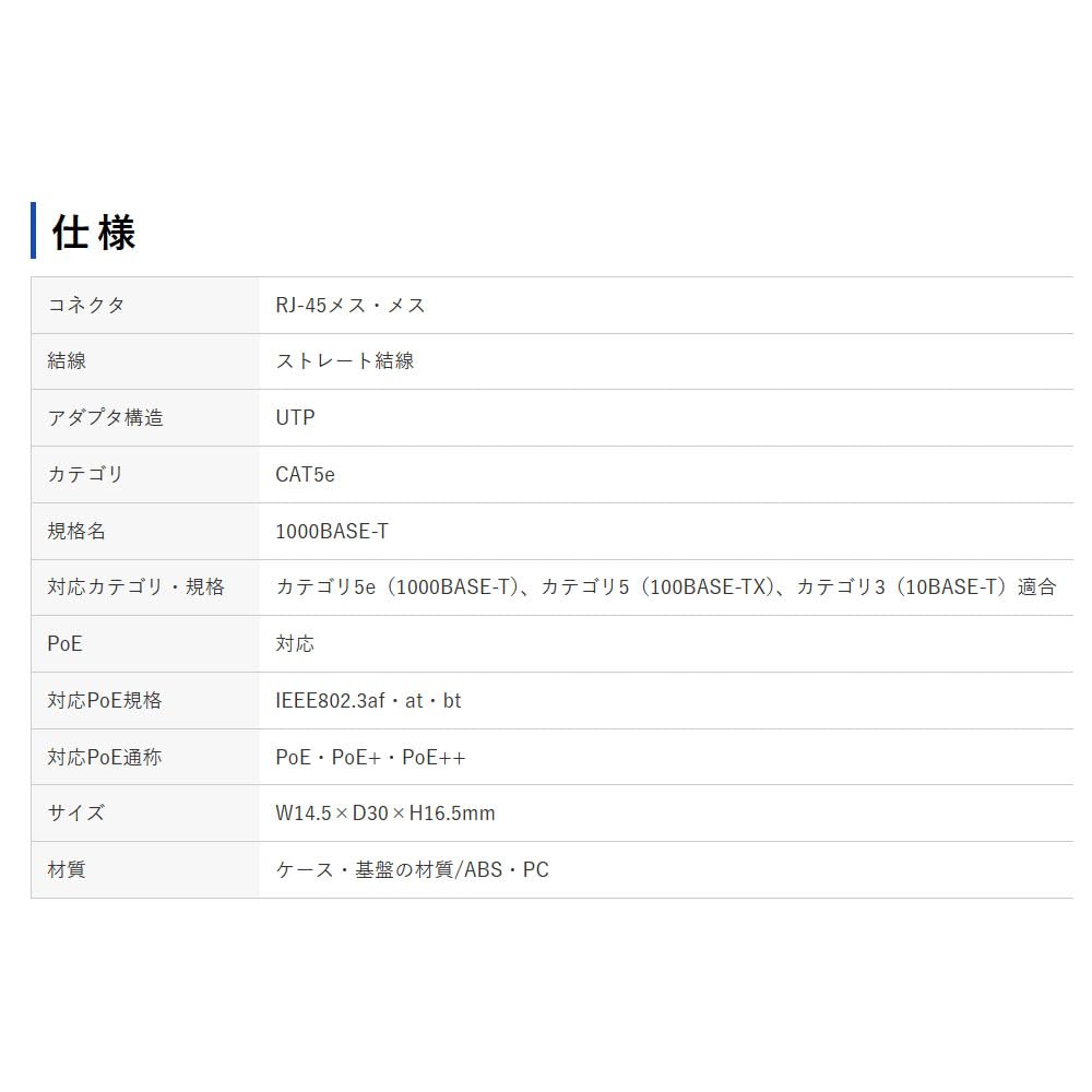 Features: Relay adapter (coupler) for RJ-45 connectors compatible with Gigabit. Specifications: ■Connector: RJ-45 female ■Wiring: Straight full wire ■Supported transmission bands: Enhanced Category 5 (1000BASE-T, 100BASE-TX, 10BASE-T) compliant ■ Size: W14.5 x D30 x H16.5 mm
