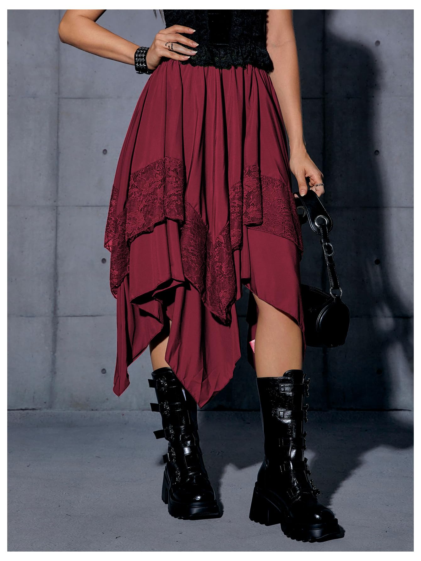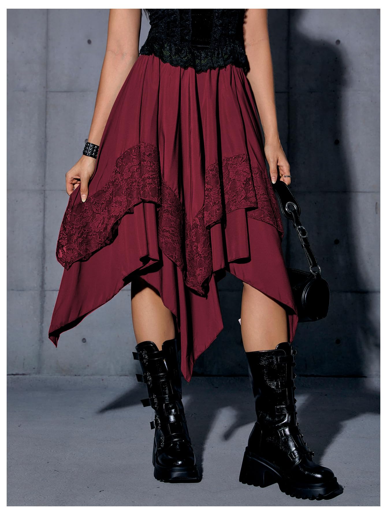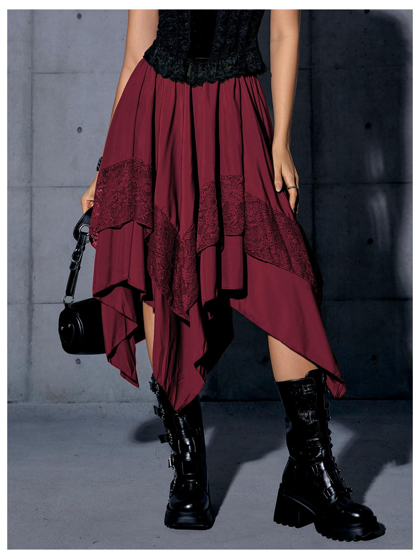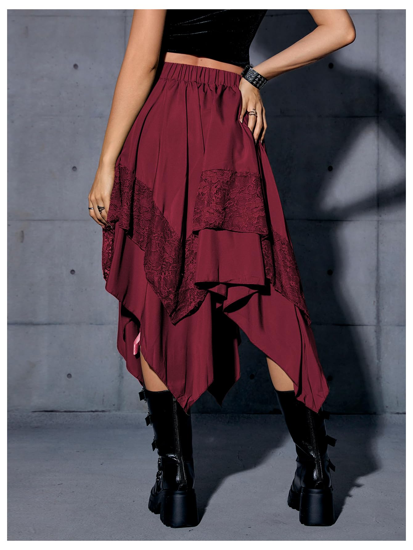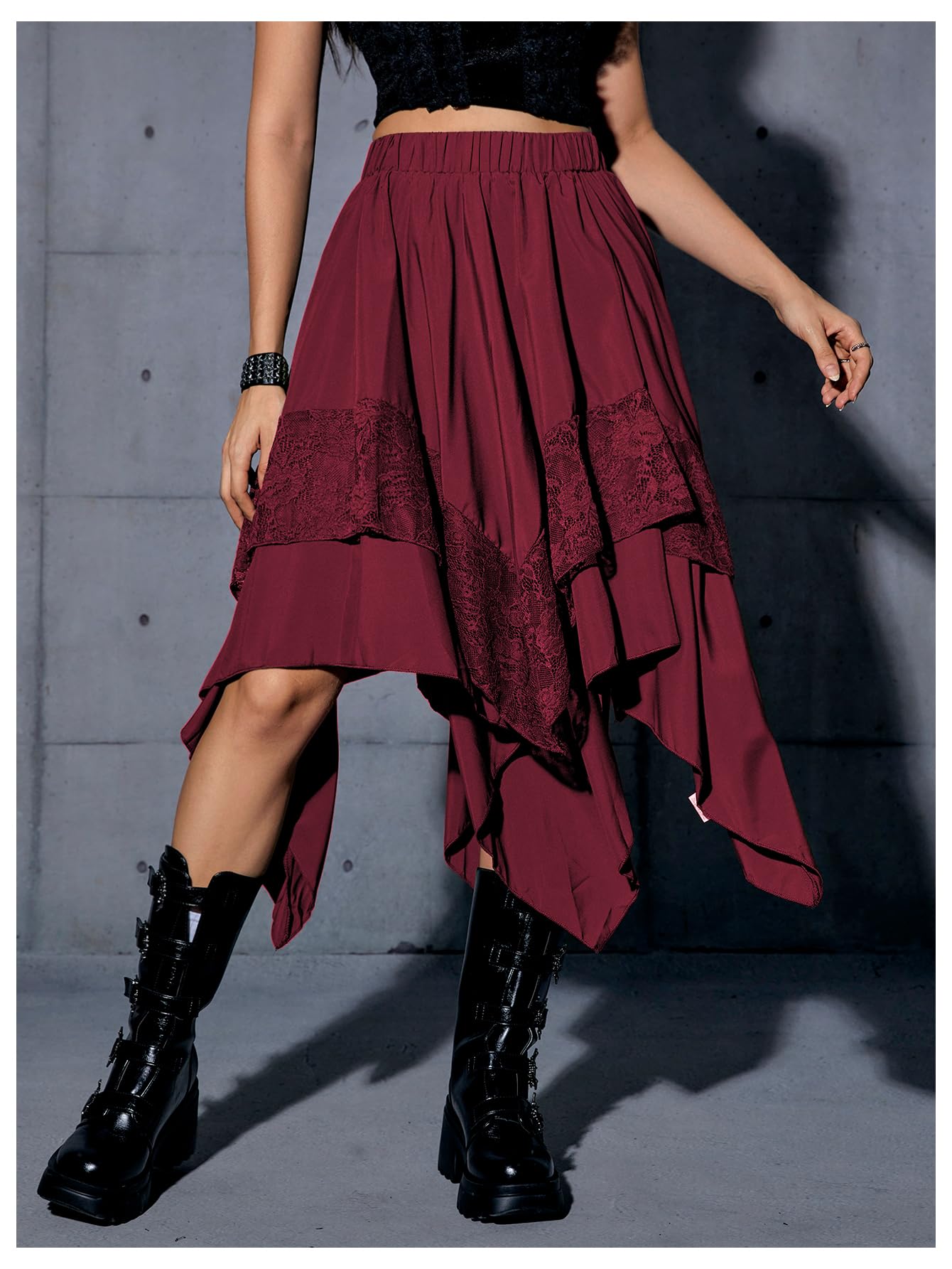 Elastic Waist, Lace Trim, Asymmetrical High Low Hem, A Line, Flowy, Gothic Steampunk Skirt, Casual Midi Skirt