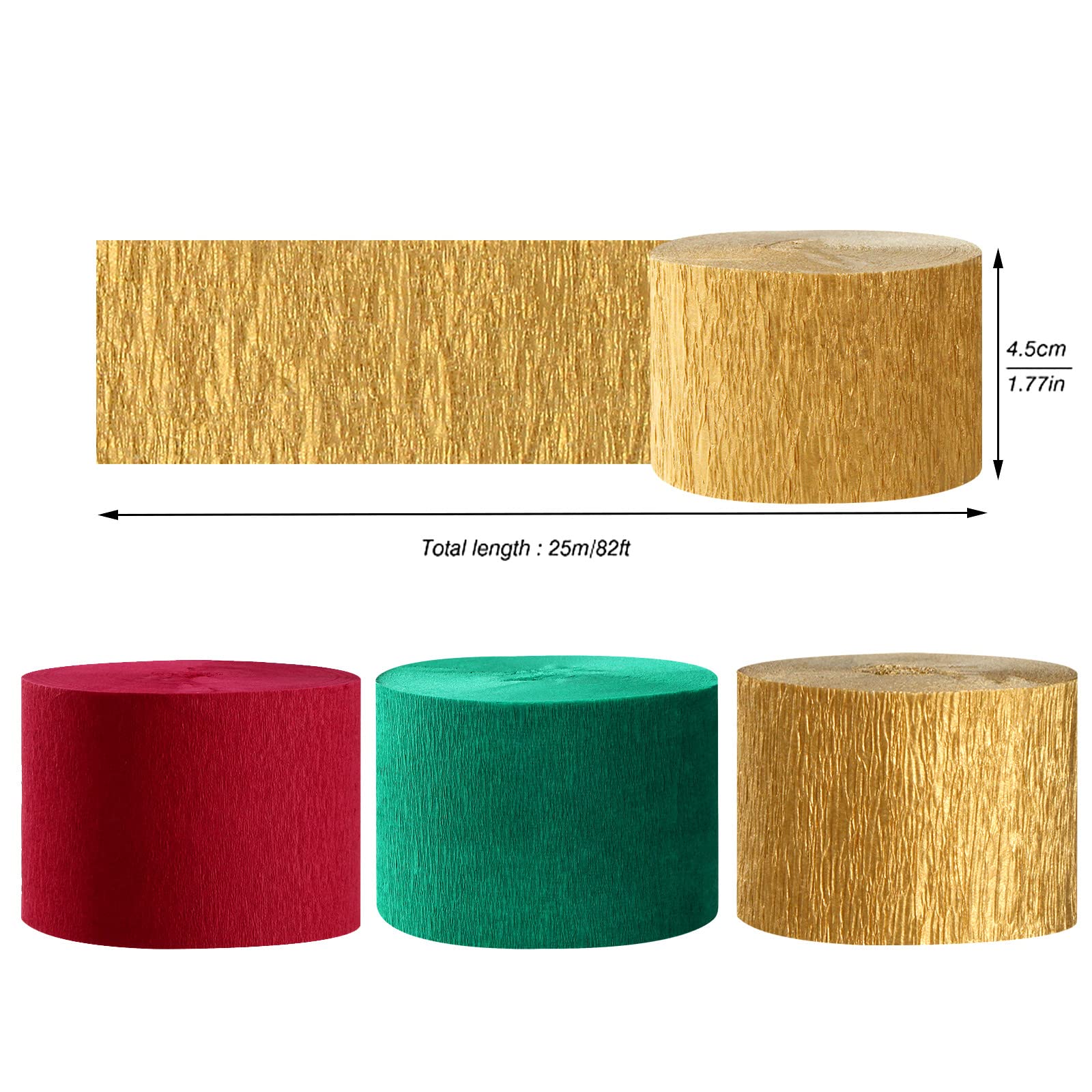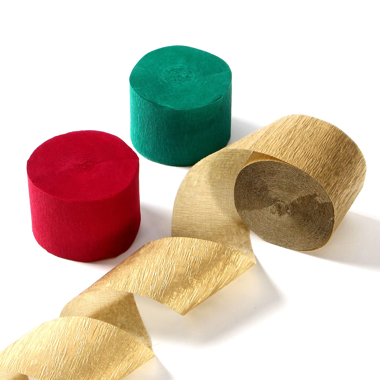 【Bright color】 Our crepe paper is available in 3 colors, 3 rolls per color:red green gold.There is plenty of each color to really get creative and have some fun.