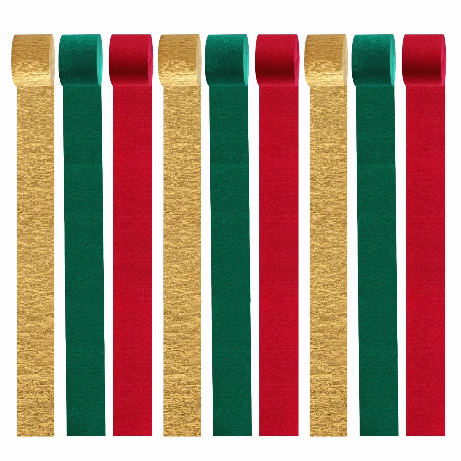 【Package Contains】The sets include 8 rolls crepe paper streamers.The size of each streamer is 1.77inch*82ft.They can be easily cut to your length you want. 【Bright color】 Our crepe paper is available in 3 colors, 3 rolls per color:red green gold.There is plenty of each color to really get creative and have some fun. 【Widely Used】They are perfect for bridal shower, birthday party,baby shower decorations,weddings,christmas in july decorations,christmas party decorations,birthday decorations, wedding. 【Resistant to fade】 The paper material of the streamers decorations high quality, recyclable and eco-Friendly,the color is not easy to fade,easy to make twisted streamer backdrops【100% Satisfaction Guarantee】You can get a full refund unconditionally if you are not satisfied with our products , do not hesitate to contact us if you have any questions