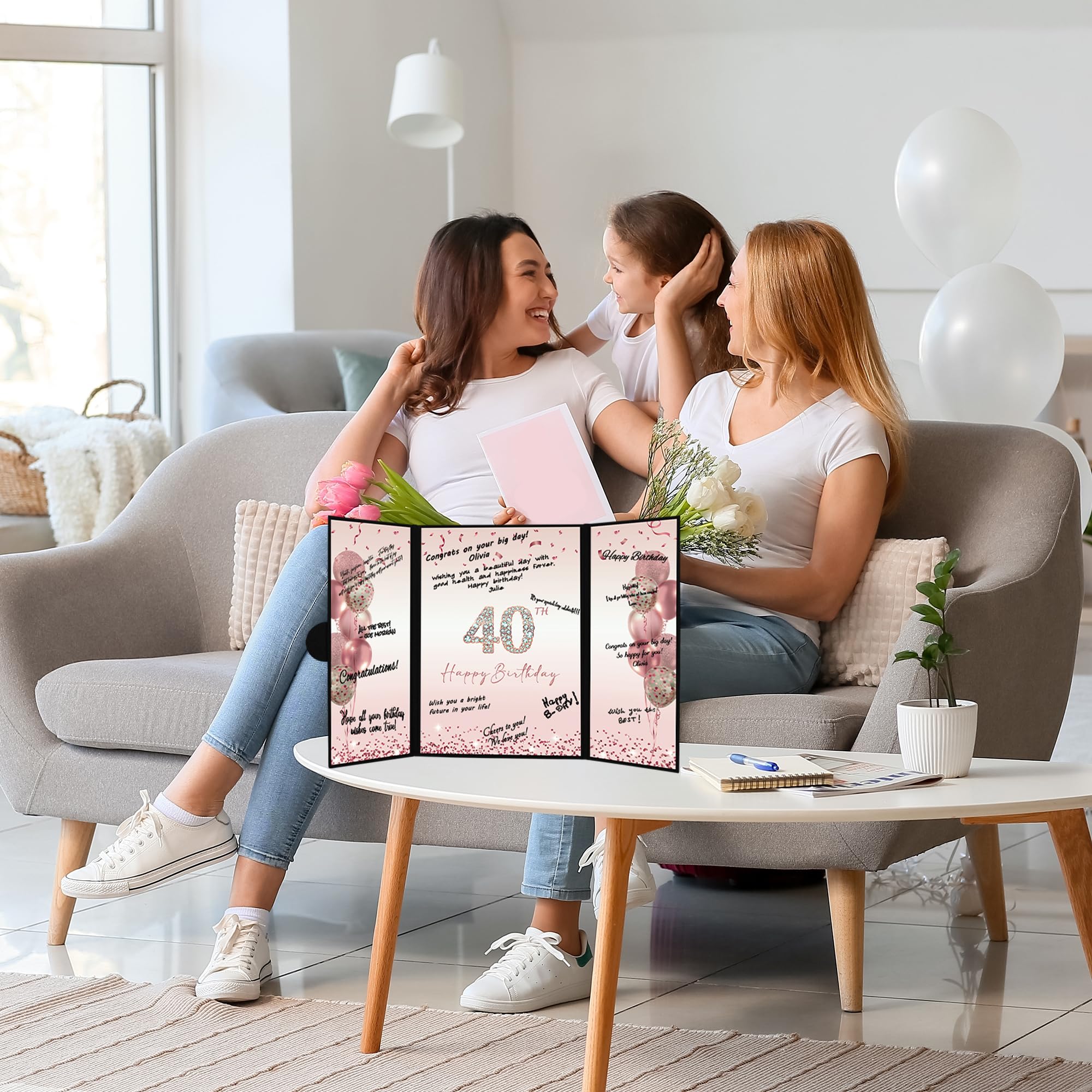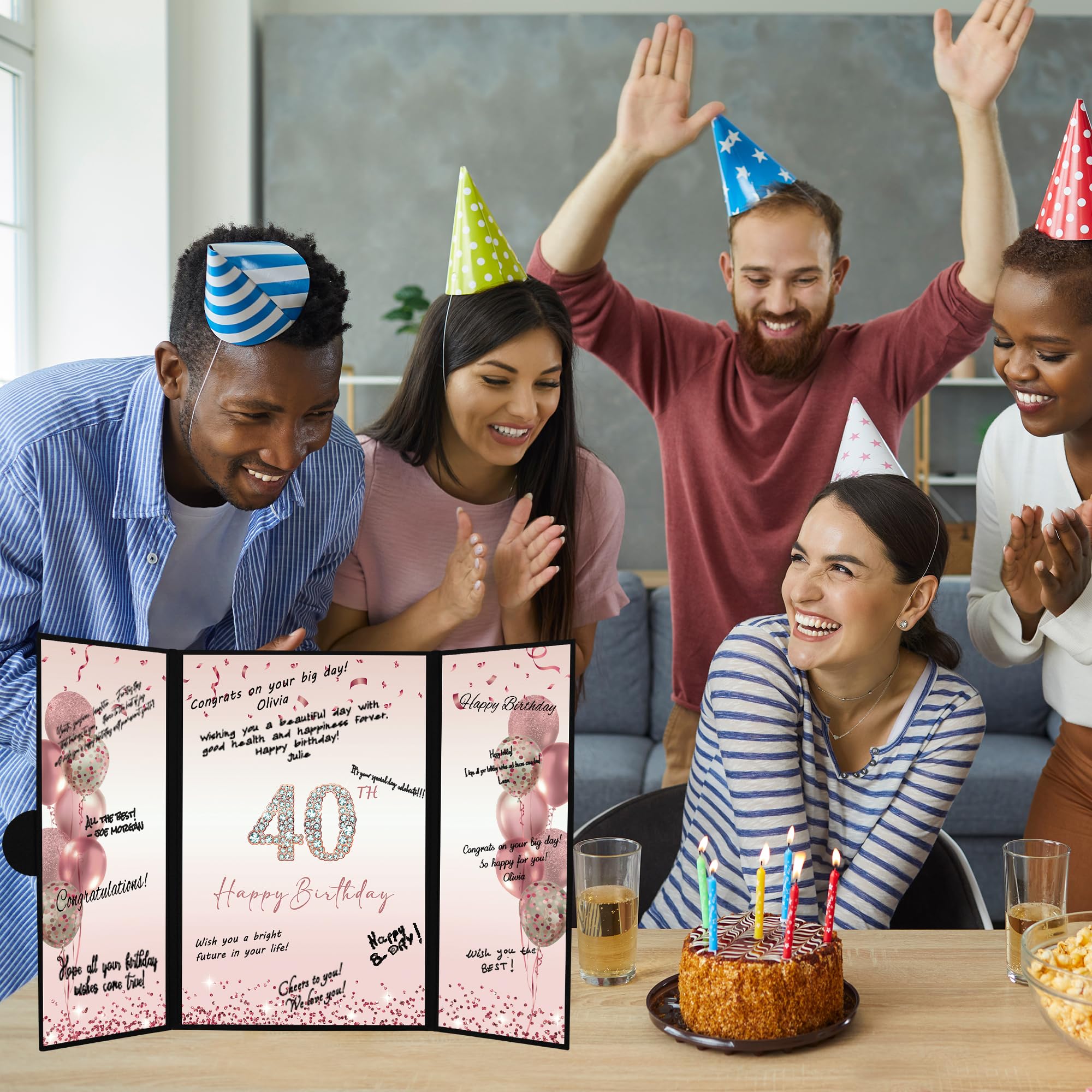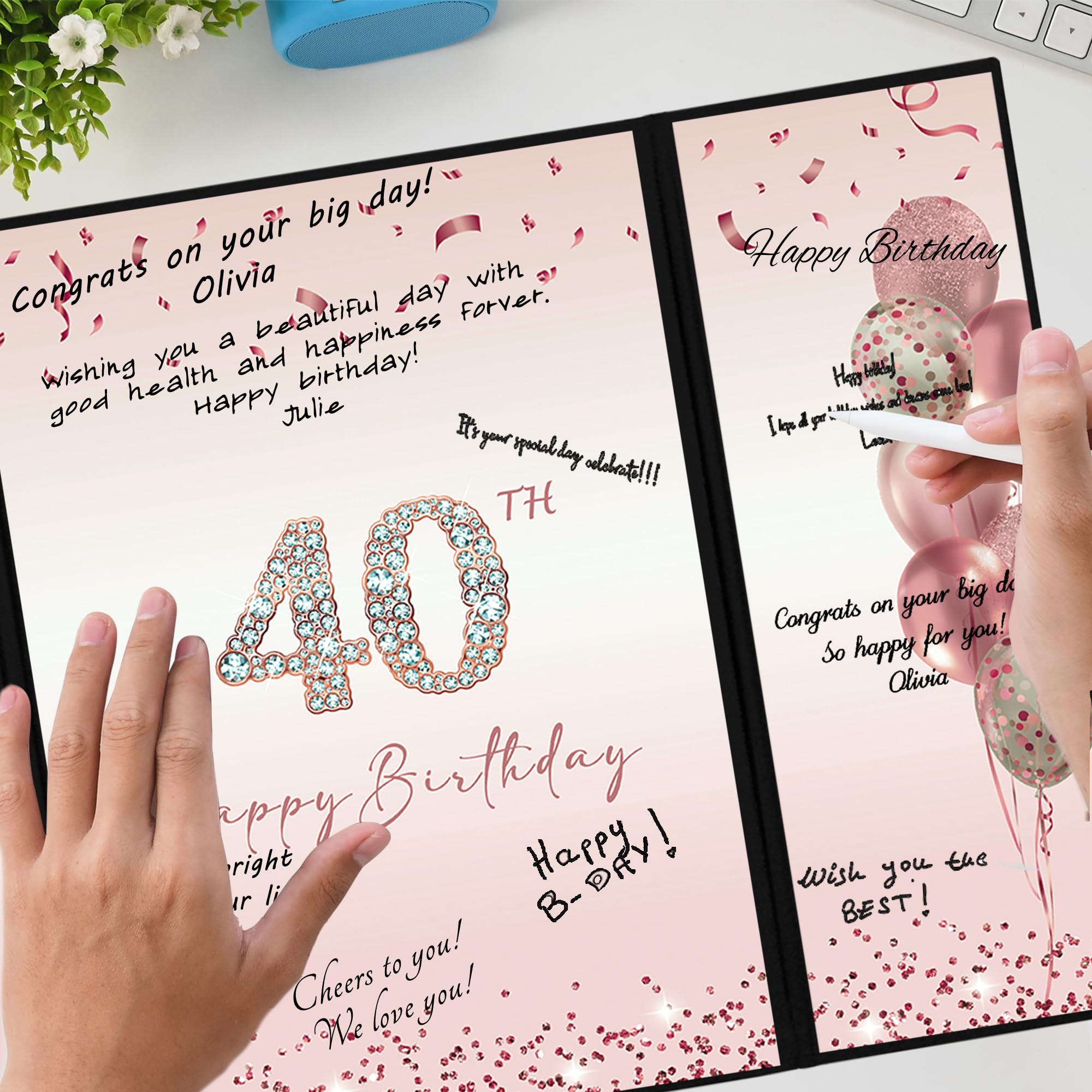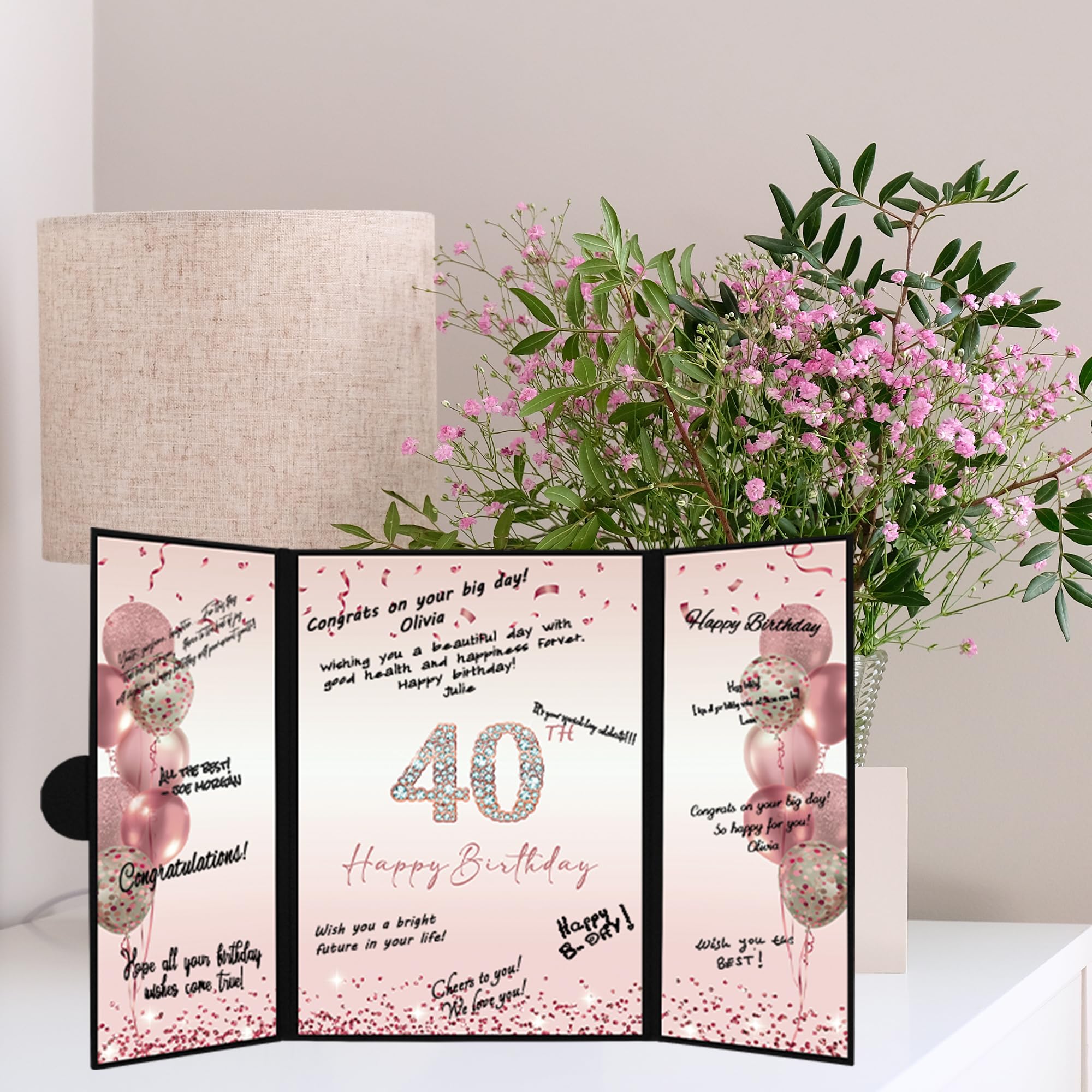 【Perfect Size】 - The cover of Happy 40th Birthday signature sign is approx. 45.6 x 30.6 cm/ 18 x 12inches; the left and right inner page is approx. 10.5 x 30cm/ 4.1 x 11.8inches; the middle inner page: approx. 21.5 x 30 cm/ 8.5 x 11.8inches. It is a fun party decoration idea for the 40th Birthday. You can make your keepsake unique and keep them endlessly.
