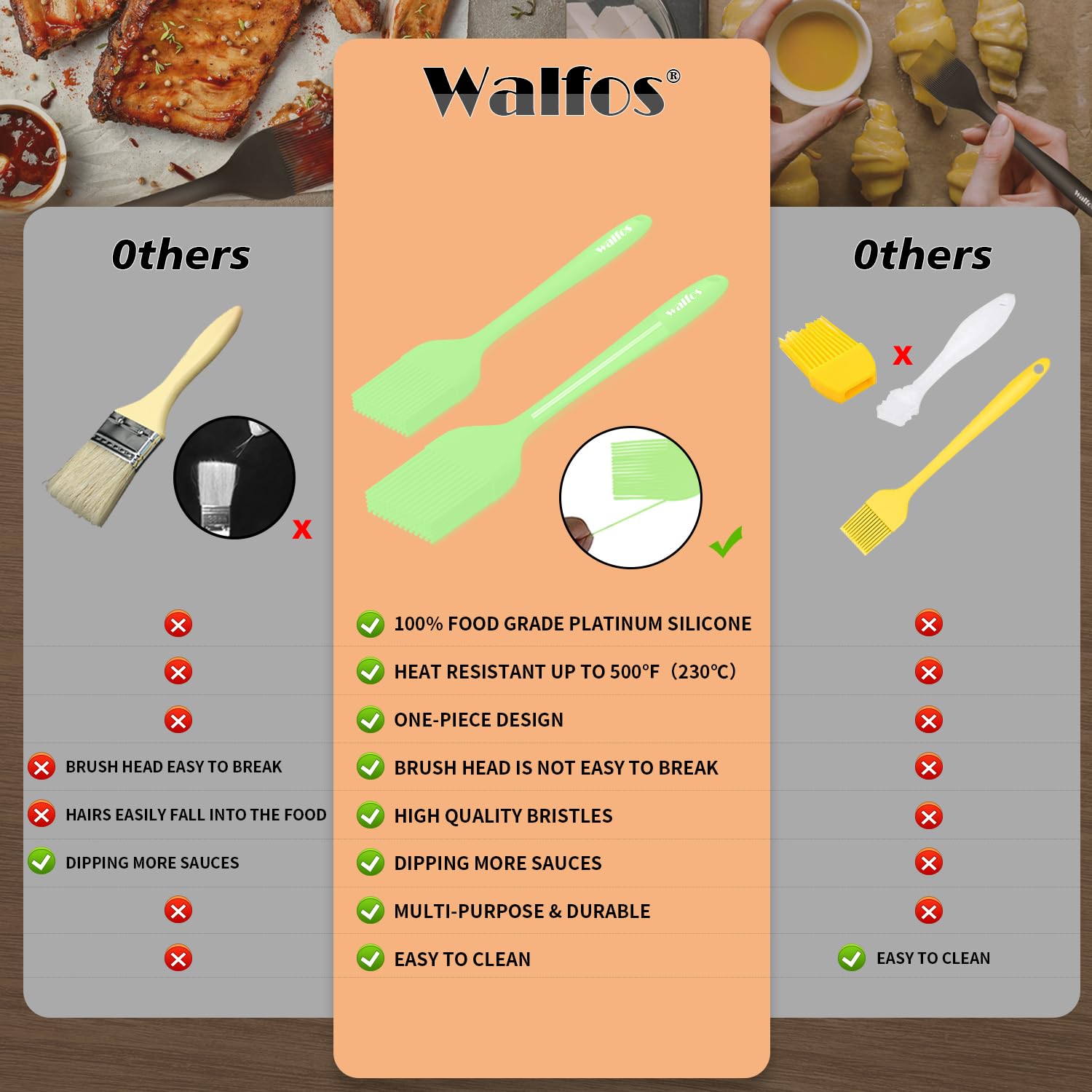 ★ Upgraded ONE-PIECE DESIGN & STAINLESS STEEL CORE TECHNOLOGY - Walfos basting pastry brush,Owing to ONE-PIECE design, the silicone bristles will not break or shed in your food, unlike other bristle brushes. No bacteria will be stuck in the silicone basting brush and keep your food safe. The handle built with internal steel core results in a solid durability to our basting oil brush, it is also long enough to get a firm grip, never break and rust.