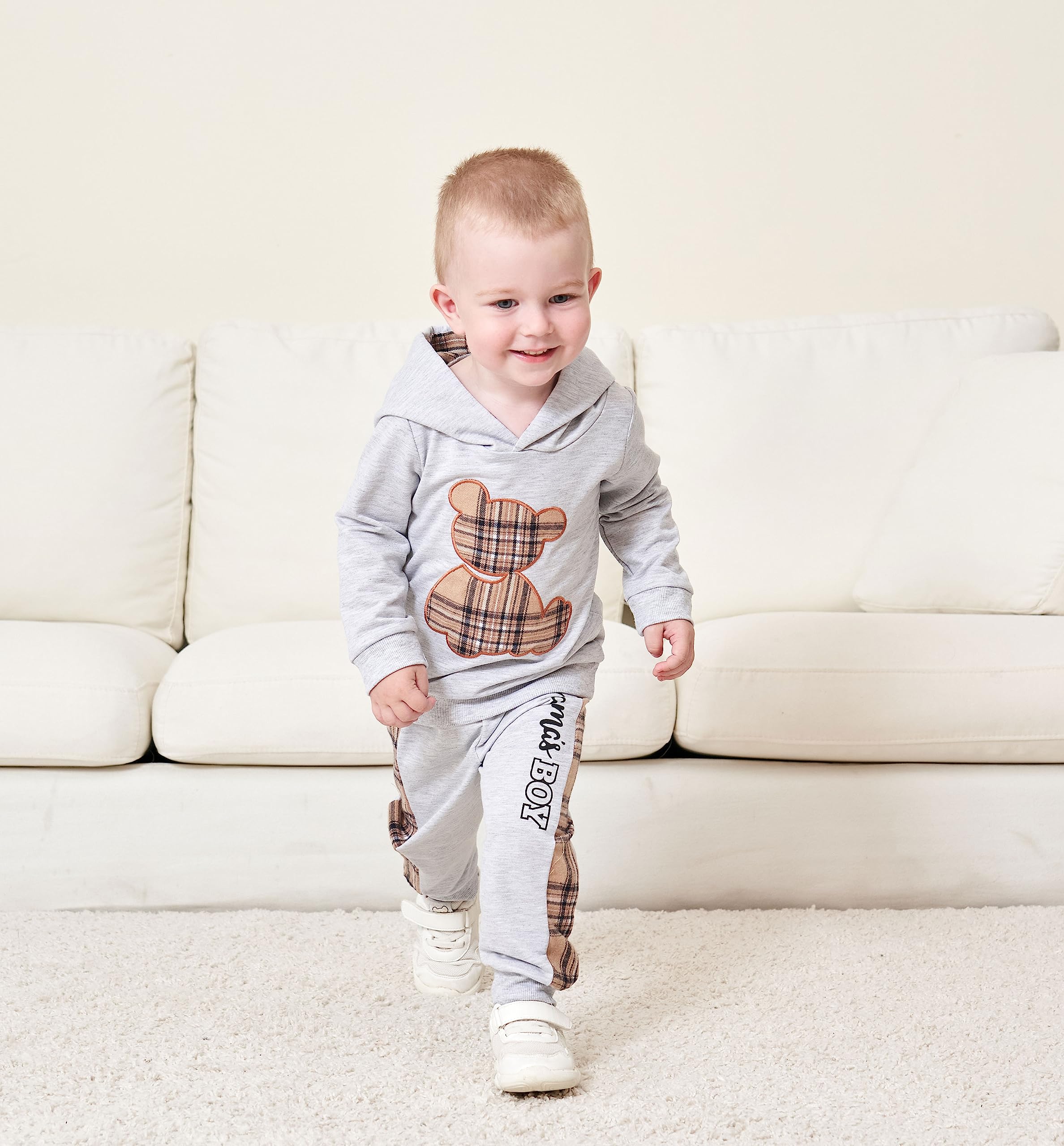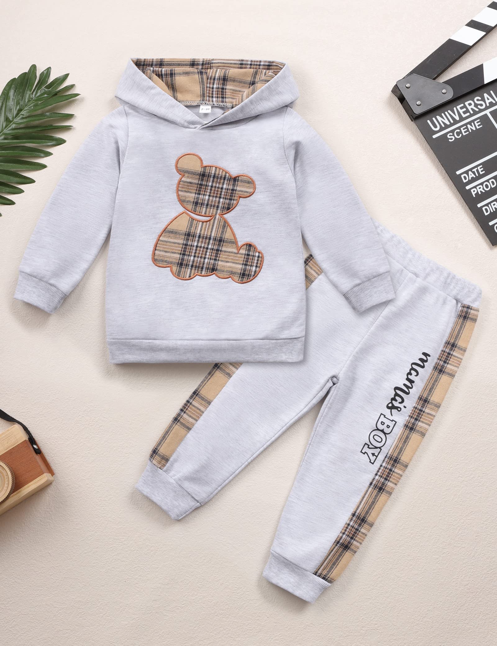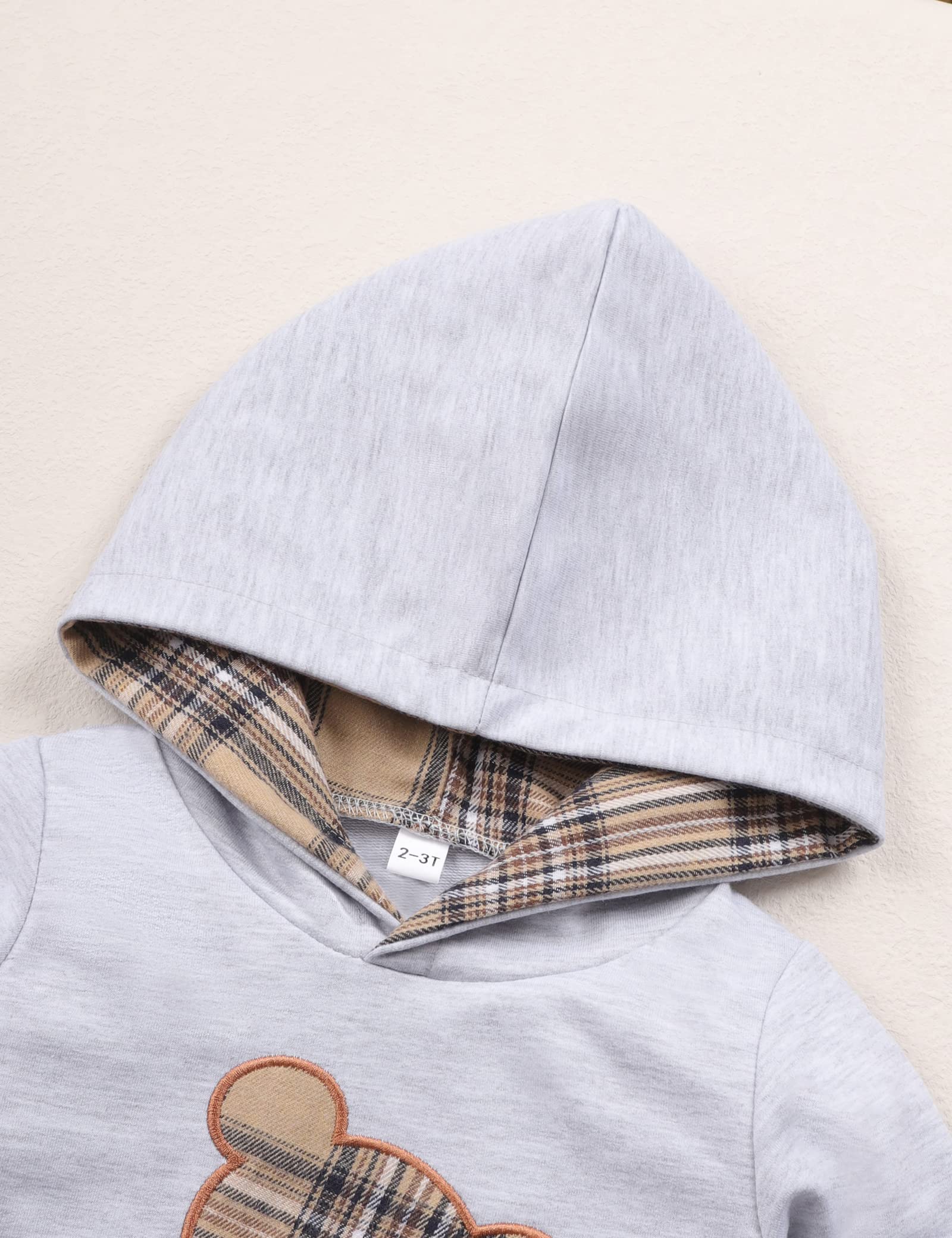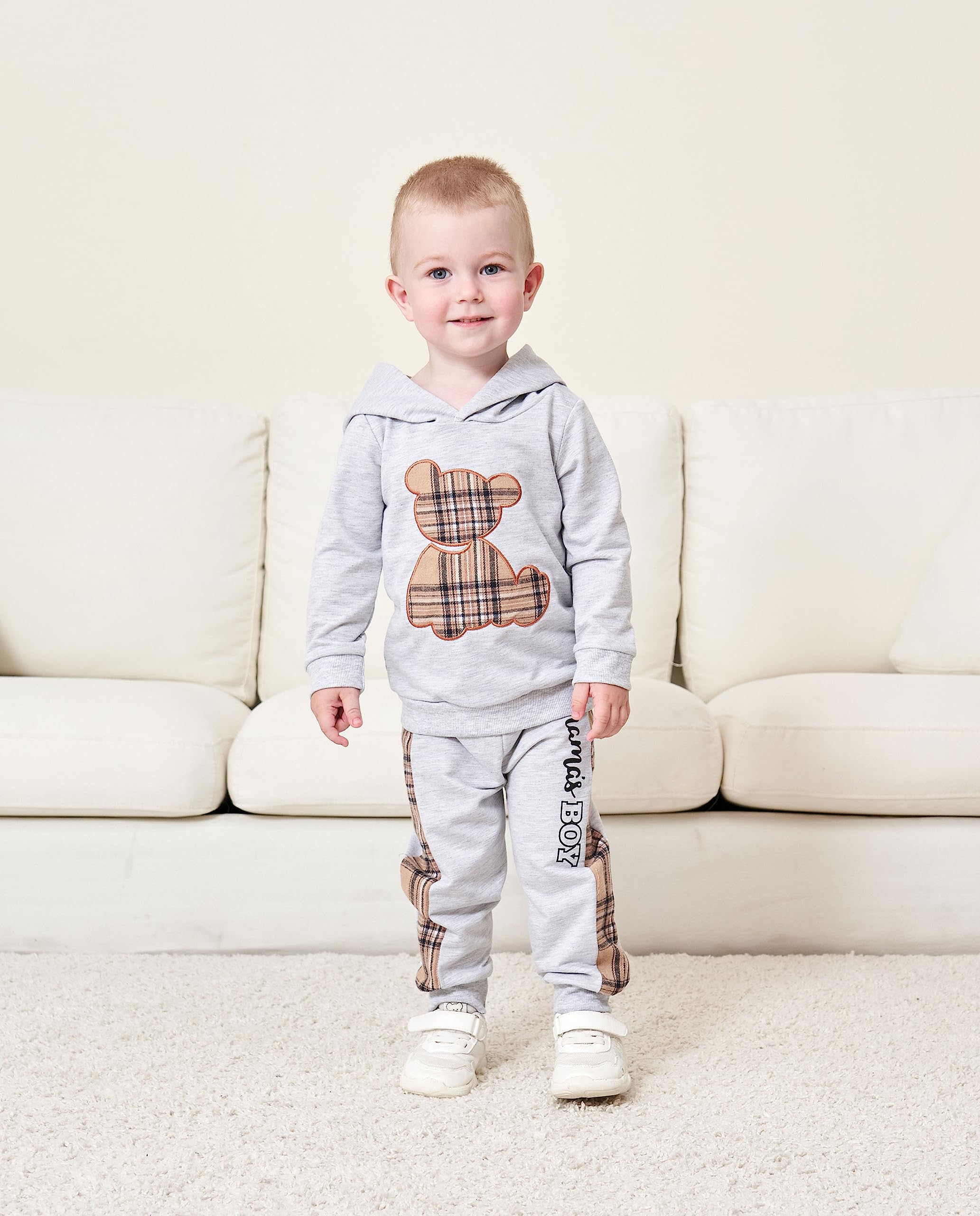 Occasion: Spring / Autumn / Winter outfit. Boy's bear plaid patchwork hoodie set, perfect for casual, everyday wear, playing outside, parks, sporting events, parties, dinners, family days, holidays, birthday , travel. Your baby boys wears it and does not want to take it off.