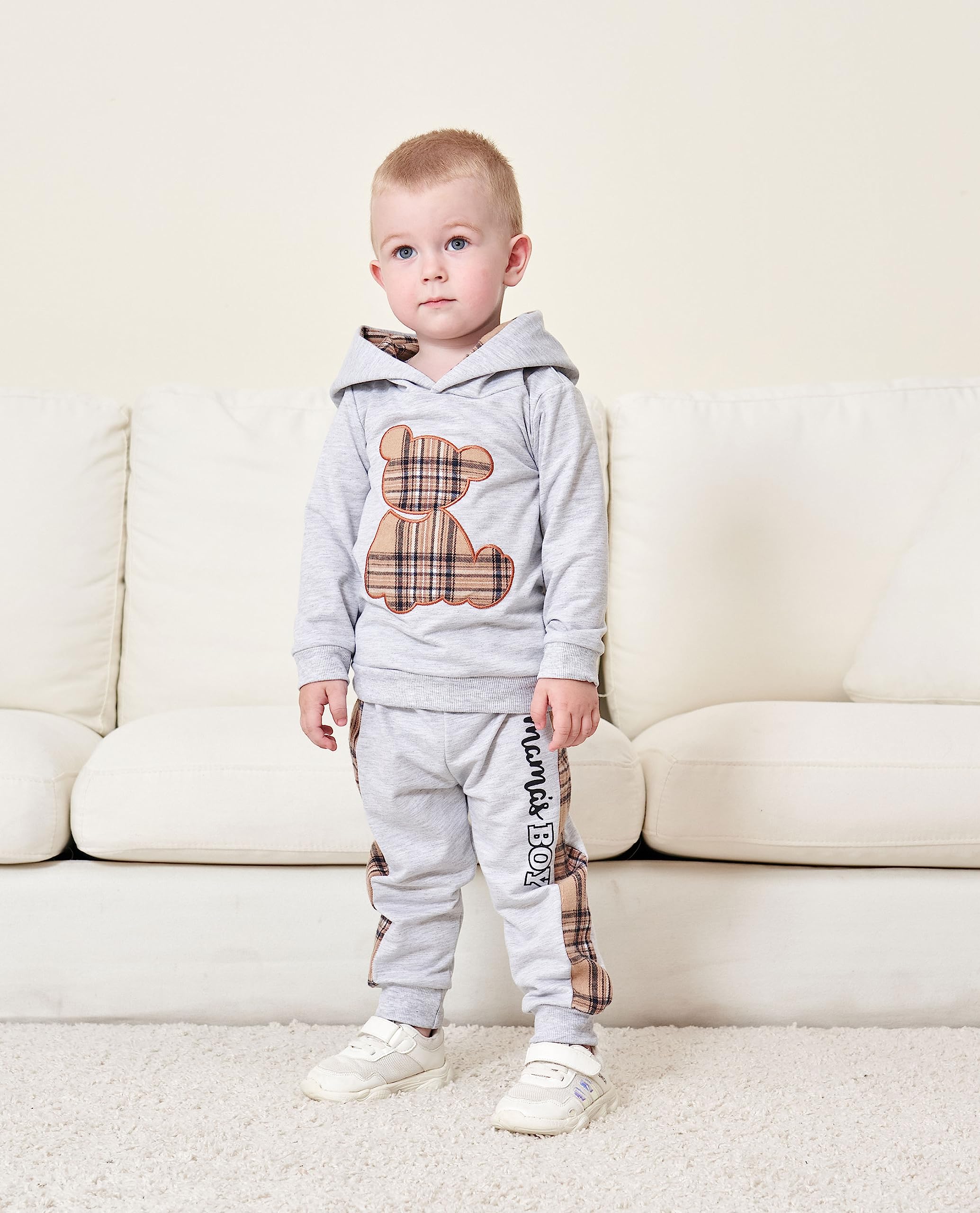 Trendy Design: Toddler boys spring clothes with cute classic bear plaid boys suit, plaid patchwork hood design, fashionable to wear. Loose fitting Mama's Boy waistband trousers, suitable for indoor or outdoor activities.