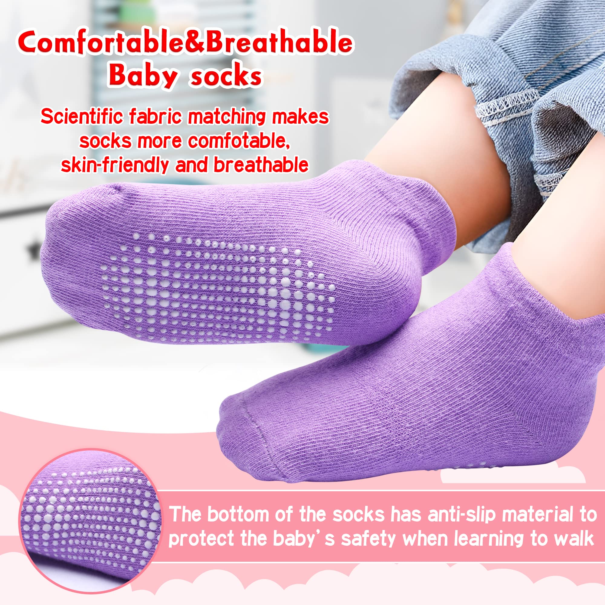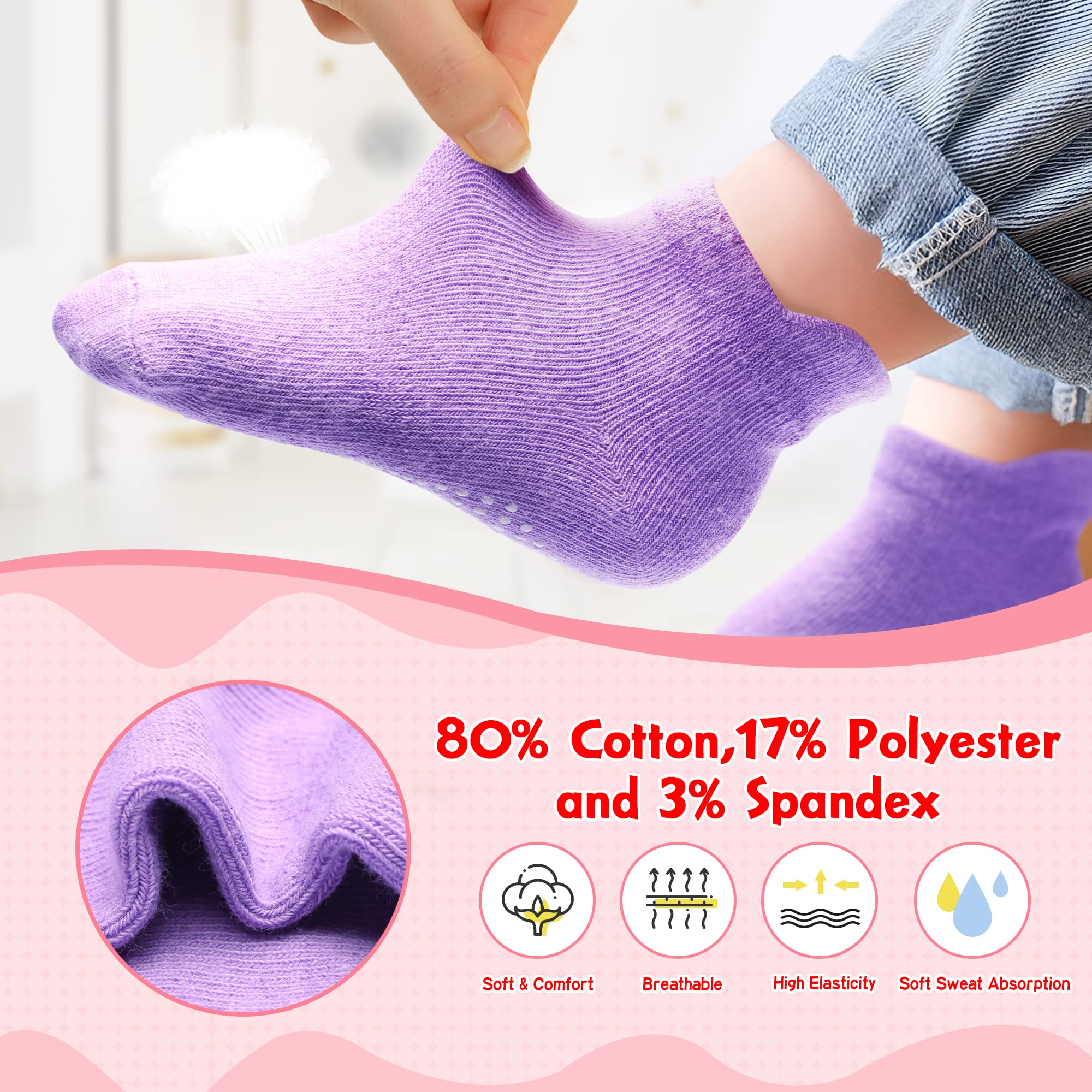 ASSORTED VALUE PACK-- 12 pairs of toddler non slip socks with fresh colors combinations at a good price. Toddler girl socks suitable for children ages 3-5 years old, from shoe sizes 9-11. These kid ankle socks are easily match with multiple outfits.