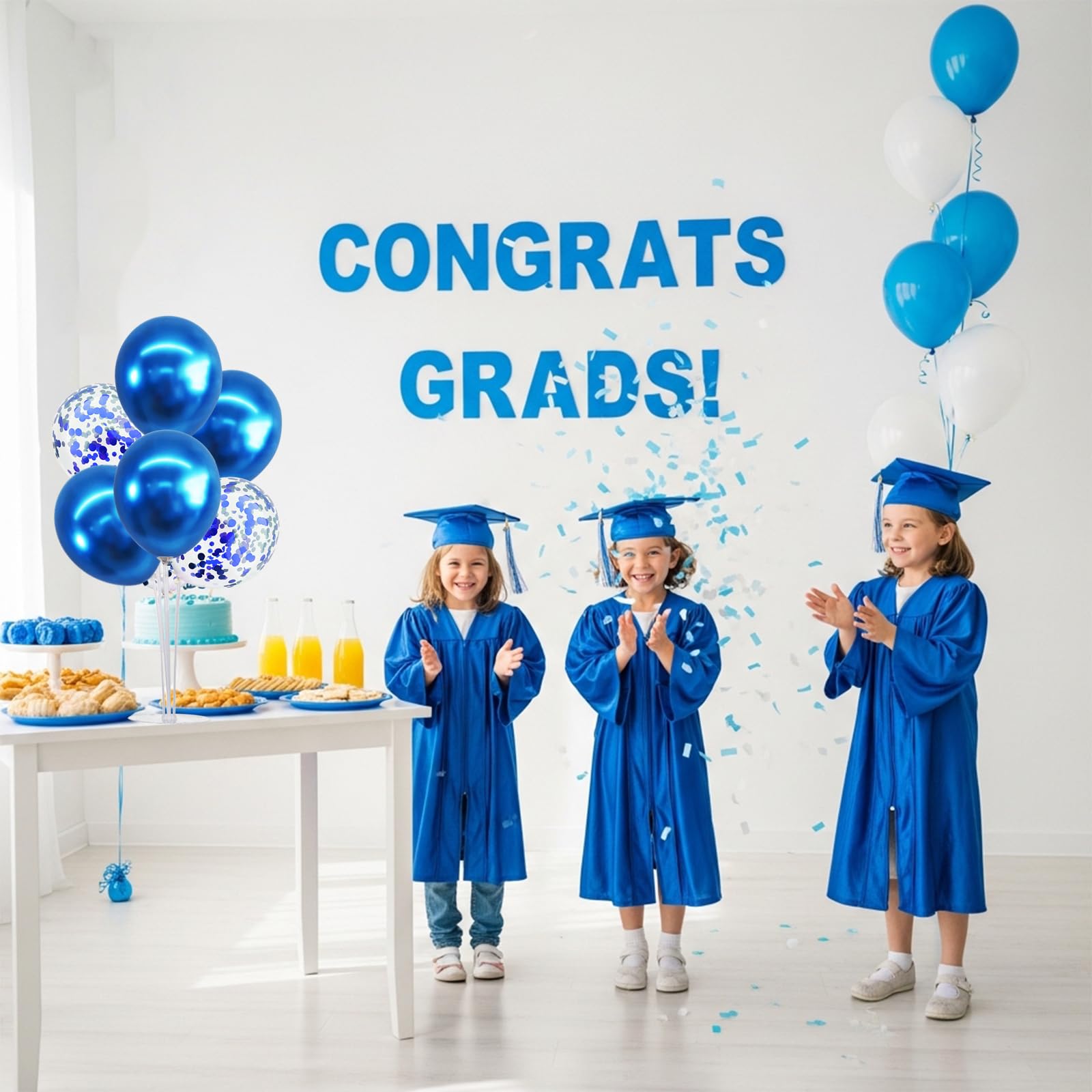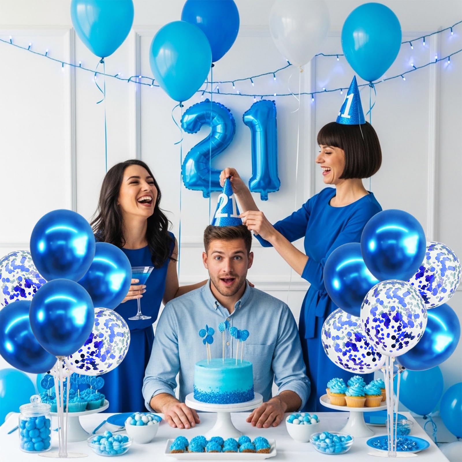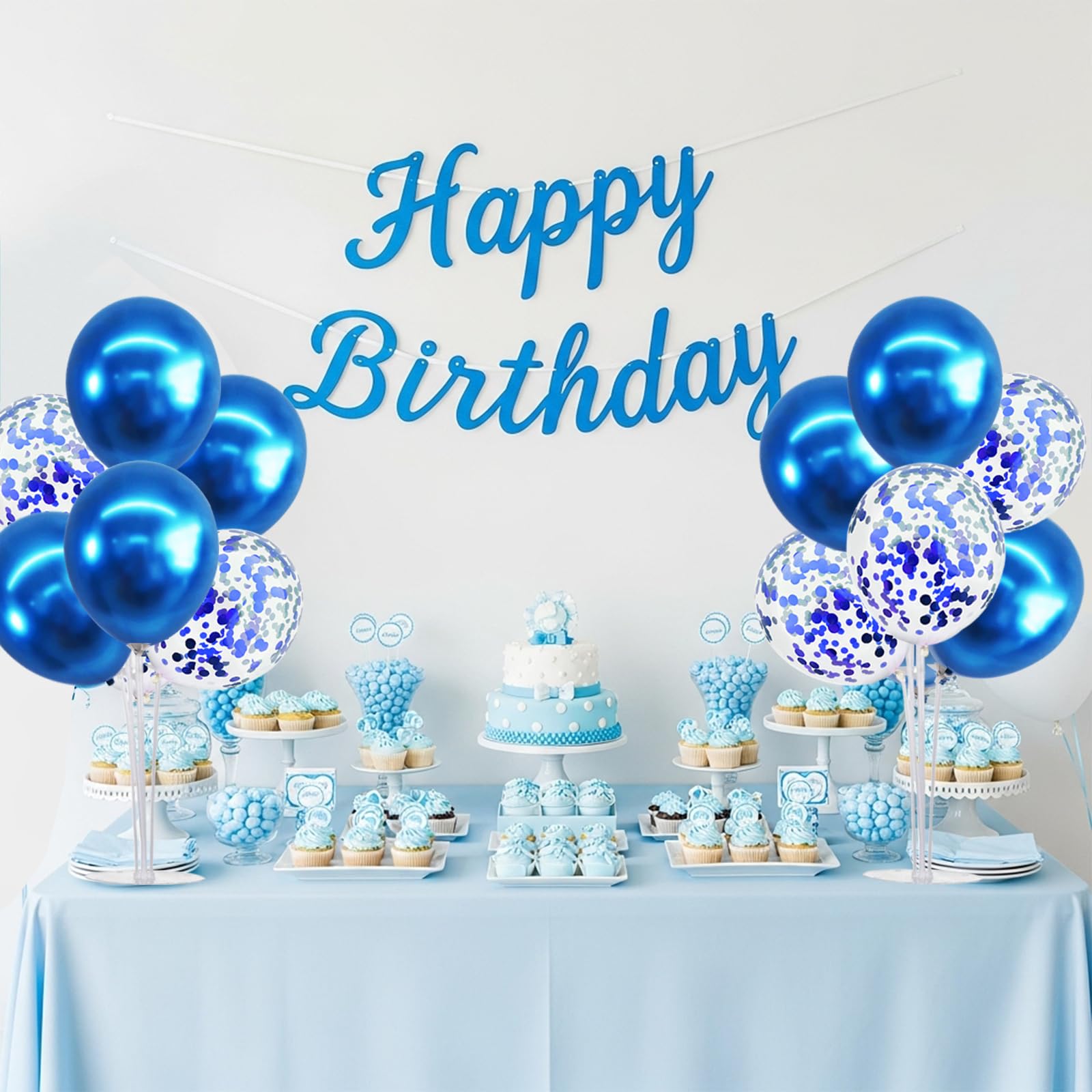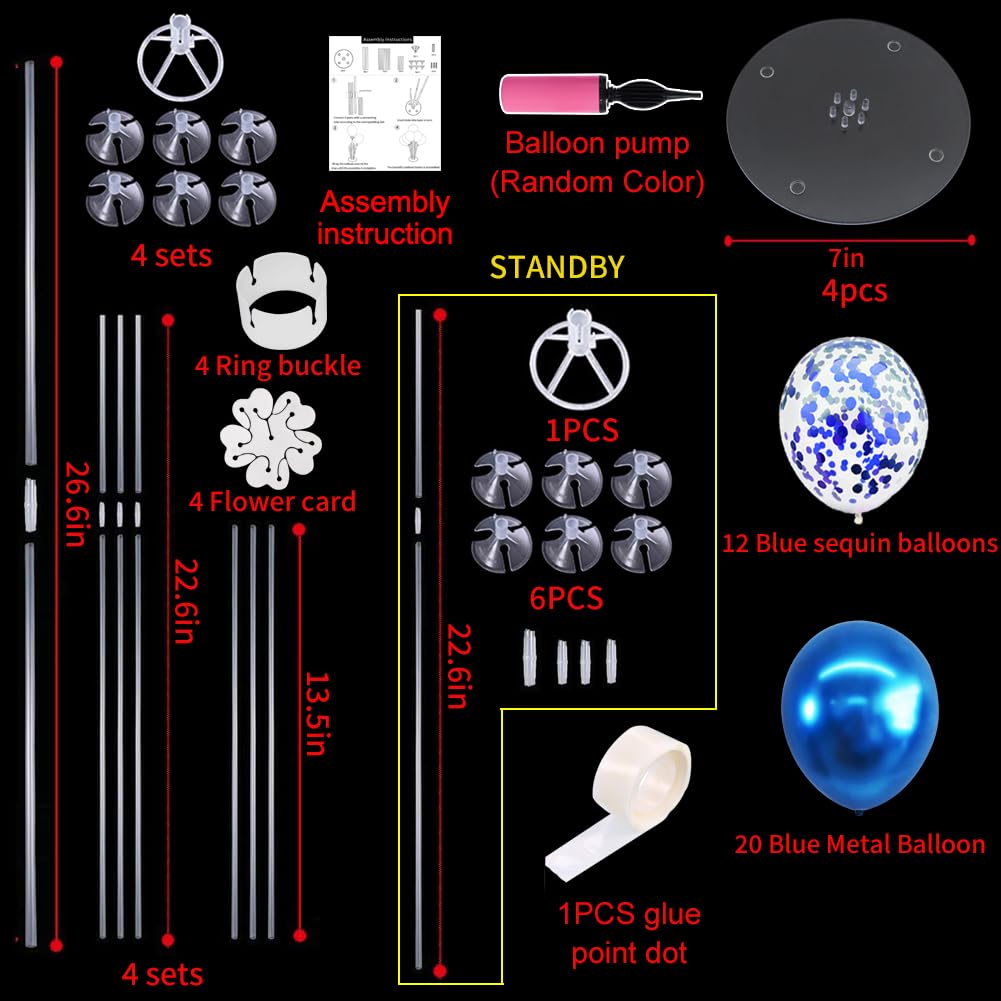 Package Includes: The balloon stand kit includes 4 reusable balloon centerpiece table decorations and 12 inch 32 pcs Latex Balloons(20 metallic blue balloons,12 blue confetti balloons),glue point dots,balloon pump,balloon clips,and tie tool.You don’t need to waste money to buy balloons