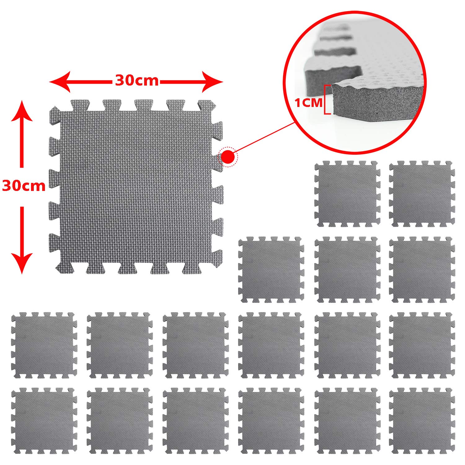 Cover area: 86CM x 170CM( ±1CM) / approx. 1.46 SQ. M,one sets 18pcs,(300mm x 300mm x 10mm). Package includes 18 GRAY interlocking foam tiles, making it a perfect workout and training accessory.