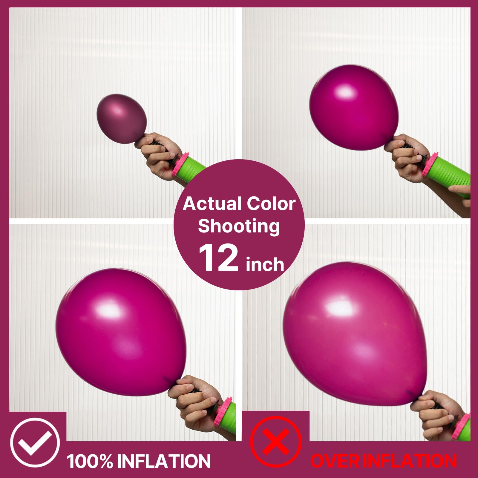 ATTENTION & WARNING: Please DO NOT overfill the balloons and also avoid sunburn, overheat, pointed object and excessive friction. Control the amount of air inflated into each balloon to achieve your ideal balloon size
