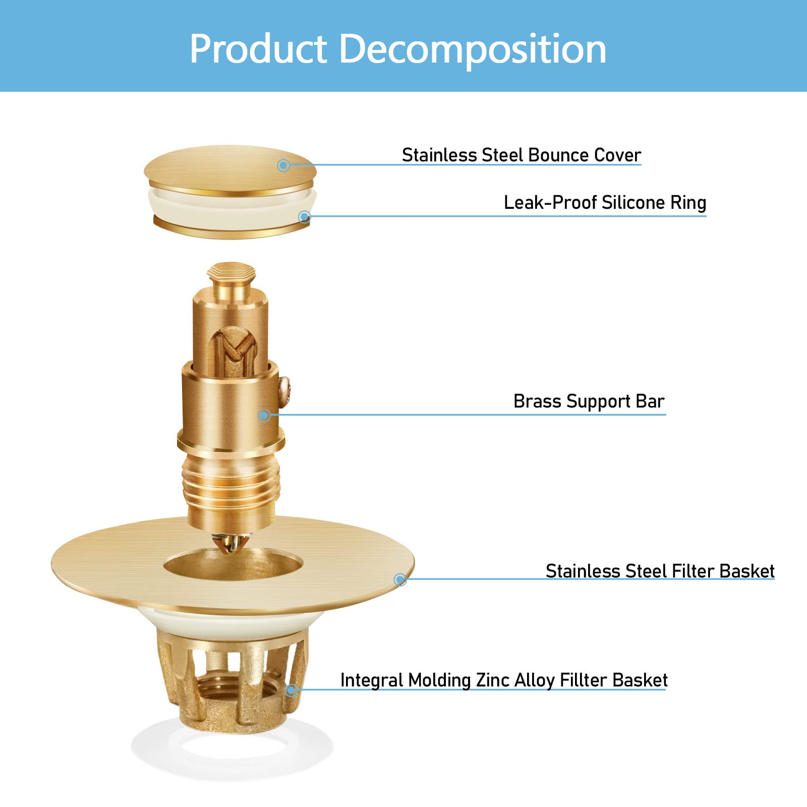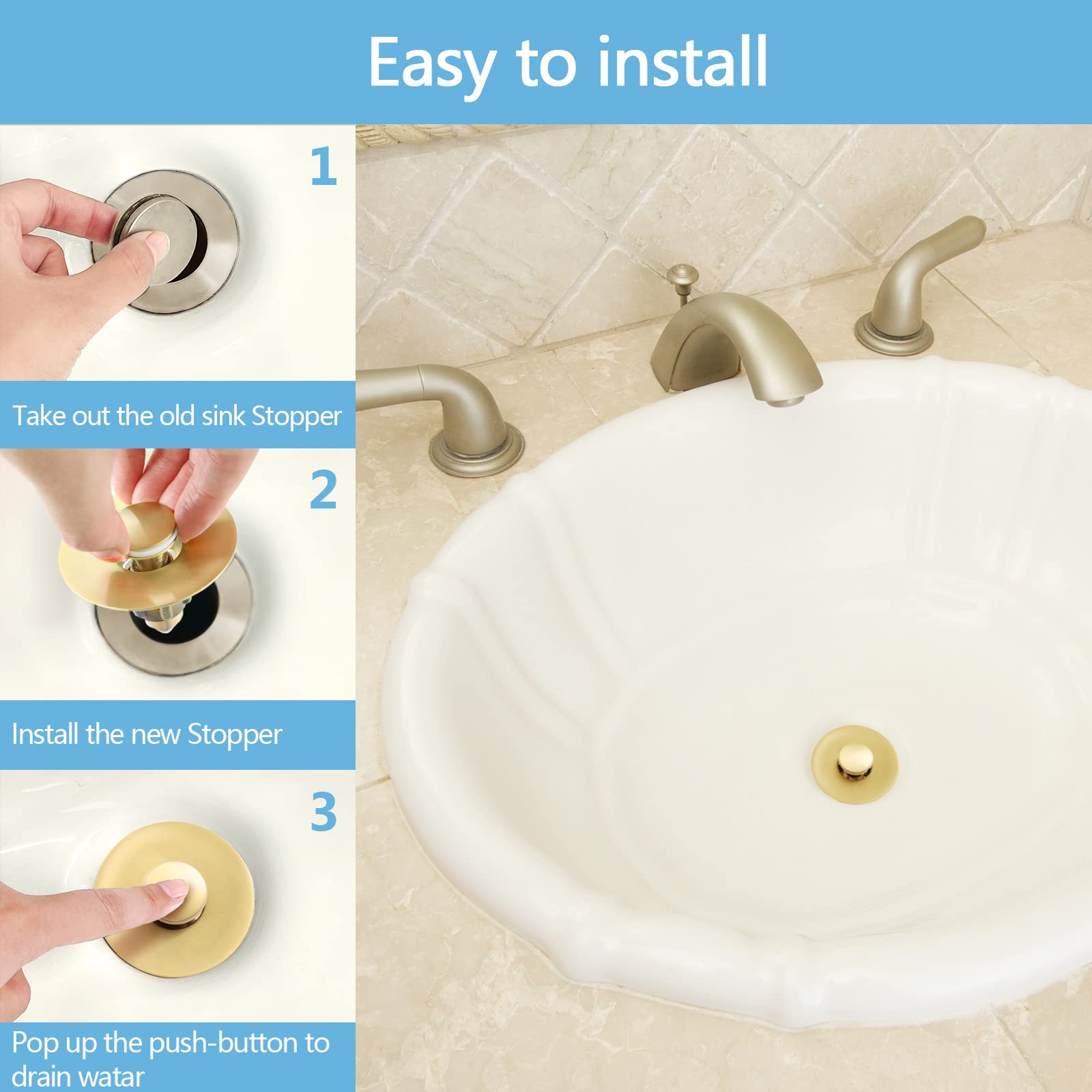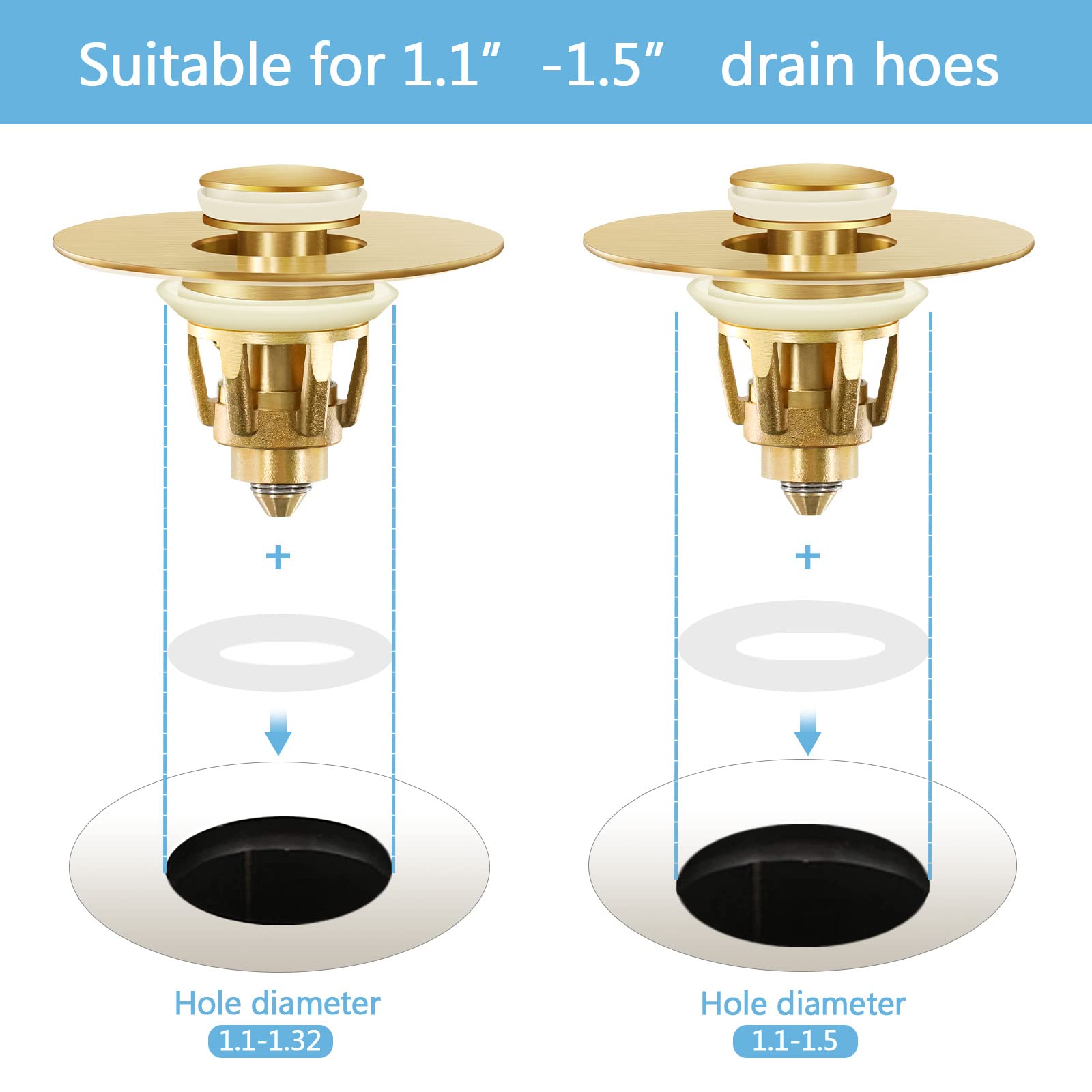 【PERFECT COMPATIBILITY】Gold bathroom sink stopper is designed with a new small diameter (1.1~1.5 inch inner diameter), 2 silicone rings ensure a perfect fit with various drain holes, conforming to most US standards 1 1 /8" ~1 1/2" sink drain holes (depth: about 1.5"),Other similar products are too large for American sinks.