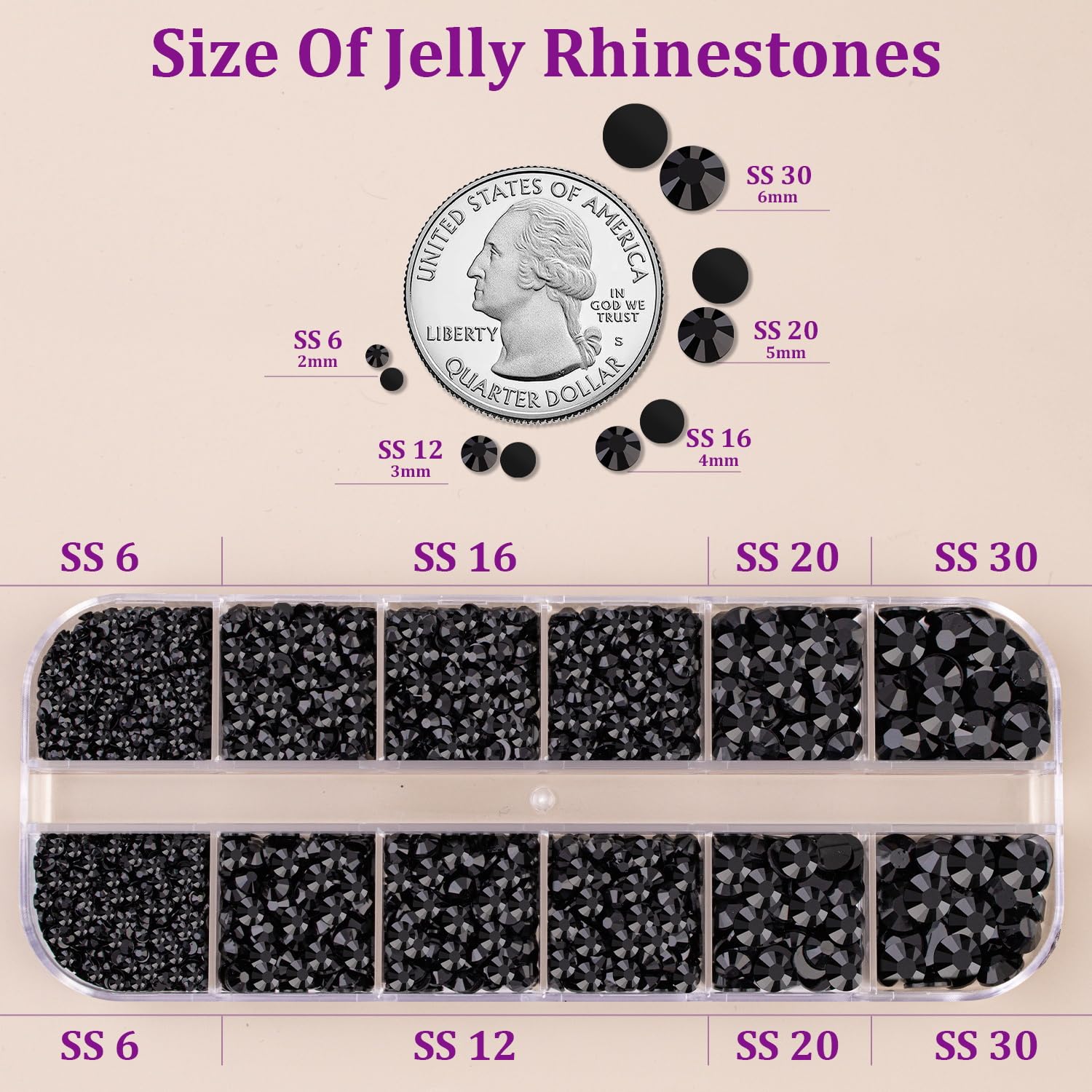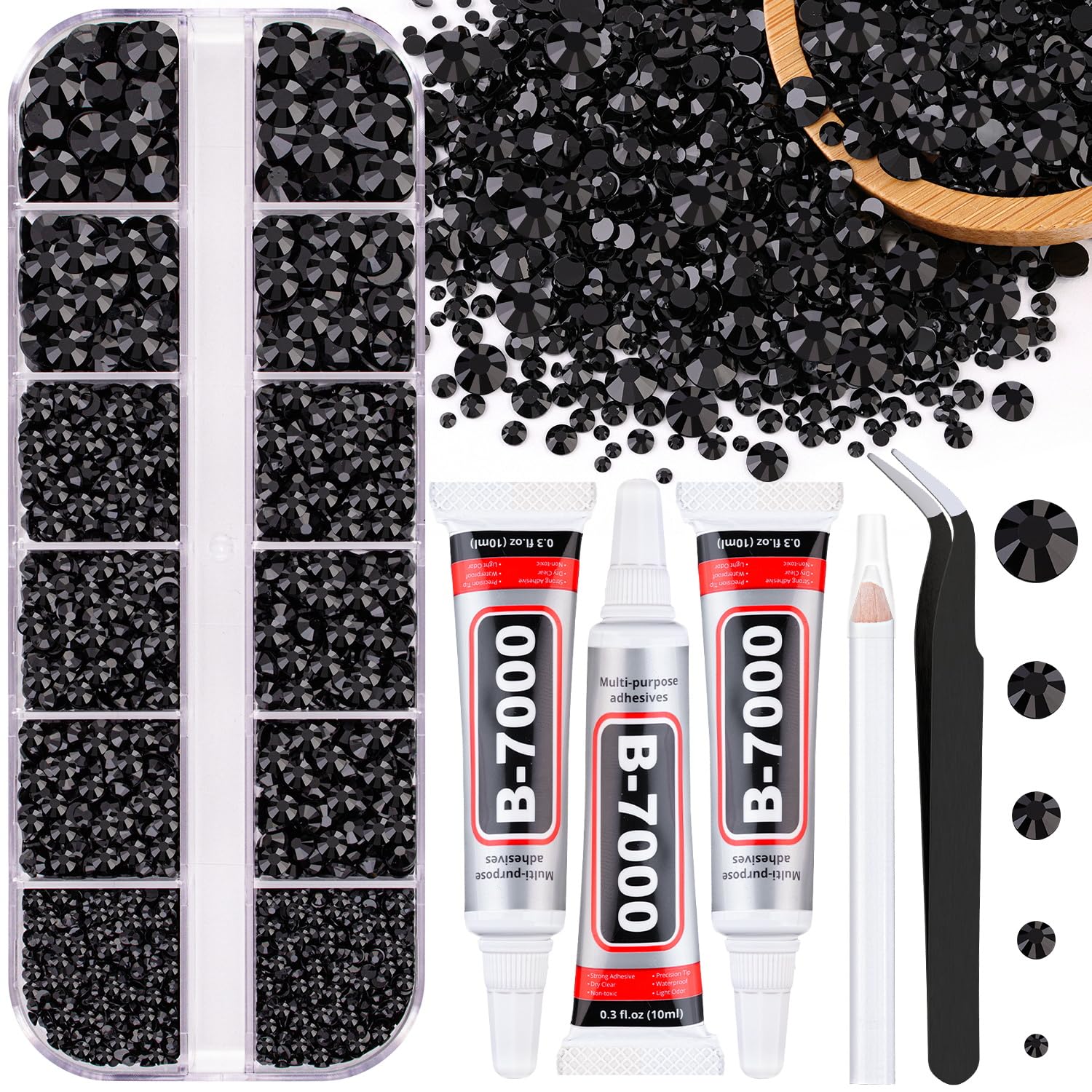⚫WHAT YOU WILL GET -- The package includes 1 box of flatback rhinestones with 12 grids in diffrent sizes:2mm x 2 grids, 3mm x 3 grids, 4mm x 3 grids, 5mm x 2 grids, 6mm x 2 grids. 1 tweezers for large size gems, 1 pickup pen for small size gems. 3 B7000 adhesive jewels glue for jewelry making.This rhinestone kit makes it easy for you to make any craft you like, and will bedazzle your artworks! ⚫B7000 CLEAR GLUE FOR GEMS -- Our B7000 glue has strong adhesion and dries clear, non-toxic and harmless to the skin.The glue has a precision needle for easy application, initial cure time is 3-5 minutes and full cure time is 24 hours. The glue will have a slight overflow when first used, before use you can leave the glue head up for a few minutes to avoid overflow. After use, the needle needs to be wiped with an alcohol pad. ⚫TIPS FOR USE -- Our flatback rhinestones are non-hotfix, need to use with glue.To apply the resin rhinestones, first, clean the surface of your crafts or your nail you wish to embellish. Then, apply the rhinestones with the appropriate glue and wait for them to dry. Once the glue is completely dry, it will stick firmly to your crafts,make your artwork more sparkling!Our store also offer a variety of colors, these colors will give your crafts more possiblities, more shiny color scheme. ⚫WIDE APPLICATION -- These sparkling iridescent jelly crystals are perfect for creating dazzling looks. Use them for bedazzling DIY crafts like shoes, tumblers, mugs, bottles, phone cases, popsockets, scrapbooks, photo frames, diamond paintings, greeting cards, bags, glasses, guitars, keychains, hats, masks, hair clips, bracelets, wristbands, clothing, wedding dresses, and more. Apply it to what you want to bling!