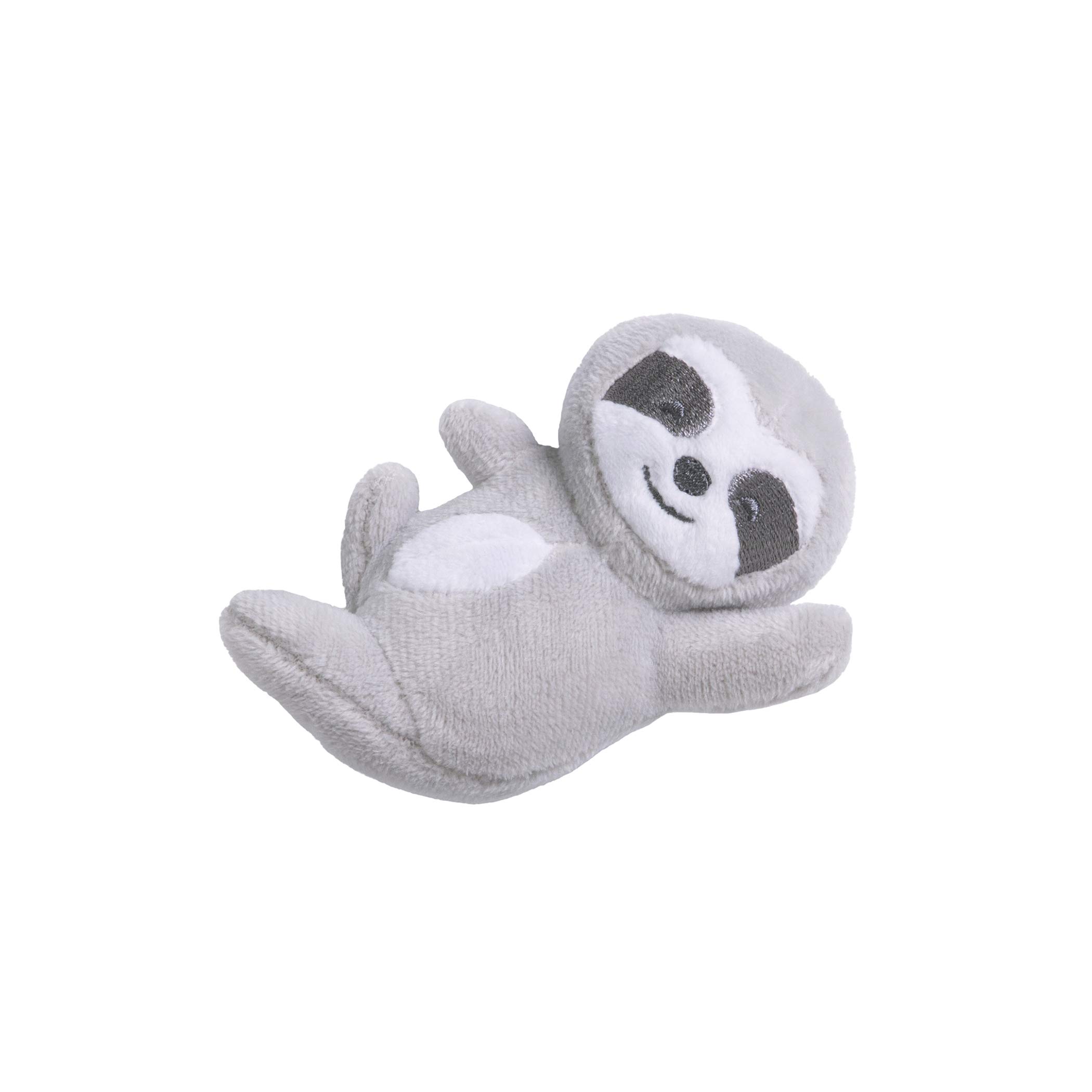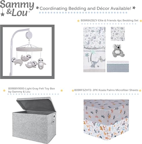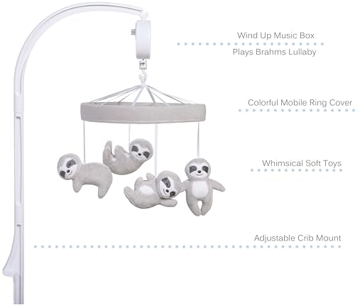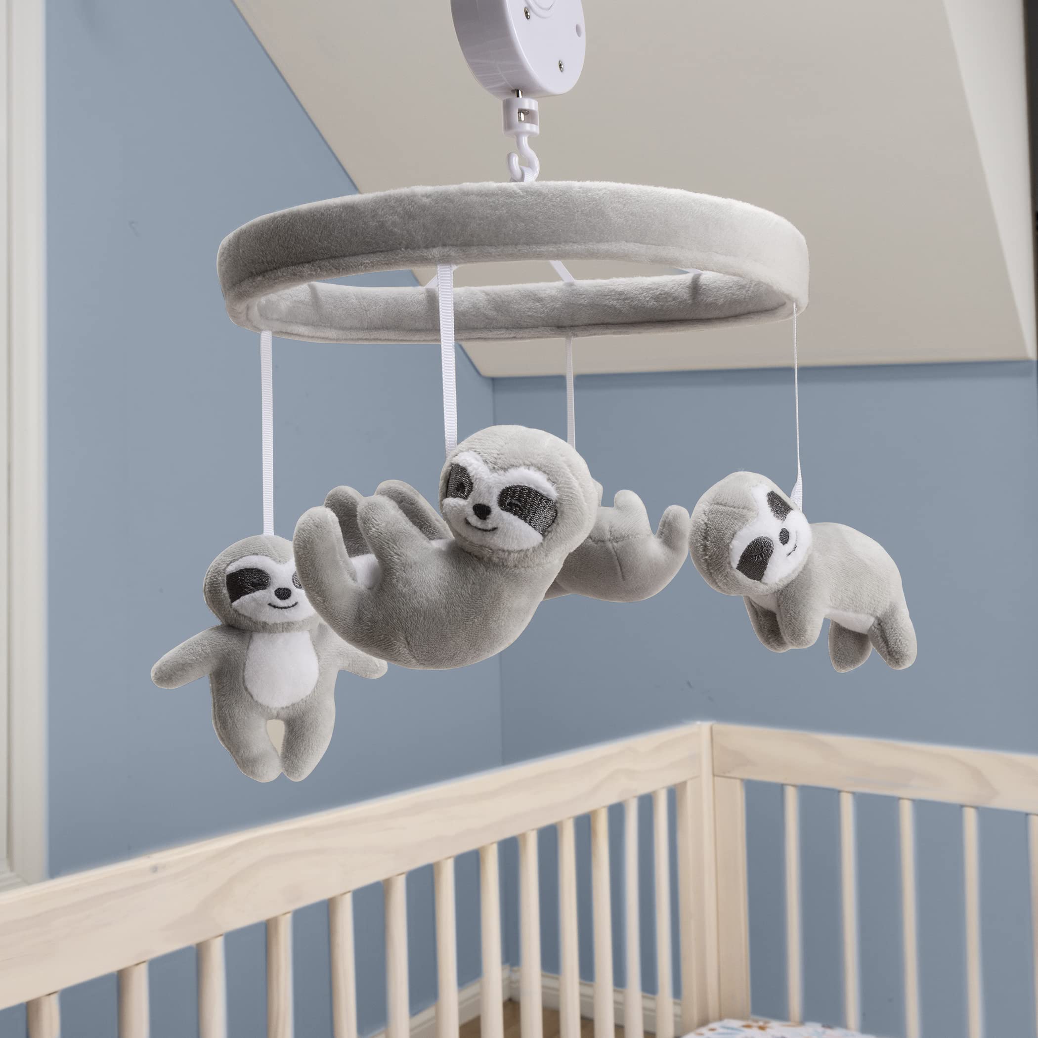 Encourage eye tracking and sound perception skills with this Sloth Musical crib Mobile by Sammy and Lou. A solid light gray banded mobile ring features four playful sloths suspended from decorative white ribbons that slowly rotate to Brahms' Lullaby.