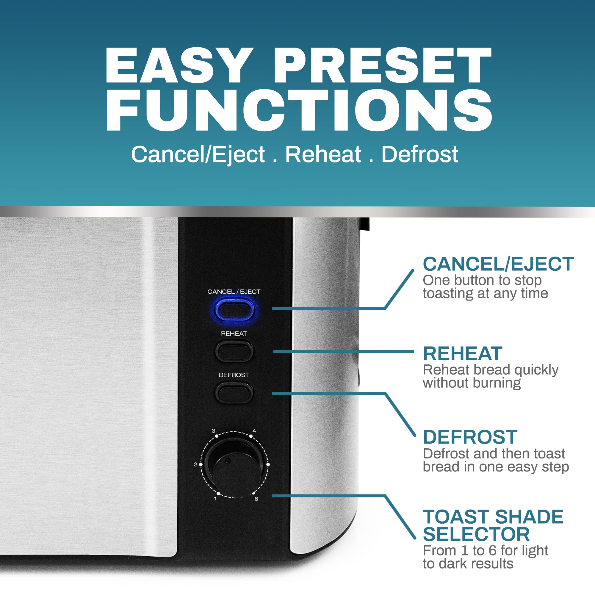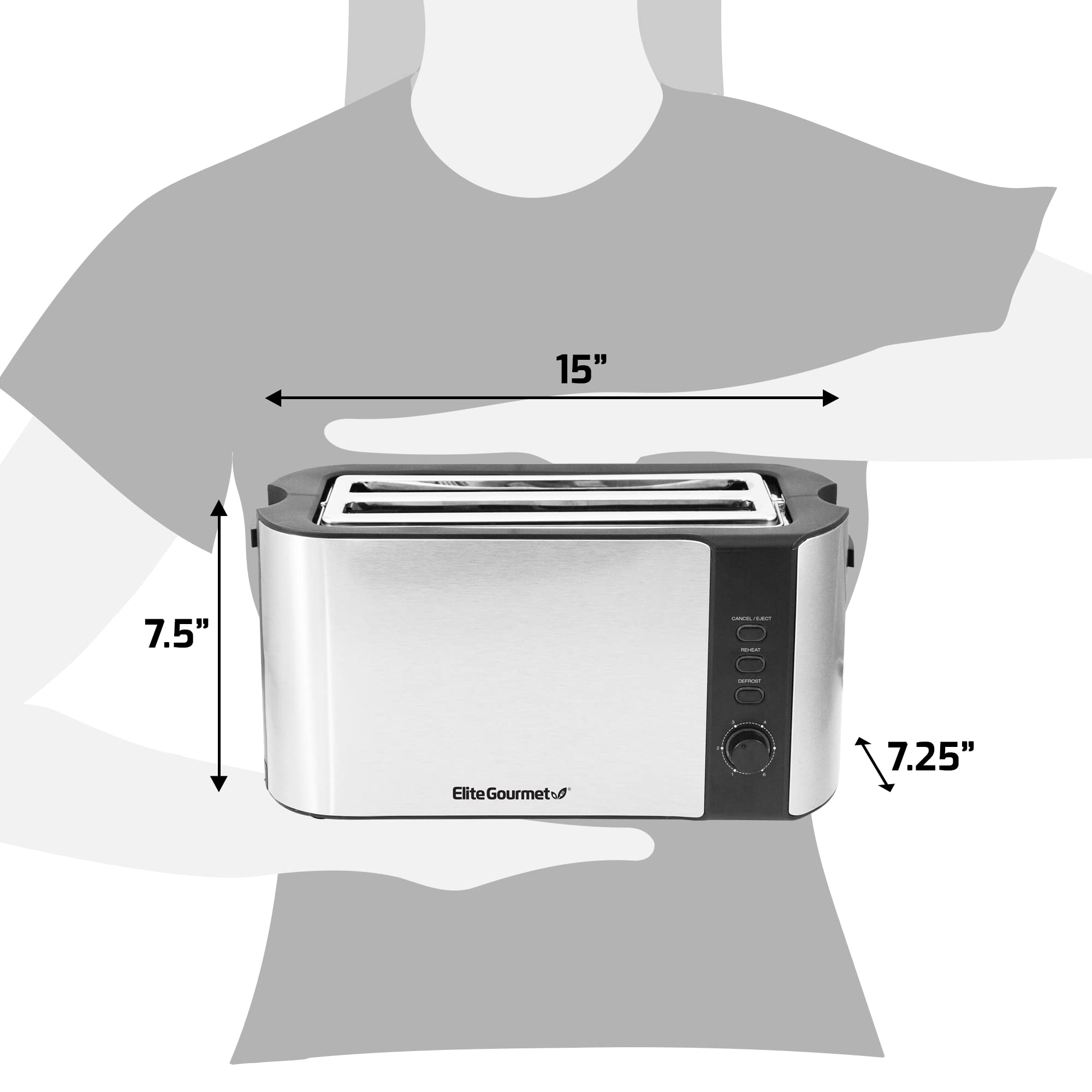 The Stainless Steel Long Slot 4 Slice Toaster can toast a wide variety of your favorite breads. The large toasting slot can accommodate for longer, rectangular slices of bread such as sourdough or other artisanal loafs. It features 6 variable toast shade settings as well as Cancel, Defrost, and Reheat functions all encased in a sleek, modern, stainless steel housing. The extra long space saving design easily fits 4 slices of toast while not cluttering your countertop.