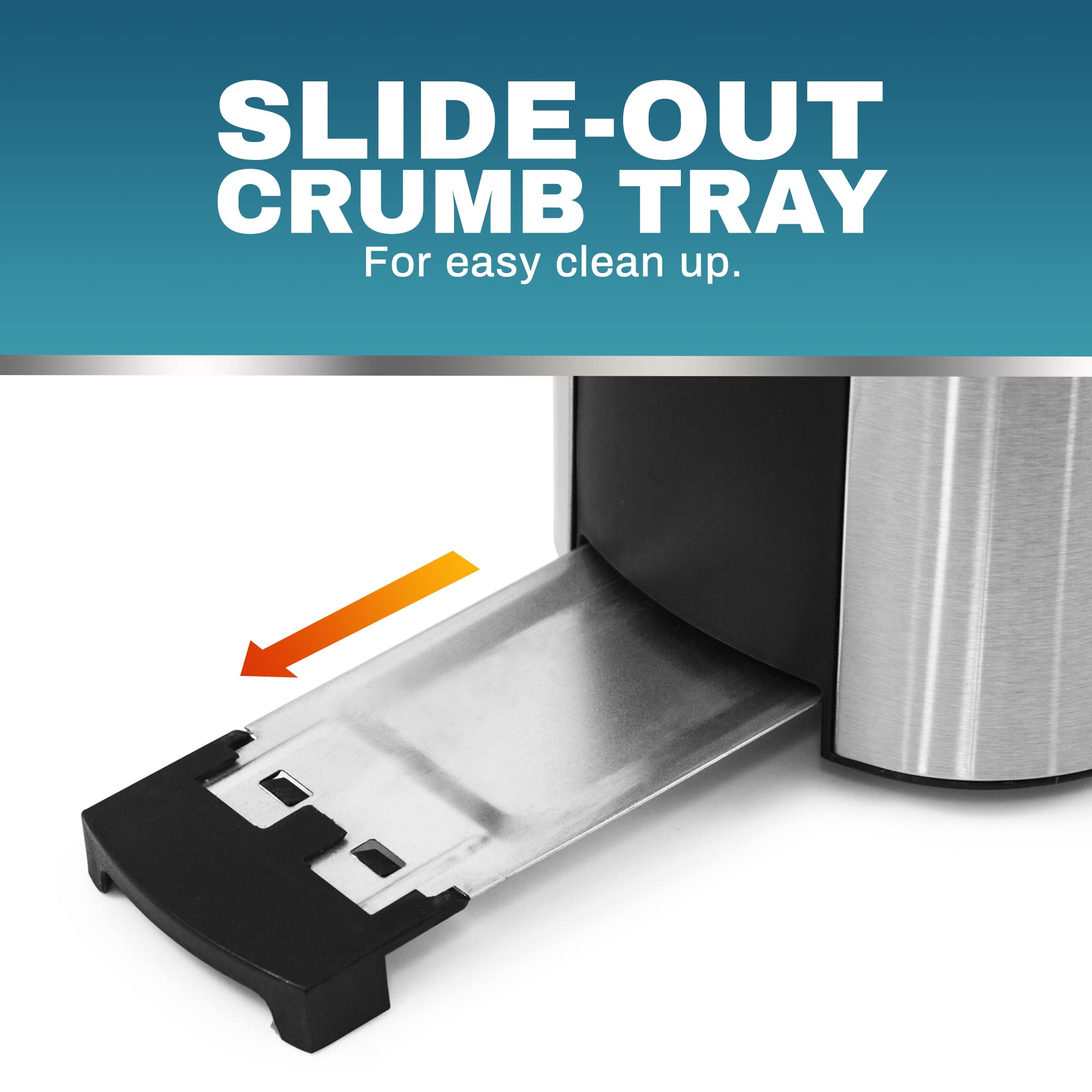 DROP DOWN CRUMB TRAY & CORD STORAGE for quick and easy cleanup of crumbs and debris & no unsightly cords