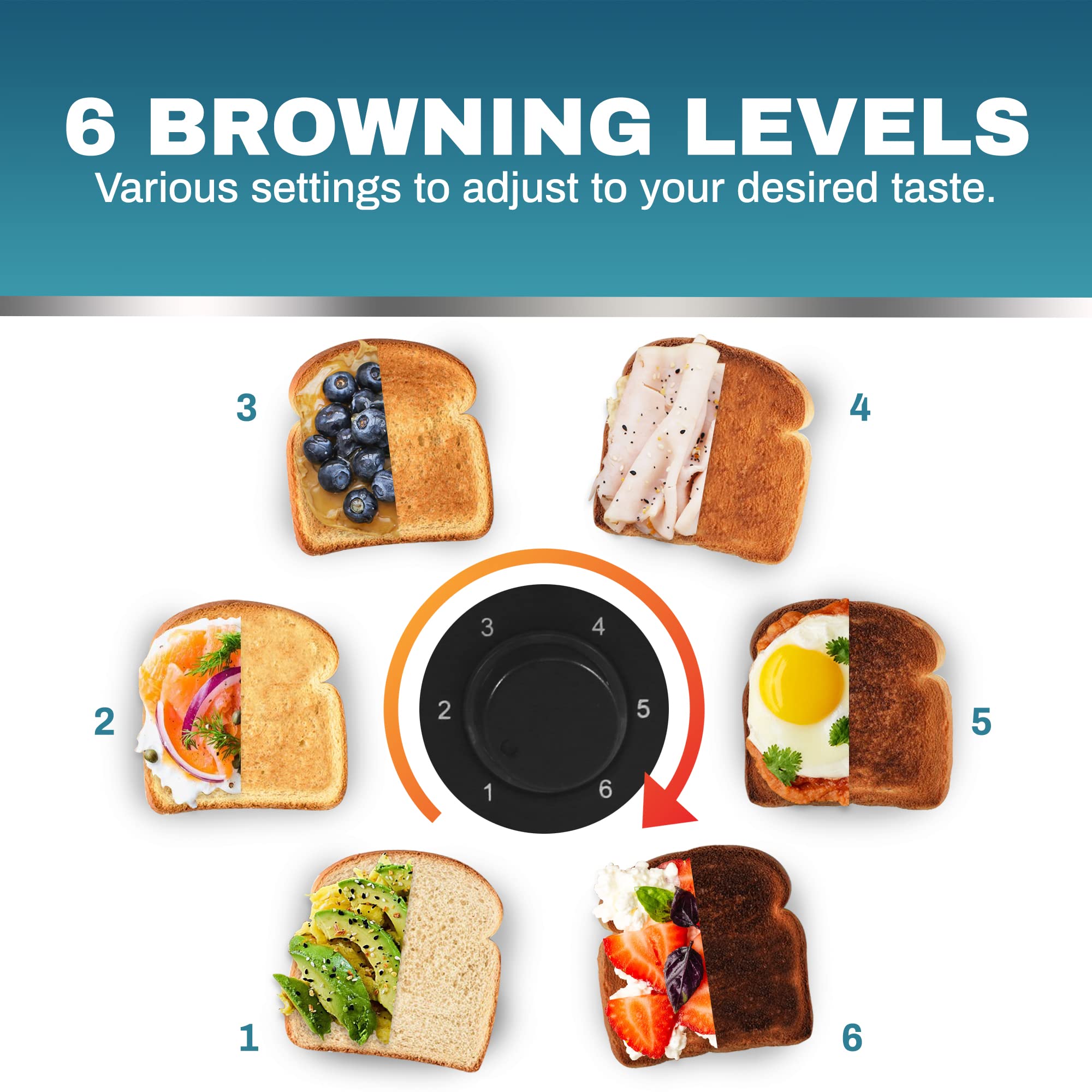 6 ADJUSTABLE TOASTING LEVELS to select the perfect browning shade for your bread. From slightly warm to dark and crunchy
