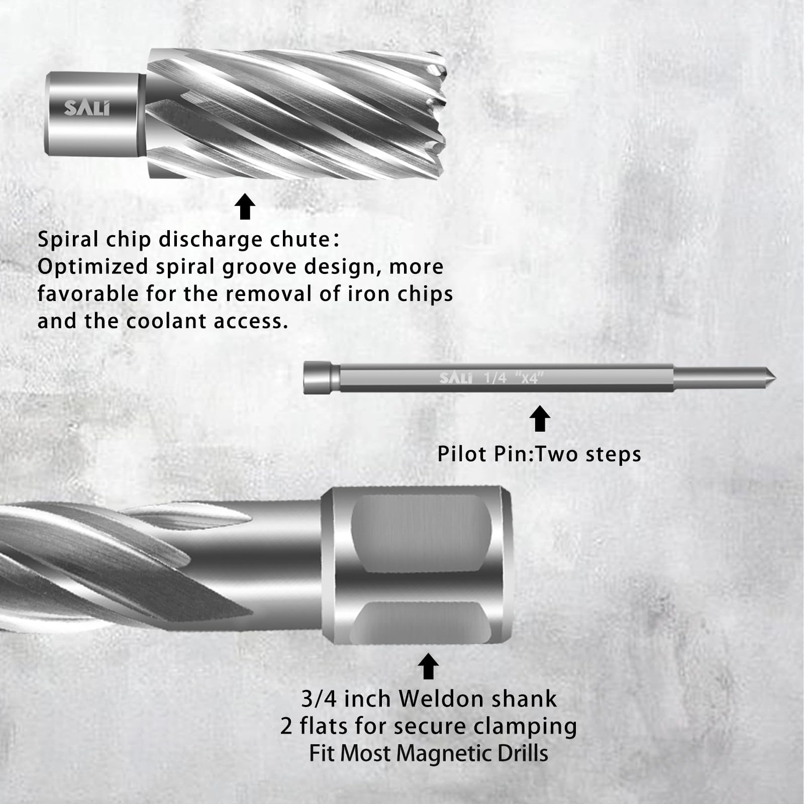 Cnc-machined high precision annular drill bit set with 3/4 inch weldon shank (with 2 flats) for secure clamping and edge finish designed for smooth, reamed, burr-free edges of drilled holes. Use a firm steady pressure throughout the cut for better results