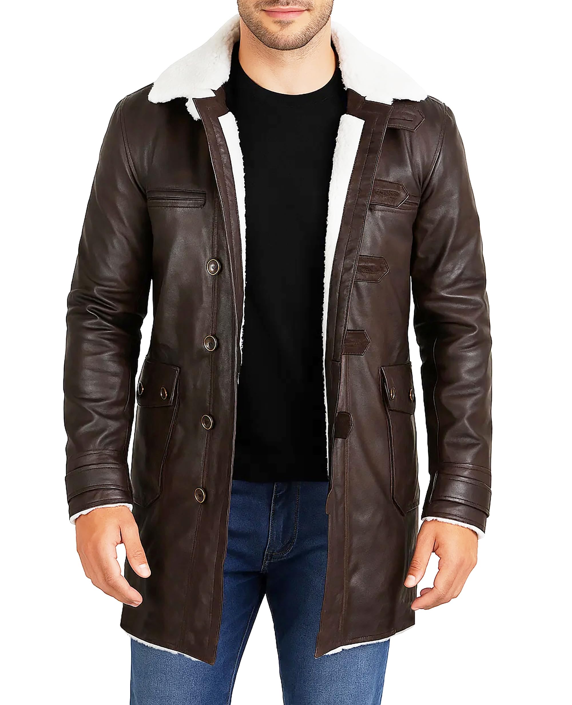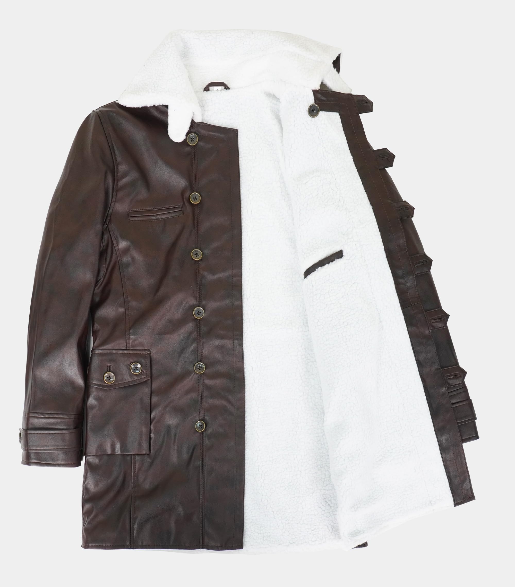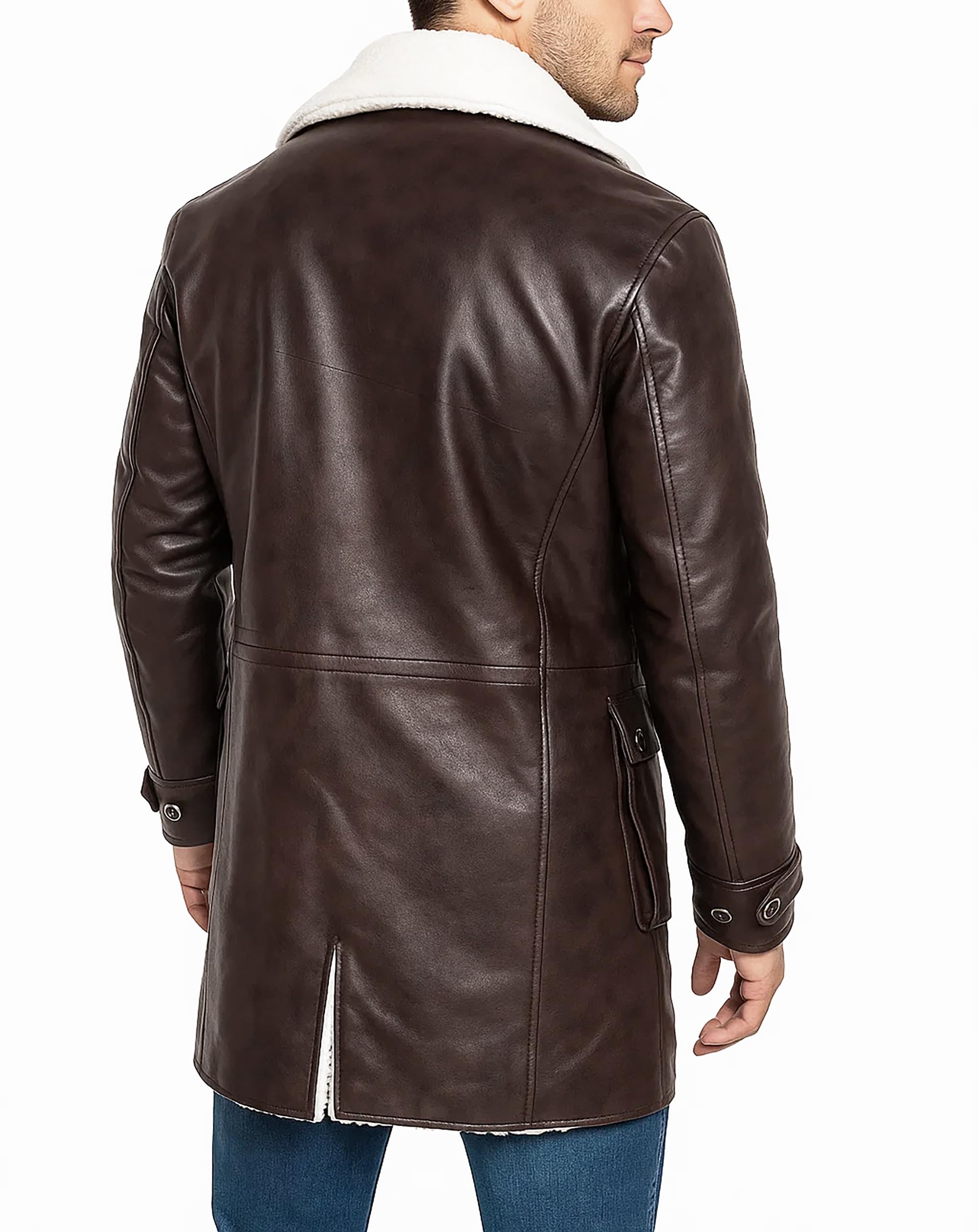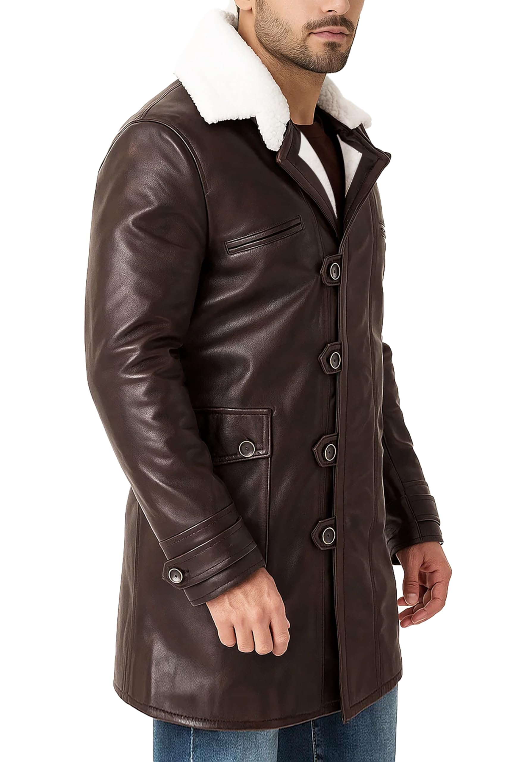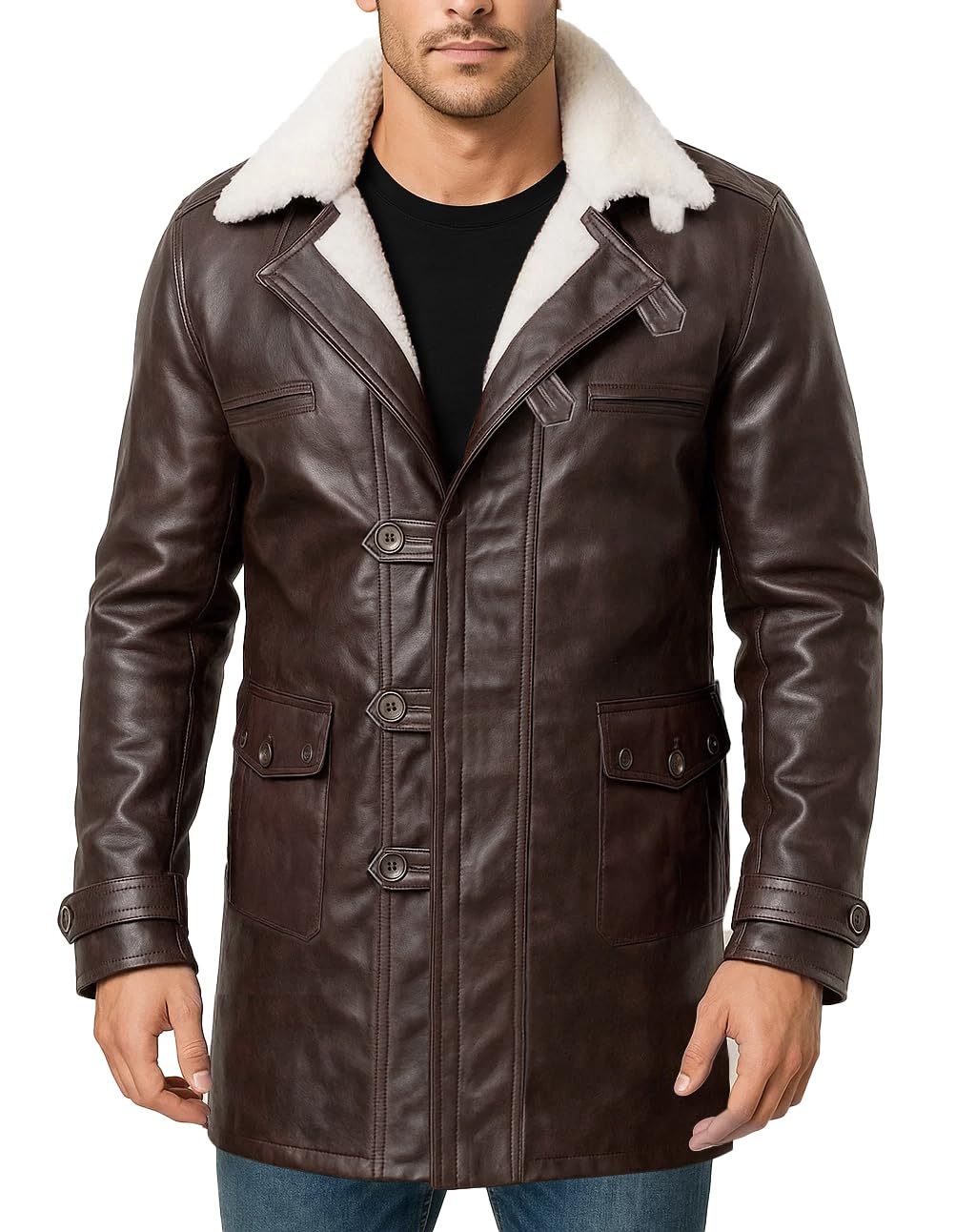 This mens overcoat is made with a combination of faux leather and soft artificial fur shearling as an inner lining for premium comfort and warmth.