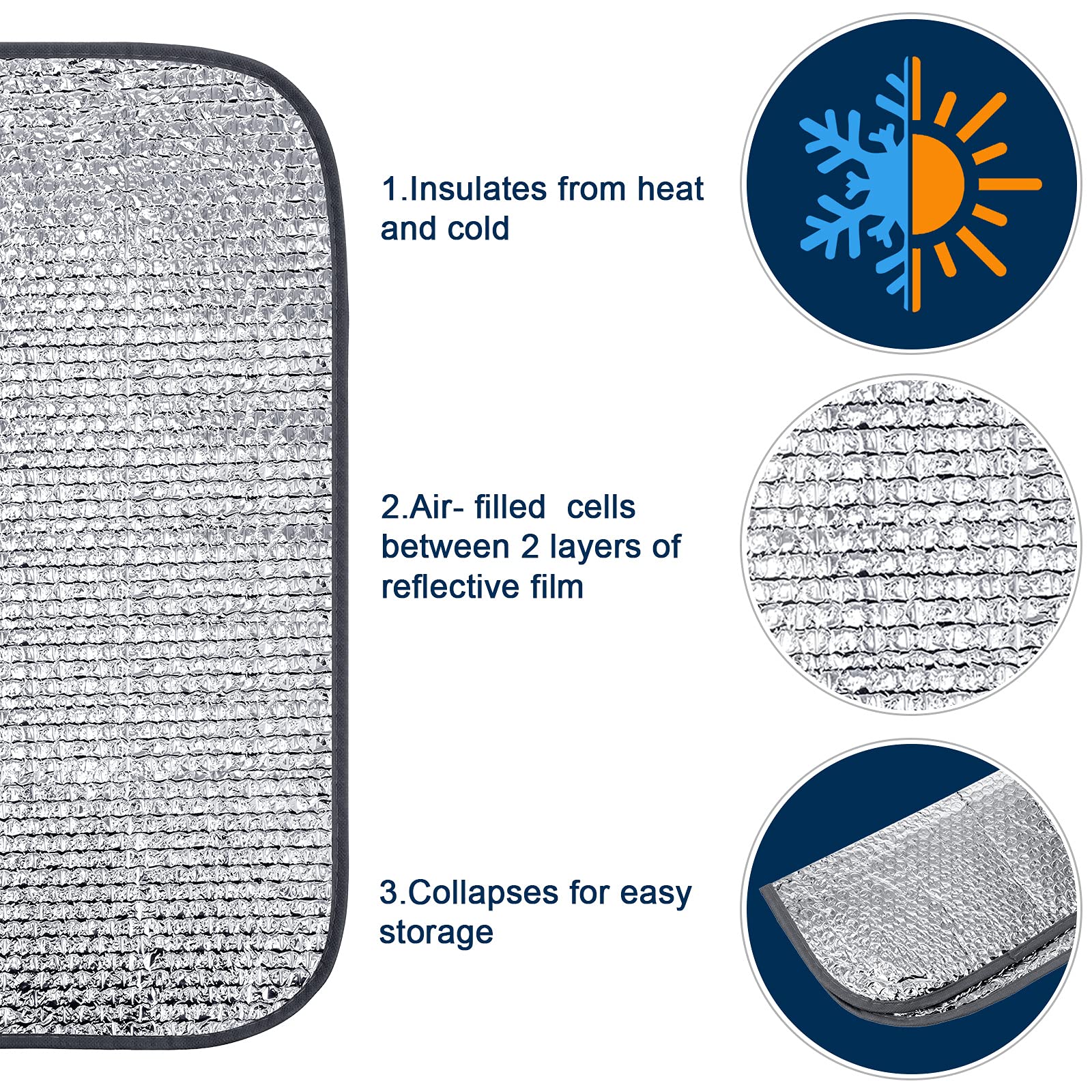 Three Layer Material Structure: the RV blackout window shade comprised of three layer material, the outer reflective silver aluminum foil bubbles layer repels sunlight and UV rays, the middle insulation cotton layer or bubble type material blocks heat, and the inner black or silver layer ensures privacy, ensuring your comfort no matter the season