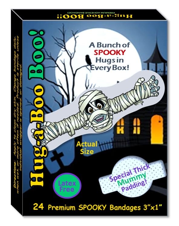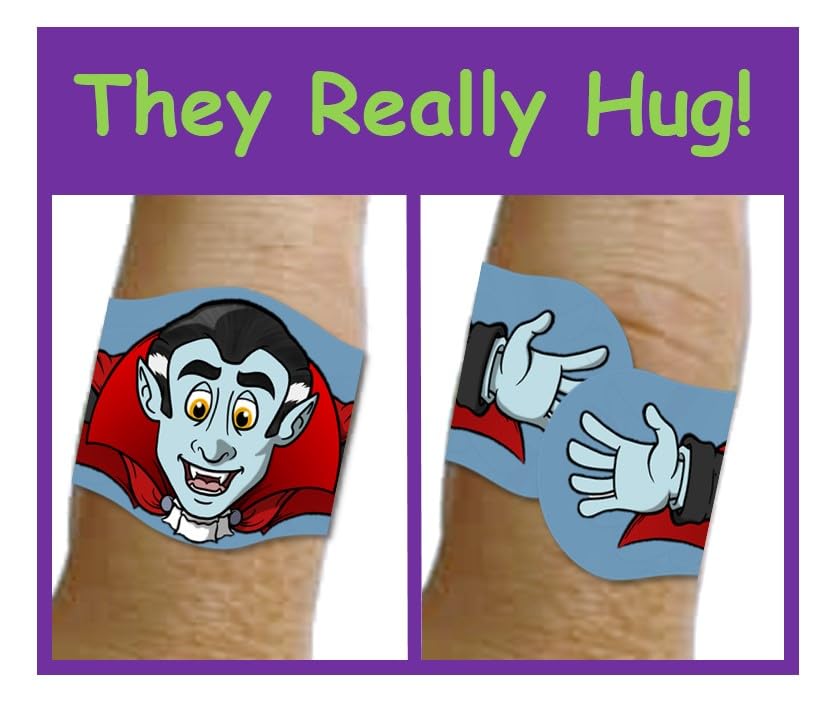 Every BooBoo Needs a Hug, so we created a bandage that gives one - and now our Amazing Hug-a-BooBoos feature your Favorite Monster Characters - Vampire, Witch, Wolfman and Mummy! The SUPER Fun Monster Characters on Hug-a-BooBoo Premium adhesive bandages all have outstretched arms, just waiting to give a big Spooky Hug to any scrape or cut! No booboo - no problem! You can wear one anyway! Great Halloween gift!!