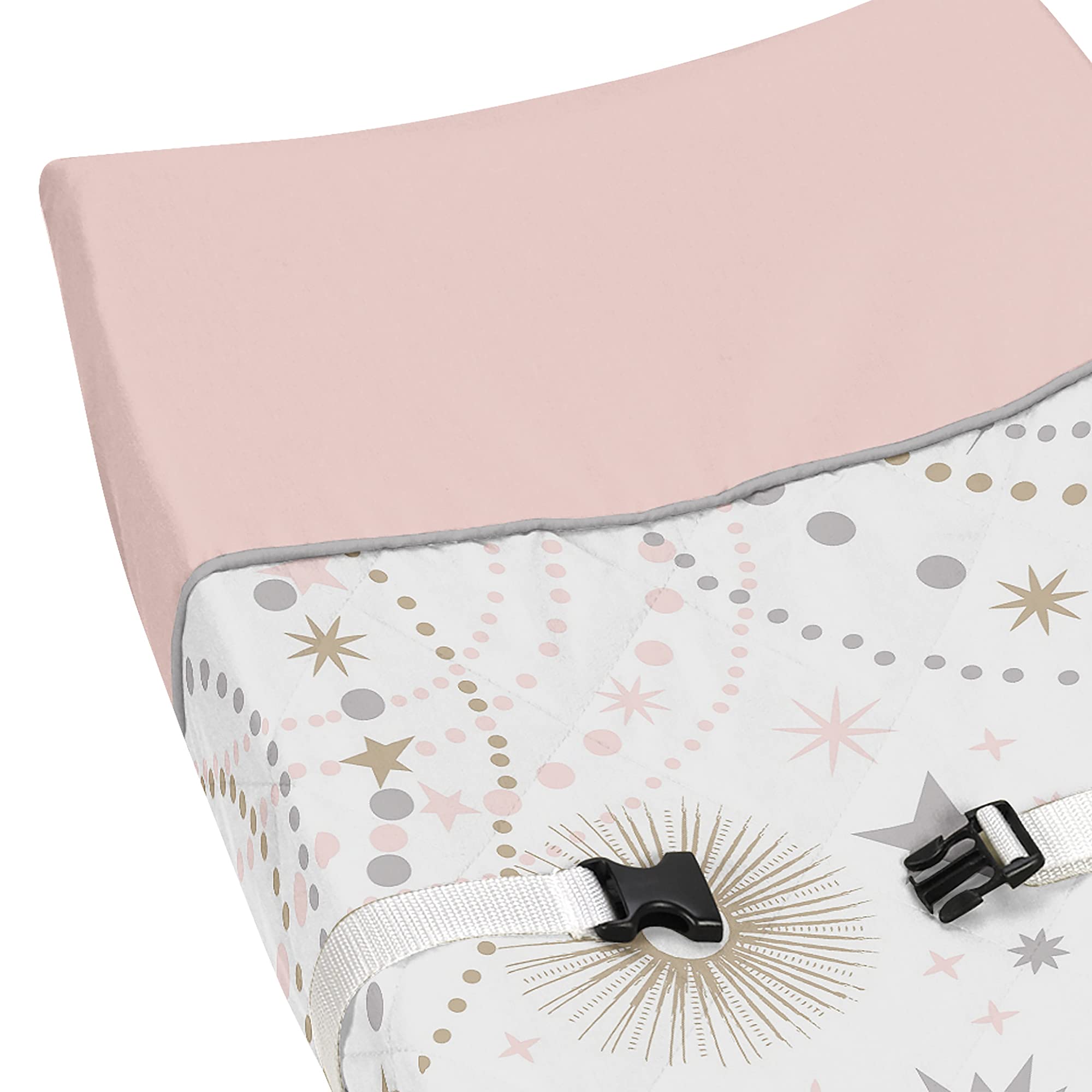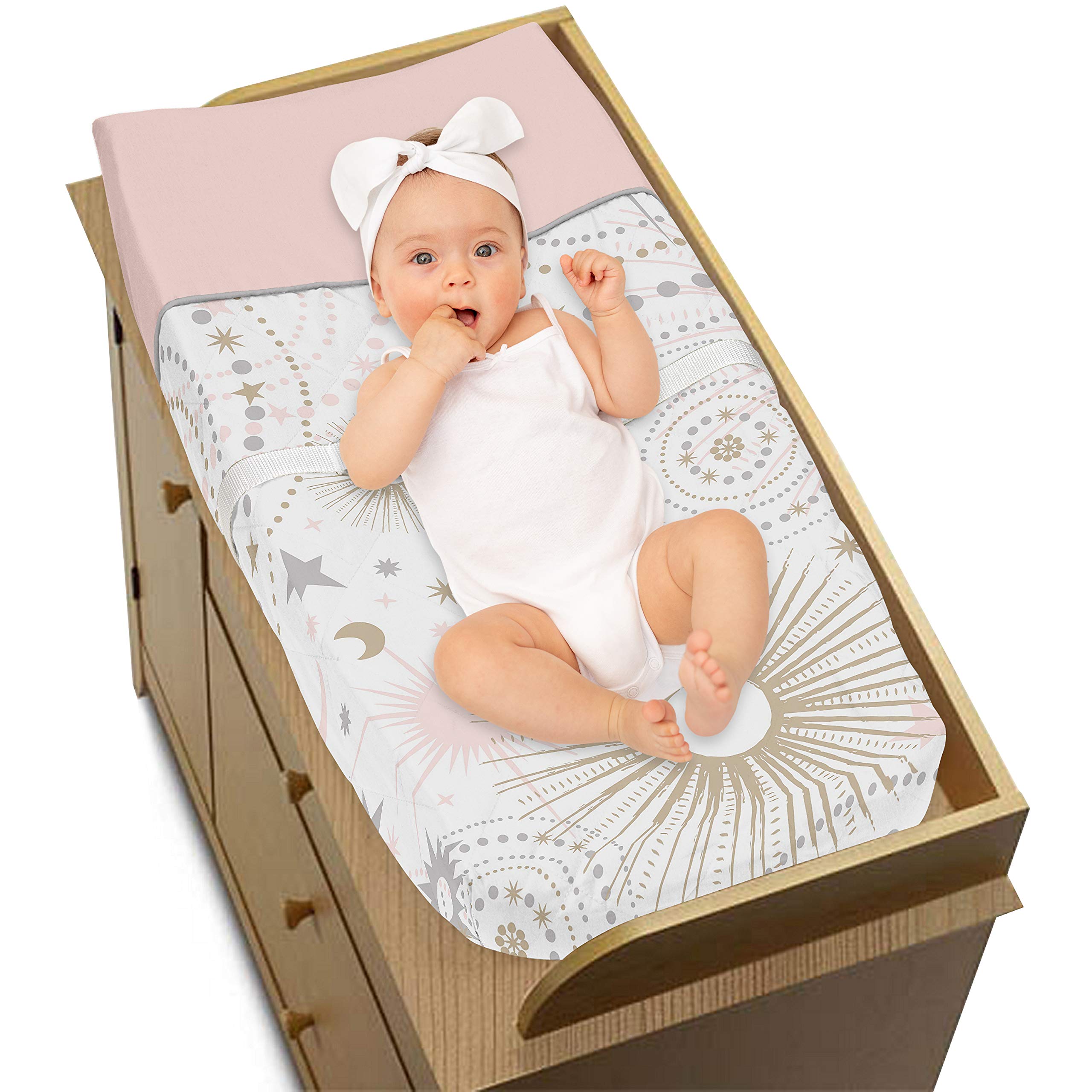 This brushed microfiber diaper pad cover features an exclusive design of blush pink, gray, gold and grey shabby chic celestial space sky moon and stars print for the Celestial Pink and Gold Collection.