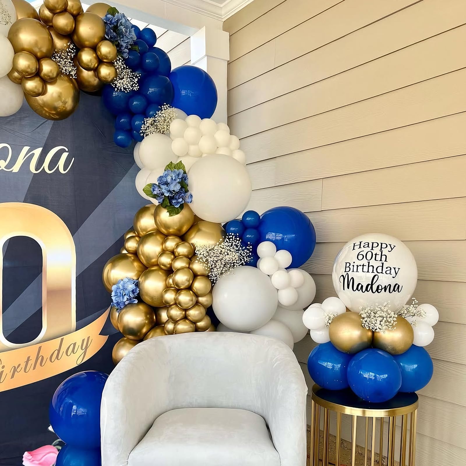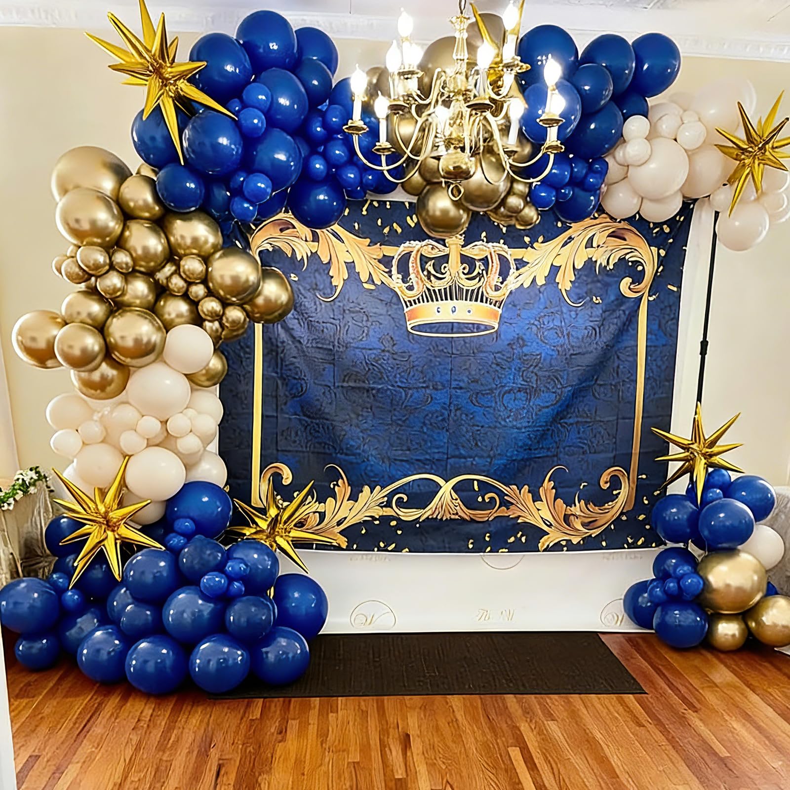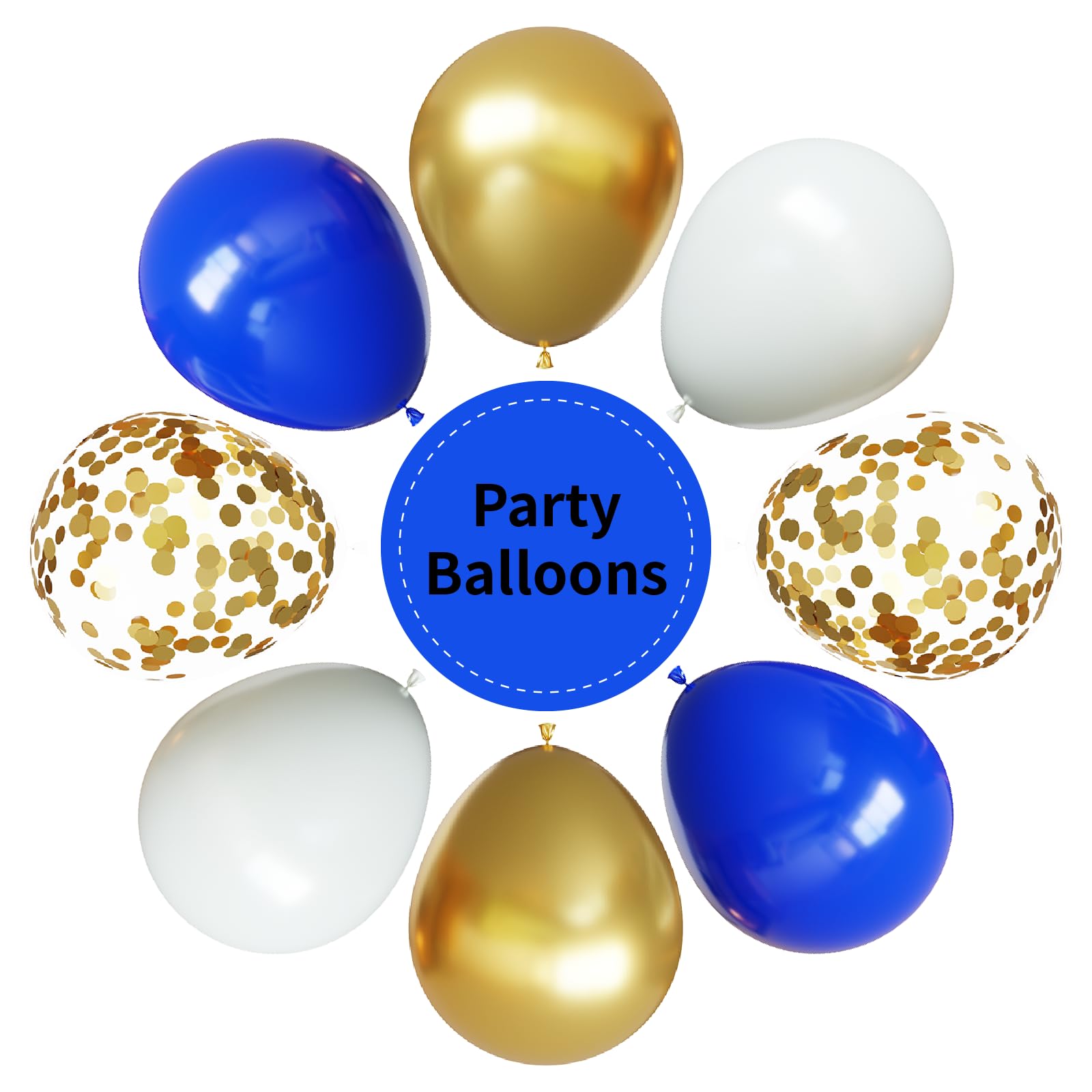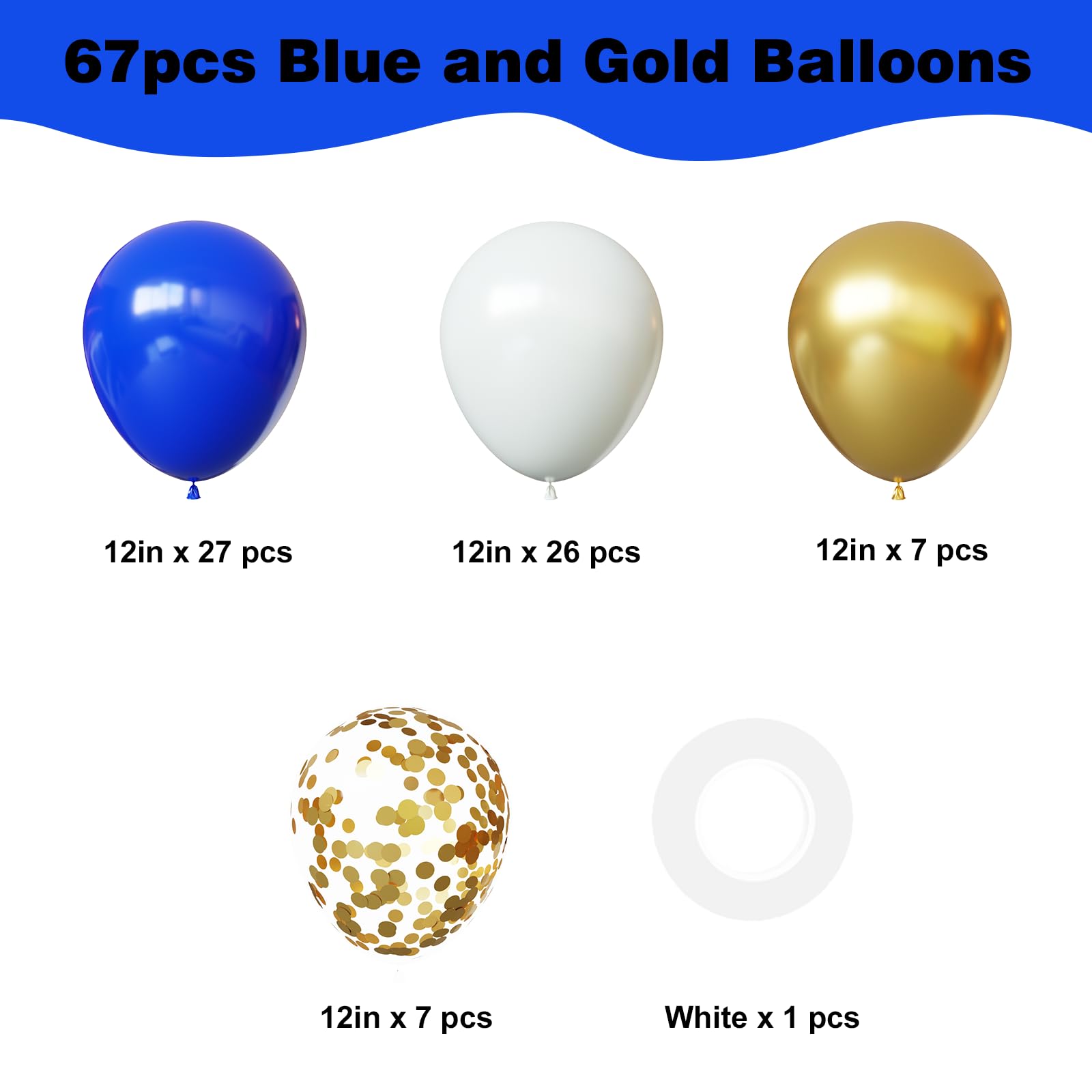 {All-in-One Kit} This blue and gold balloons kit includes everything you need to create a stunning decoration, 26pcs royal blue balloons, 26pcs white balloons, 8pcs metallic chrome gold balloons, 7pcs gold confetti balloons and 1 roll of white ribbon. The size of the balloon is about 12 inches after inflation. this beautiful blue and gold party balloons is sure creating that is both chic and stylish atmosphere unforgettable party decoration.