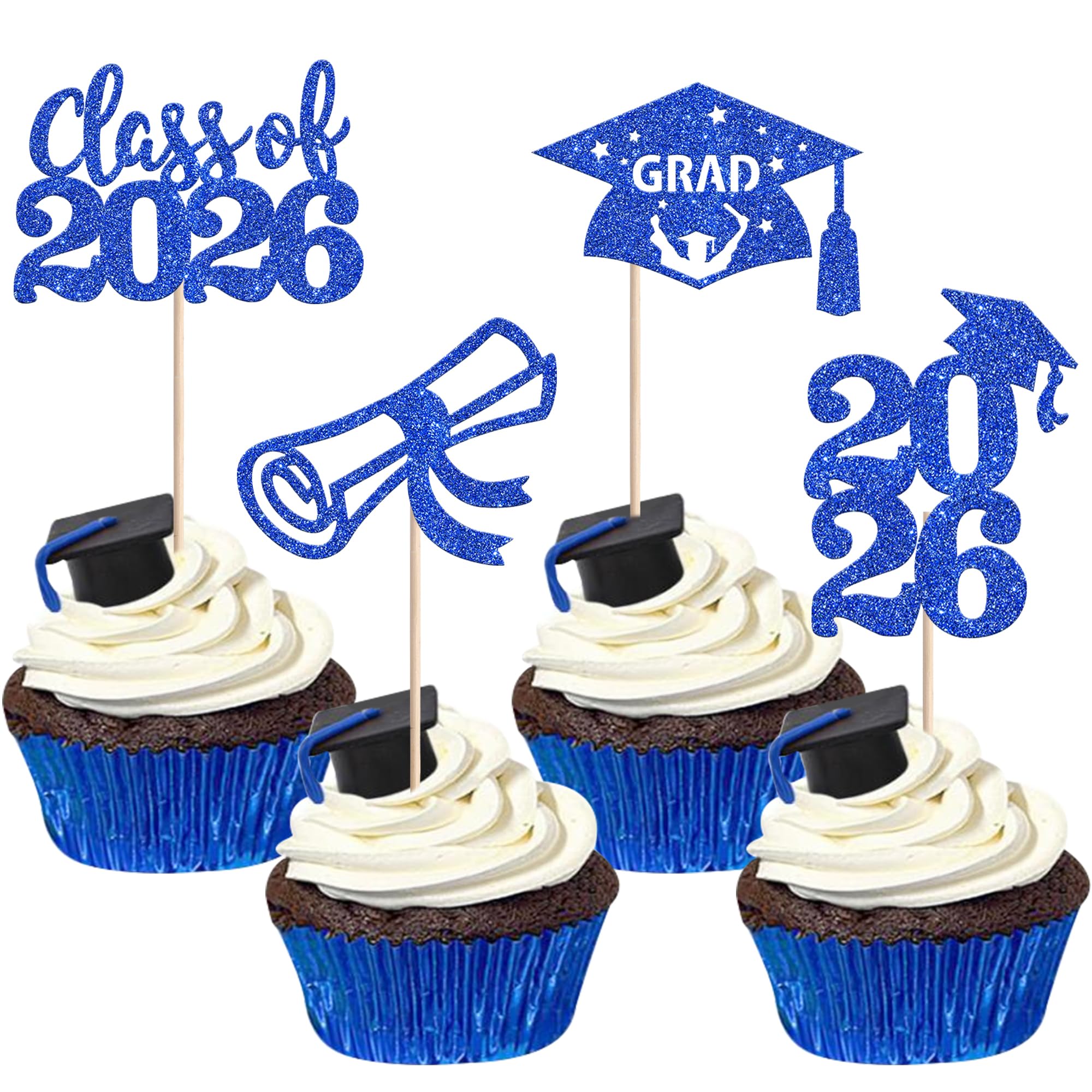 2026 Graduation Theme Party Cupcake Toppers Decorations Perfect for 2026 graduation theme party cupcake decorations, such as kindergarten, primary, junior, senior high school, college, Master or Ph.D. graduation. Pack of 24 pcs, 6 pcs of each design. The size is 2*3.9/ 2.3*4.1/ 2.2*4.1/ 1.5*4.5 inch ( with stick ) Made of high quality paper card stock,thick and thick and sturdy. These cupcake toppers are single glitter, the back is white, and they are intended for decoration only, please do not put them in oven or microwave. If the item you received has any defects, please contact us immediately. we will deal with it within 24 hours.