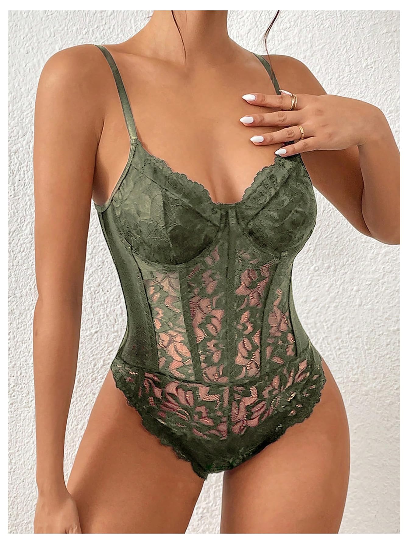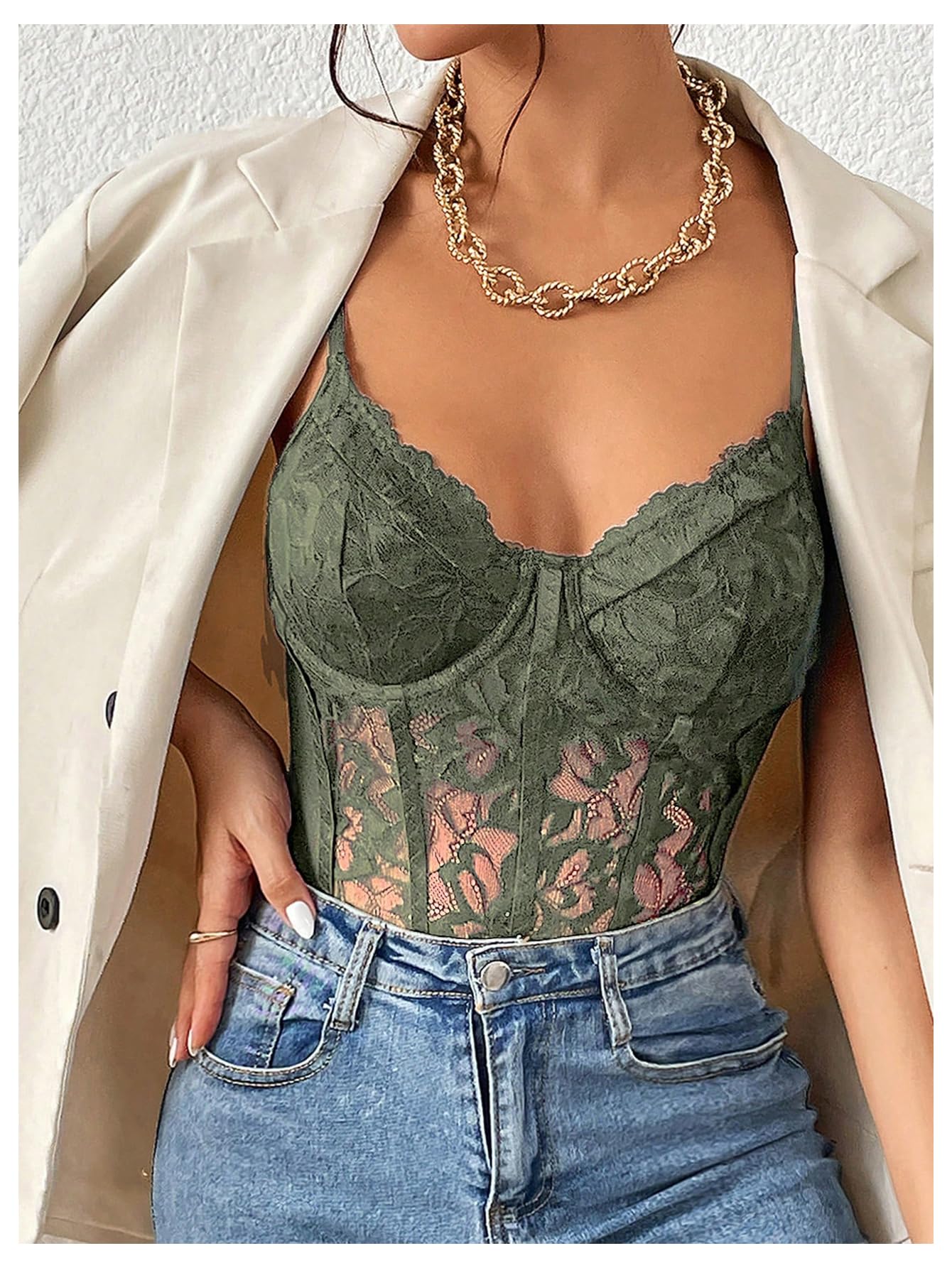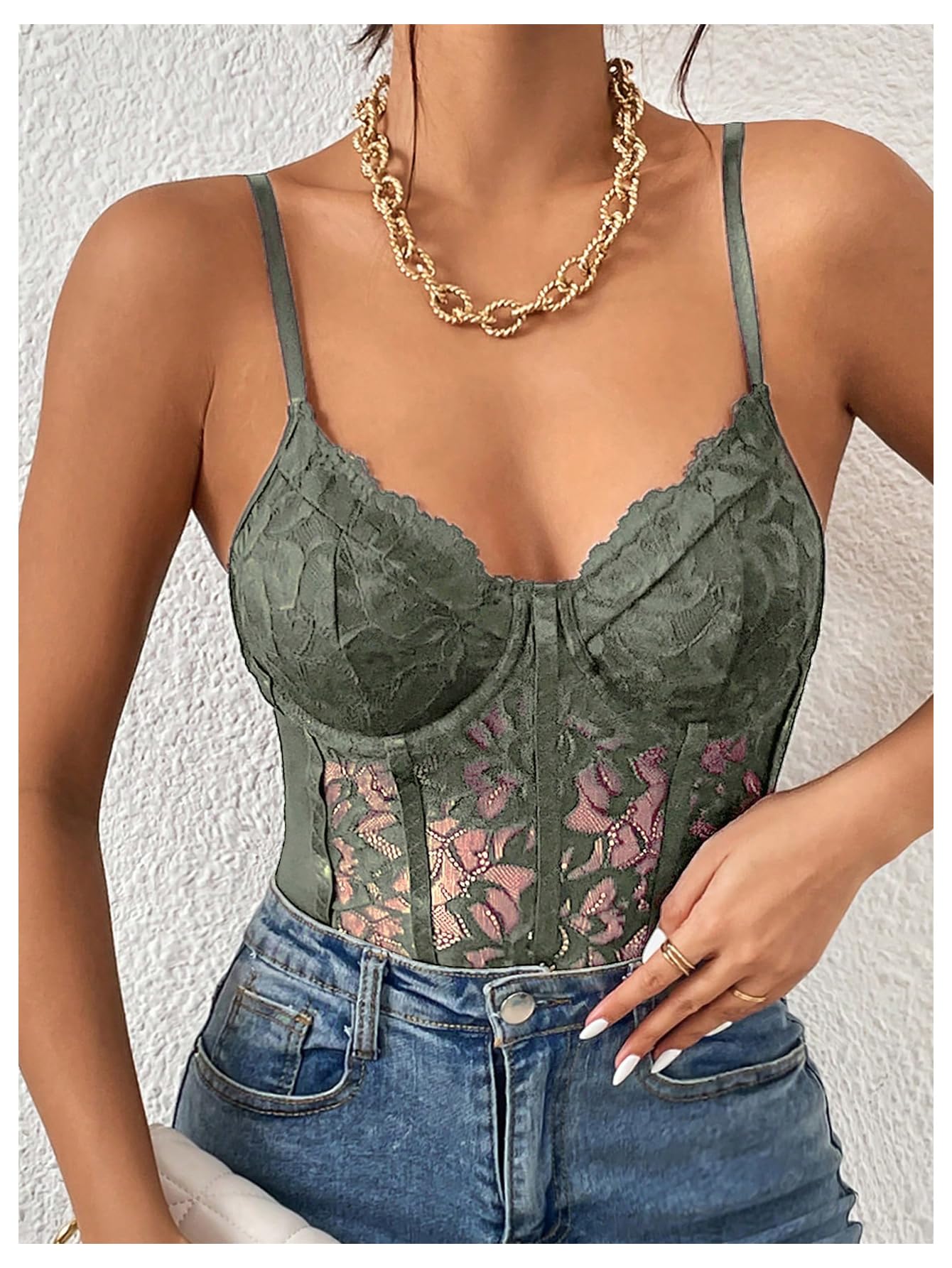Features: Charming shapewear design, contrast lace, lace bustier, cami top, sheer, plain, spaghetti straps, sleeveless, slim fit, mesh and see through bodysuit, lift up your breast lightly, makes you feel good and shows off your curves; Paring this croset bodysuit with casual jeans, skirts, under sweater, blazer, jacket, coat, high-heeled shoes for a fashionable look; An elegant sexy outfit in your wardrobe!