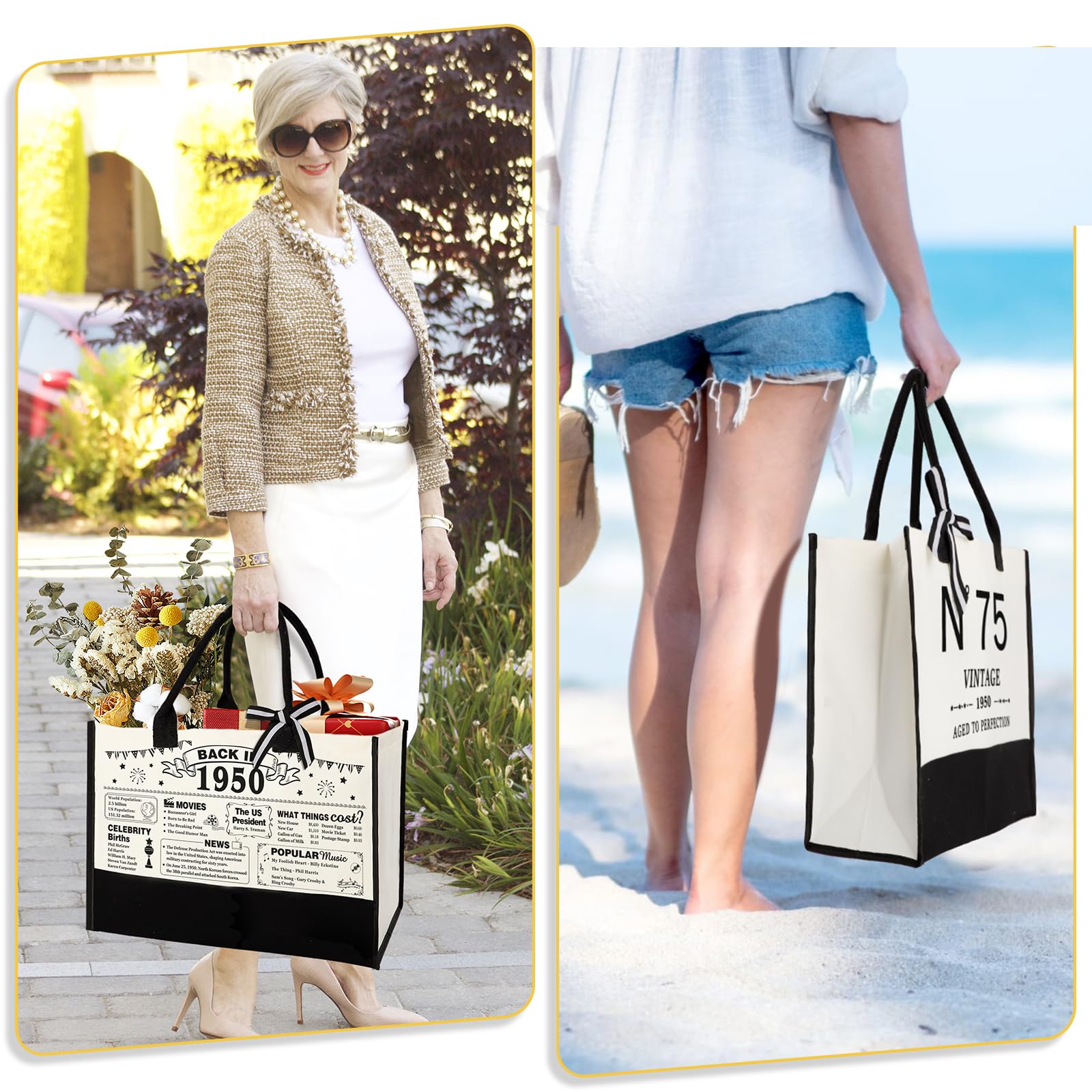 Great Gift for Her 75th Birthday: This gifts set for 75th birthday women contains: 1 X 1950 beach bag, 1 X makeup bag, 1 X back in 1950 poster, 1 X greeting card. Unique canvas tote bag gifts set will be a adorable gift for women's 75th birthday. This birthday 75 gifts themed idea makes the perfect choice for putting a smile on her face on their special day.