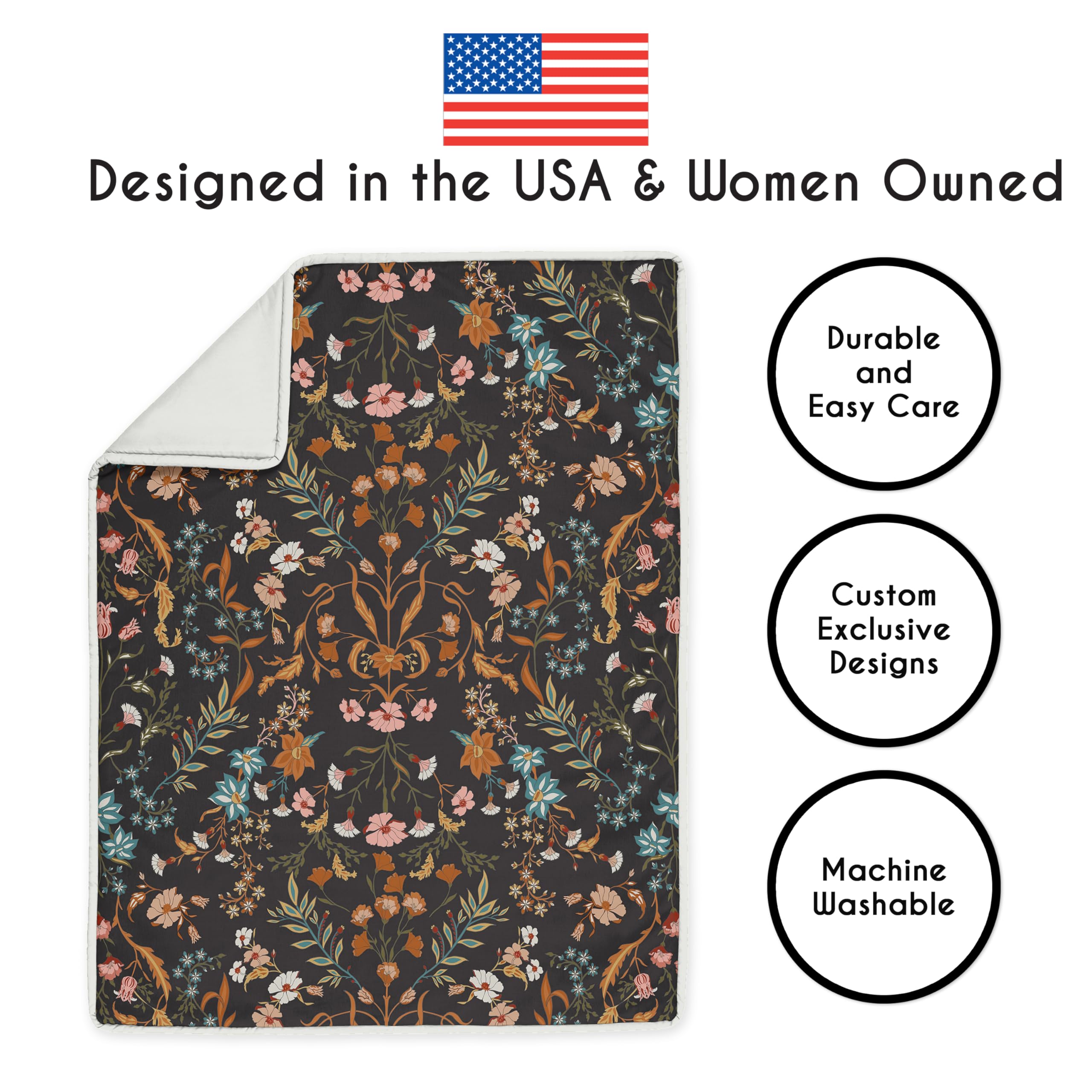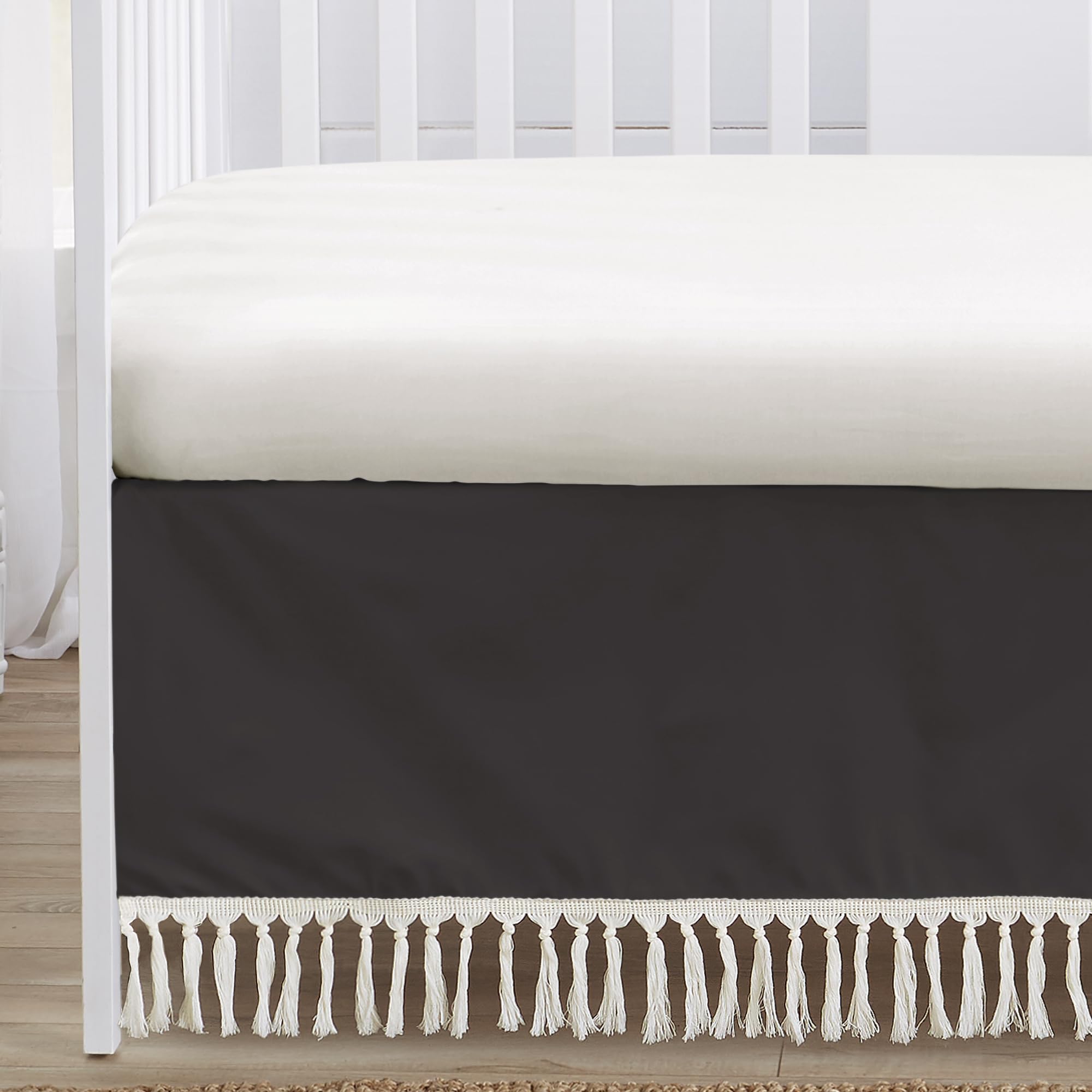 BLACK FLORAL THEME: This baby girl crib bedding set boasts a crib blanket featuring a farmhouse, cottagecore, wildflower flower, wild garden print that reverses to a solid off white. The solid black skirt is adorned with delicate shabby chic bohemian macrame fringe detailing. The solid ivory breathable crib sheet has elastic sewn around the bottom edge for a secure fit on most standard cribs. The matching diaper stacker keeps nappies conveniently organized. Machine washable. Tumble dry low.