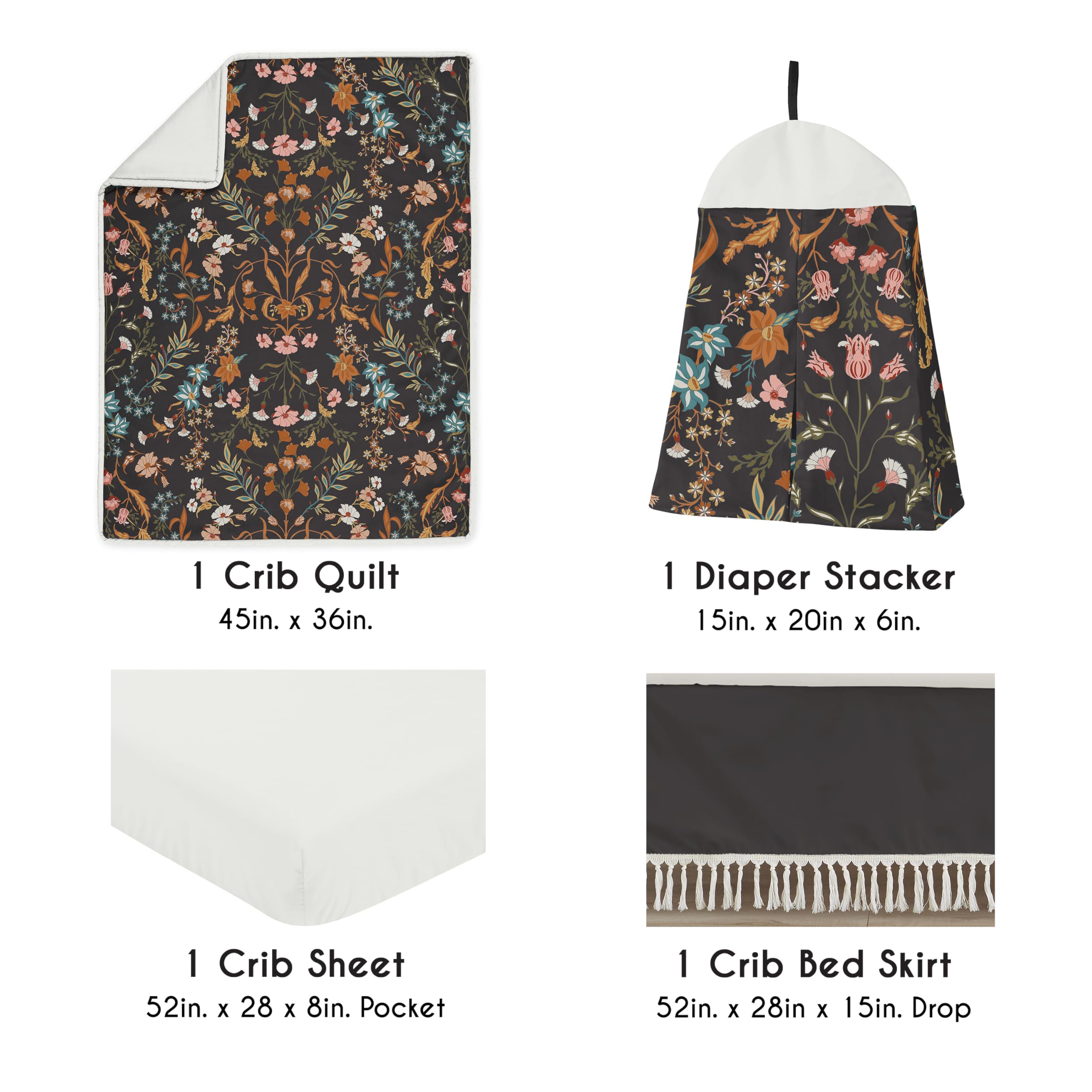 4 PIECE CRIB BEDDING SET INCLUDES: Crib Comforter (45in. x 36in.), Fitted Crib Sheet (52in. x 28in. x 8in. Pocket), Crib Skirt (52in. x 28in. x 15in. Drop) and Diaper Stacker (15in. x 20in. x 6in.). An infant crib set including all the baby essentials is a great value compared to purchasing pieces separately. This baby crib set is made of soft microfiber fabric & features a dark botanical color palette of black rust orange teal turquoise blue that will bring your cottagecore baby room together.