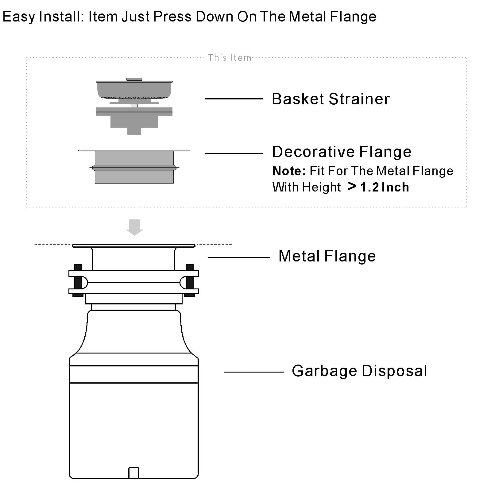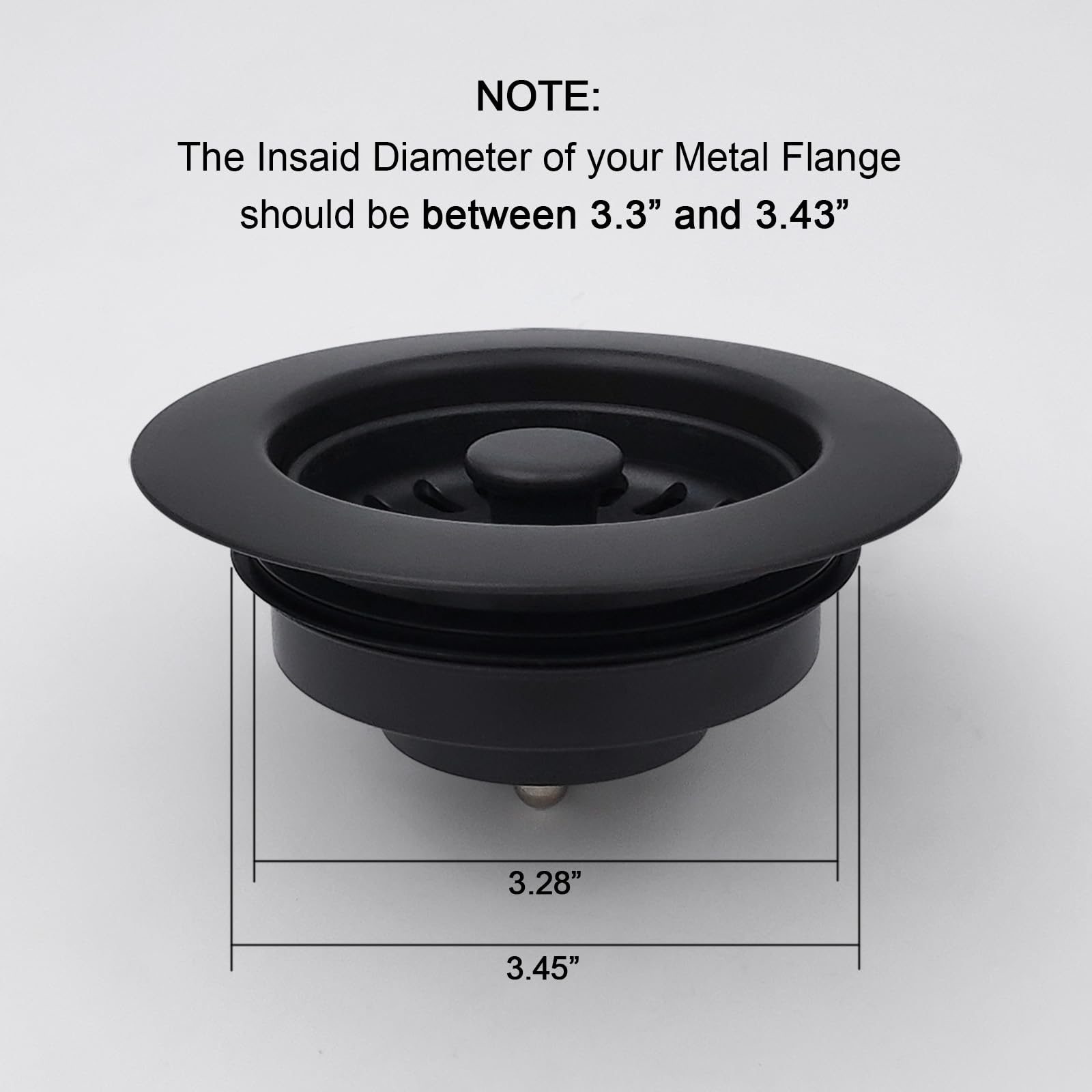 Matte black: Fit into most US standard garbage disposal metal collars. Note: Before purchasing, make sure your metal flange has an inside diameter between 3.3" and 3.43"