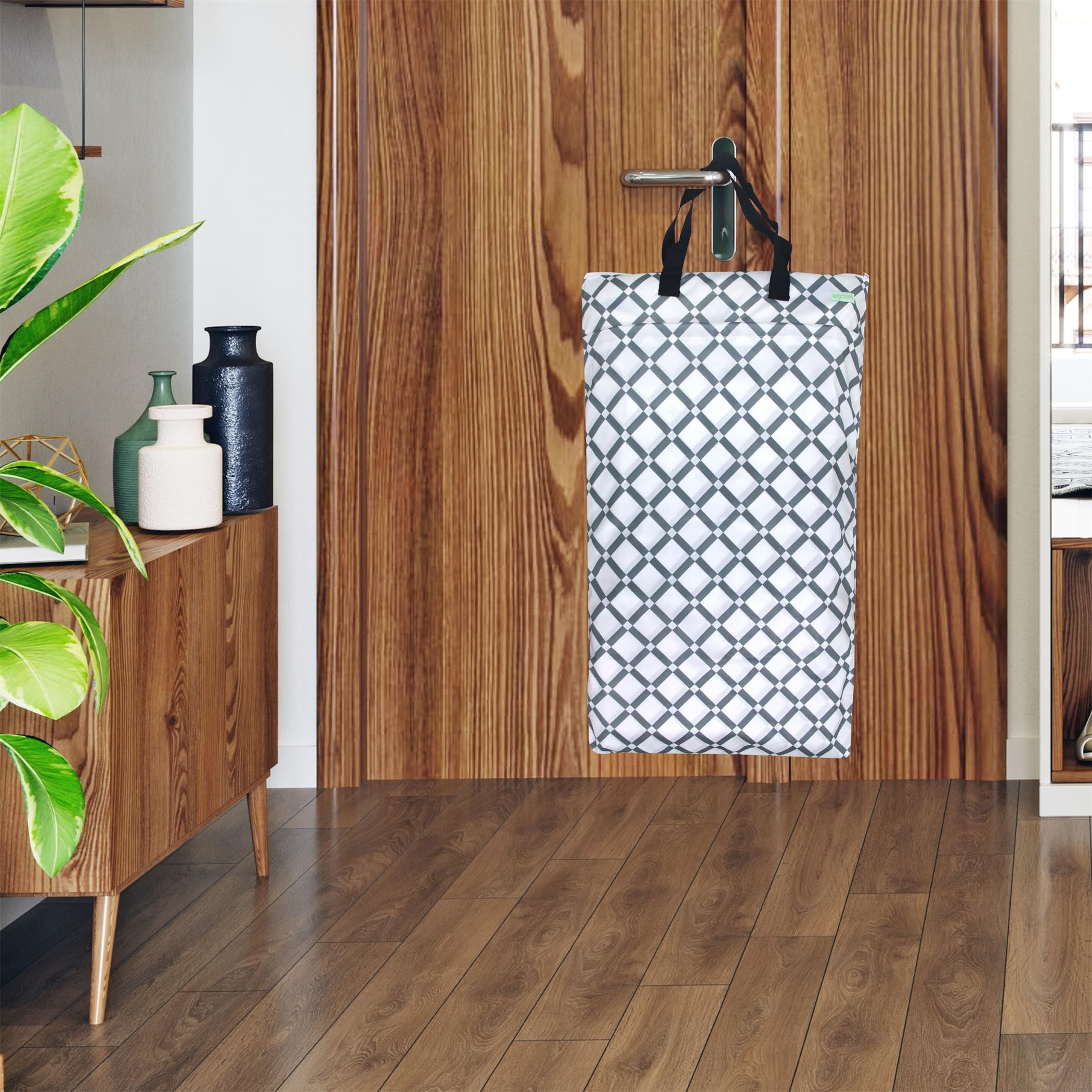 EASY CARRY & MULTIFUNCTIONAL - Hanging Diaper Pail is ideal for tight spaces or families prefering not to use a traditional diaper pail liner with a liner; You can hang it anywhere like door knobs, towel rails, door hangers, hooks; It is great for storing cloth diapers between washes, traveling with cloth or as a laundry bag for family