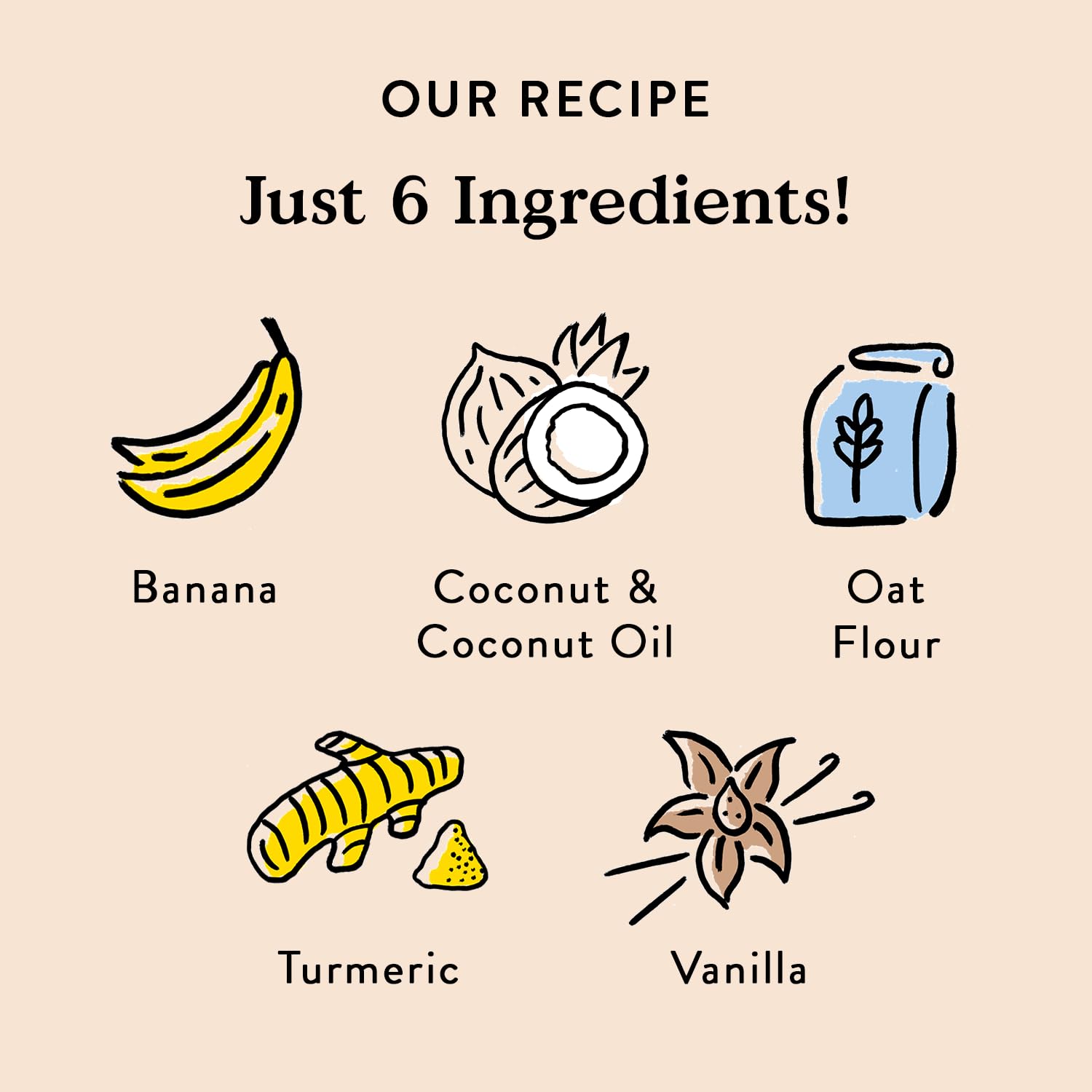 Perfect for Everyday Treating: With just 4 ingredients (oat flour, banana, coconut, vanilla and turmeric!) and only 12 calories per treat, you can feel good treating your favorite pup to this yummy recipe.