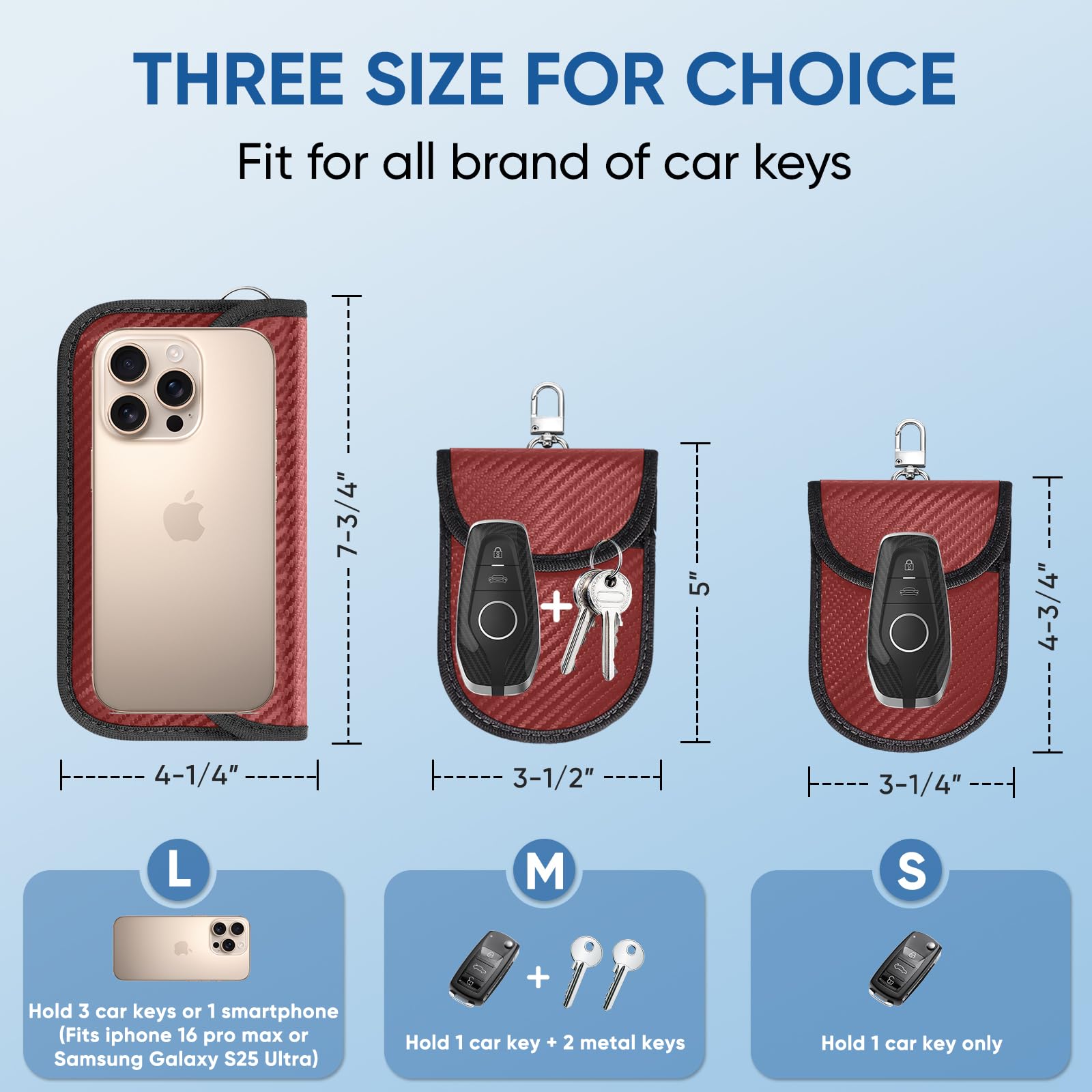 Easy to Carry: Available in sizes 3.25" x 4.75" (S), 3.5" x 5.0"(M), and 7.75" x 4.25"(L); Secure closable flap with elastic accommodates multiple sizes of keychains and small devices; The integrated keychain hole provides more flexibility