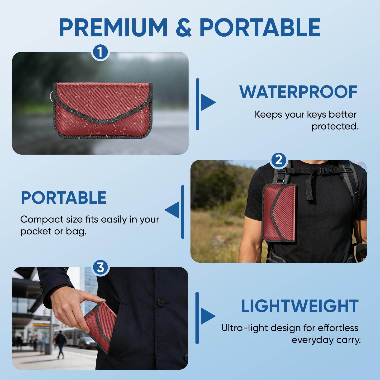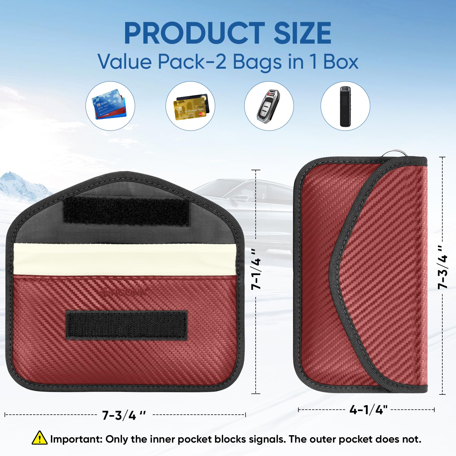 Convenience: The smaller/front pocket is anti-radiation, best for storing ID card, bank cards, etc; The larger/back pocket is for signal blocking, best for storing car key fobs