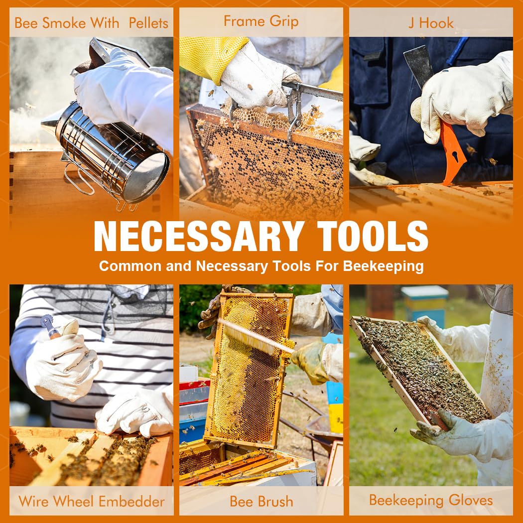 PREMIUM BEEKEEPING TOOLS: Our 13-piece beekeeping tool set includes everything you need to start or enhance your beekeeping journey. The hive tool features Bee Smoker, Smoker Pellets, Beekeeping Gloves, J Hook, Wire Wheel Embedder, Bee Brush, Frame Grip, Queen Bee Marking Tube, Queen Bee Cage, Uncapping Fork, Beekeeping Tool, Bee Feeder, Uncapping Knife