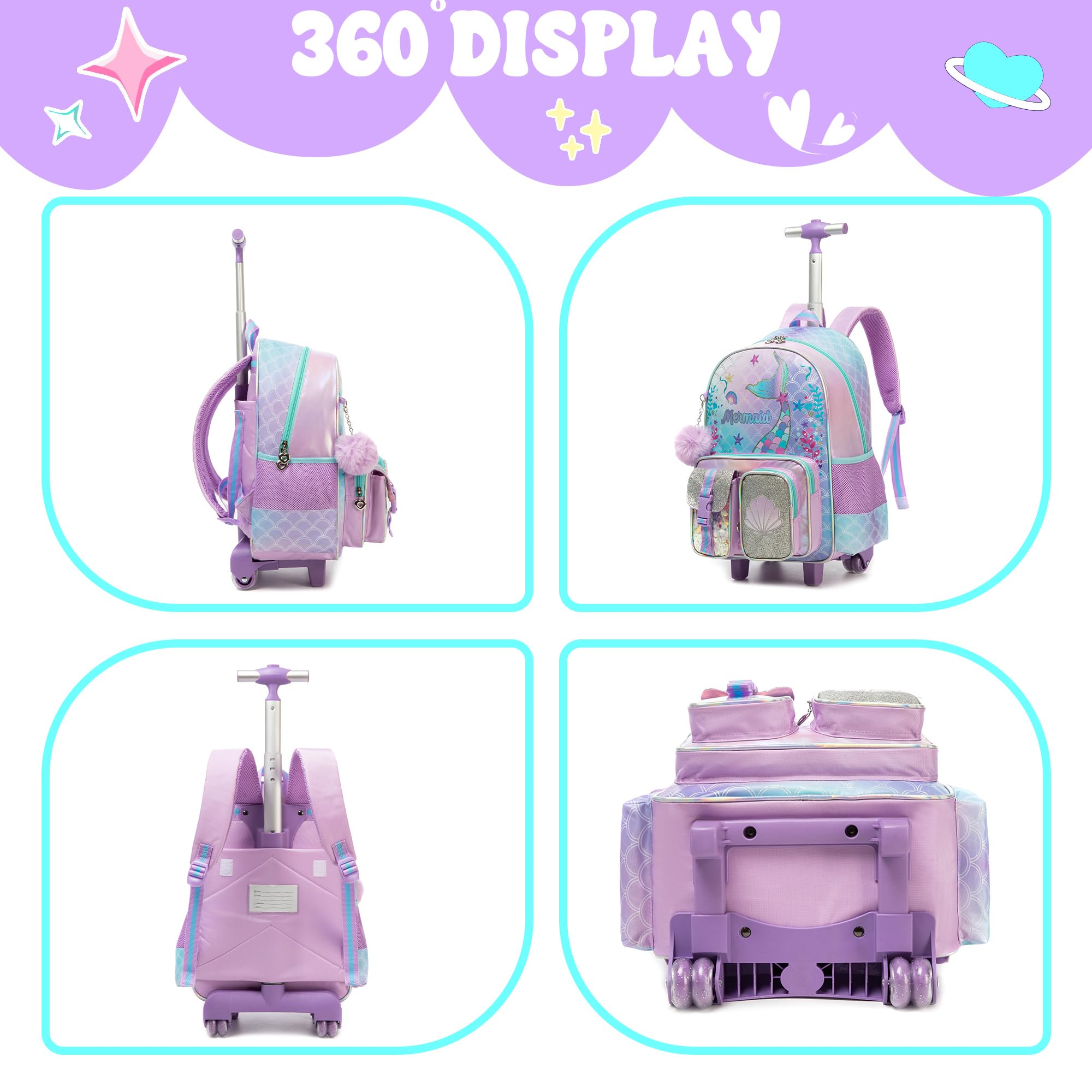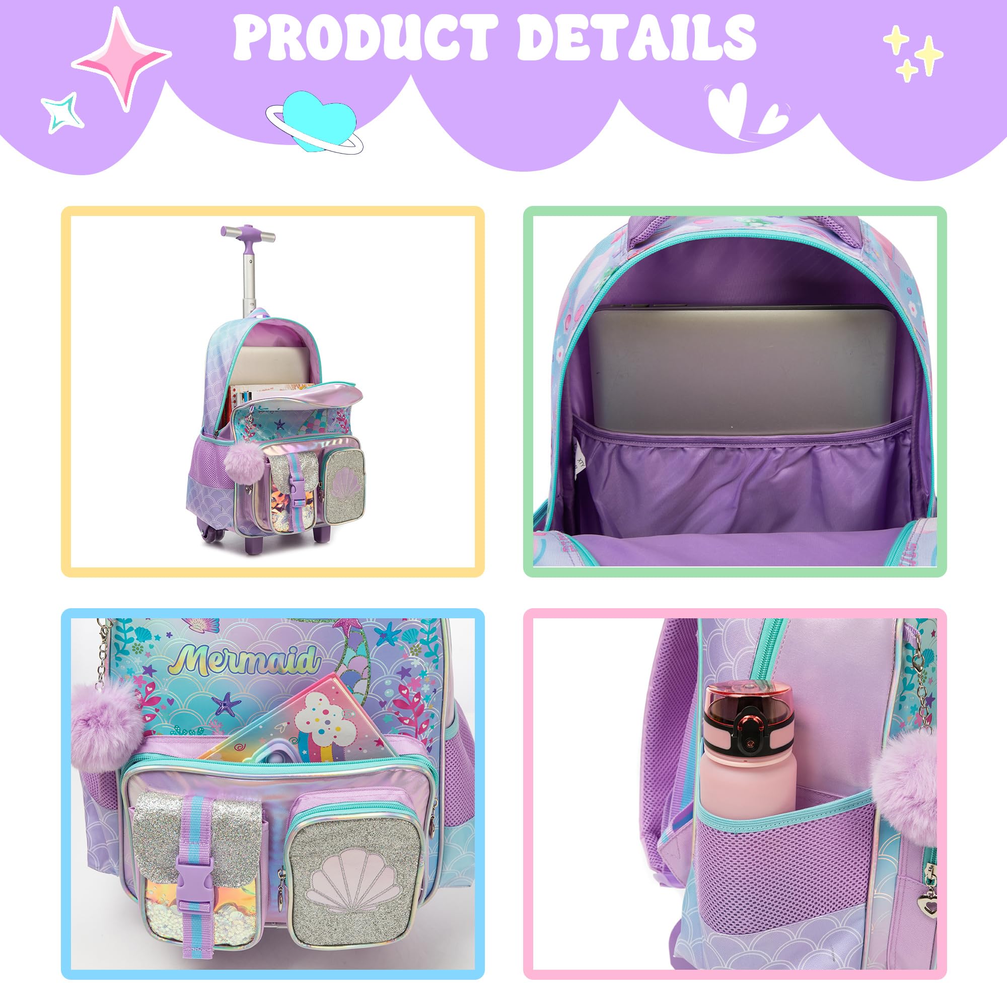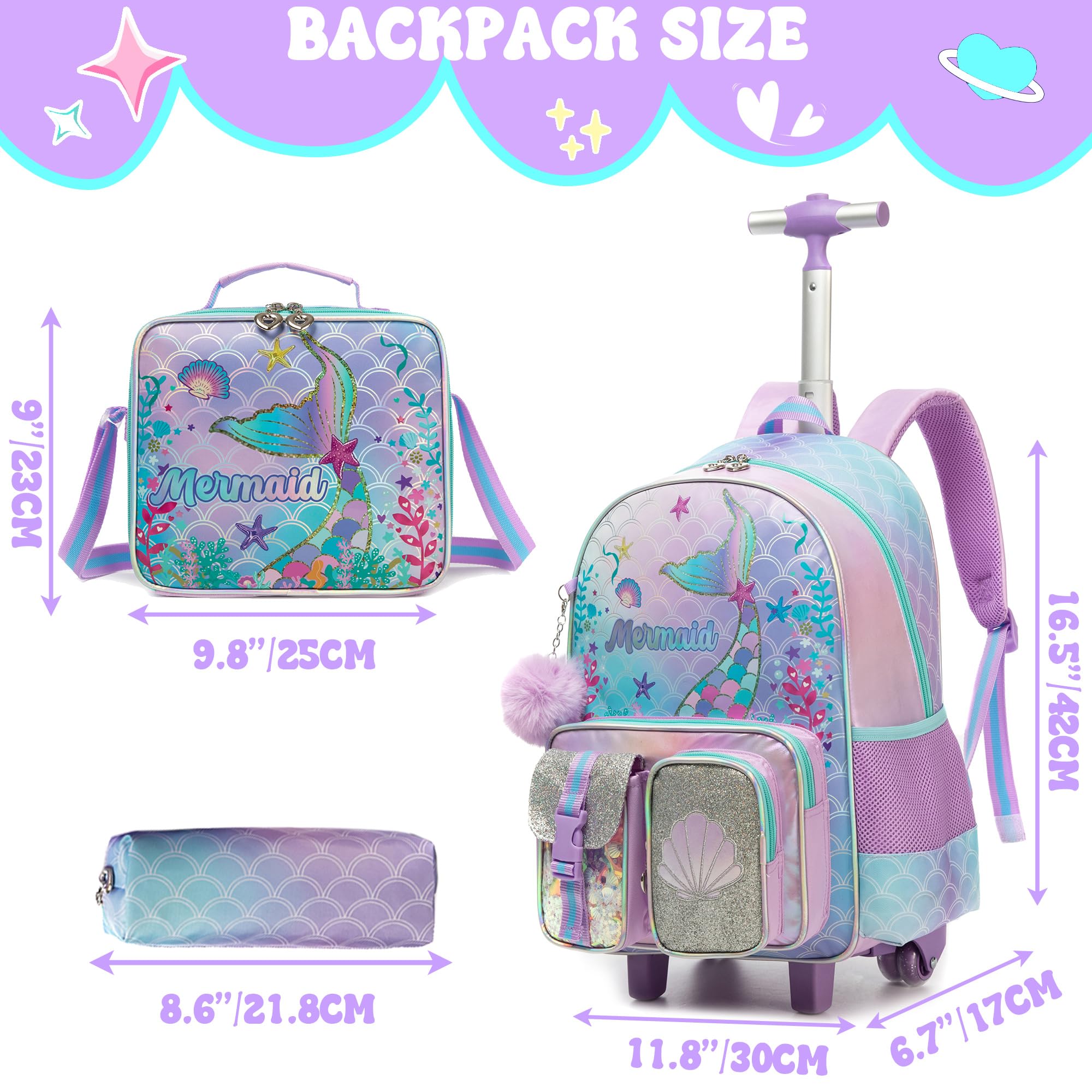 [Girls Rolling Backpack Large Capacity]The backpack main compartment contains laptop pocket,fits for 15.6" laptop, iPad, folders, A4 magazines, books, wallet, kawaii dolls;Front small pockets fits for notebook,keys,snacks or anything else you need in your daily life.2 side mesh pocket fit for bottle and umbrella.