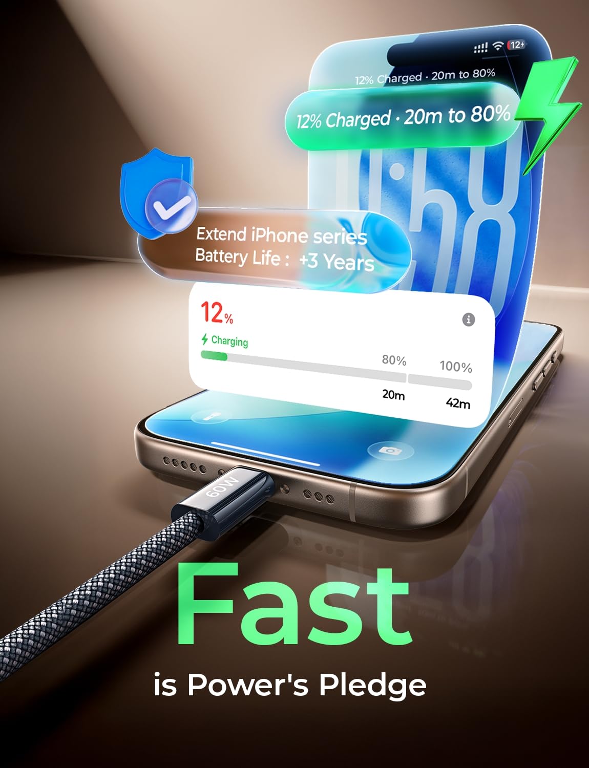 【60W Turbo Fast Charging】This cord for iphone 16e charger fast charging support PD3.0/QC3.0/QC4.0 fast charging up to 60W Max (20V/3A) with USB-C Power Delivery adapters such as 30W/45W/60W. Which 2.2X faster than 3.1A version and charges USB C Phone from 0% to 80% within 35 minutes, iPad Pro 64% within 35 minutes, Macbook air 50% within 35 minutes, and data transfer speeds up to 480Mbps (1200 songs synced per minute) compatible with Samsung,Tablt,iPad Air Mini Pro,Macbook and More.